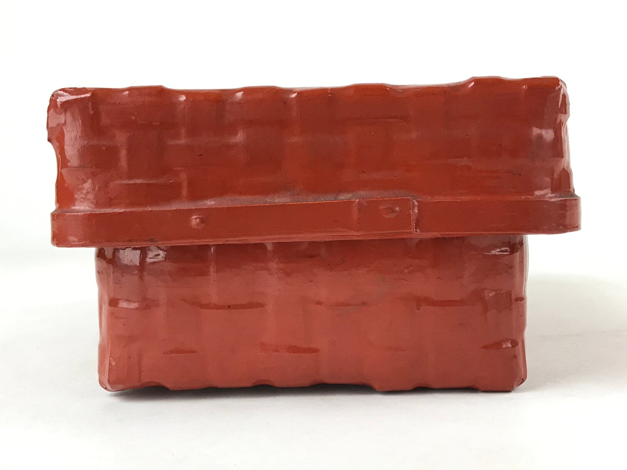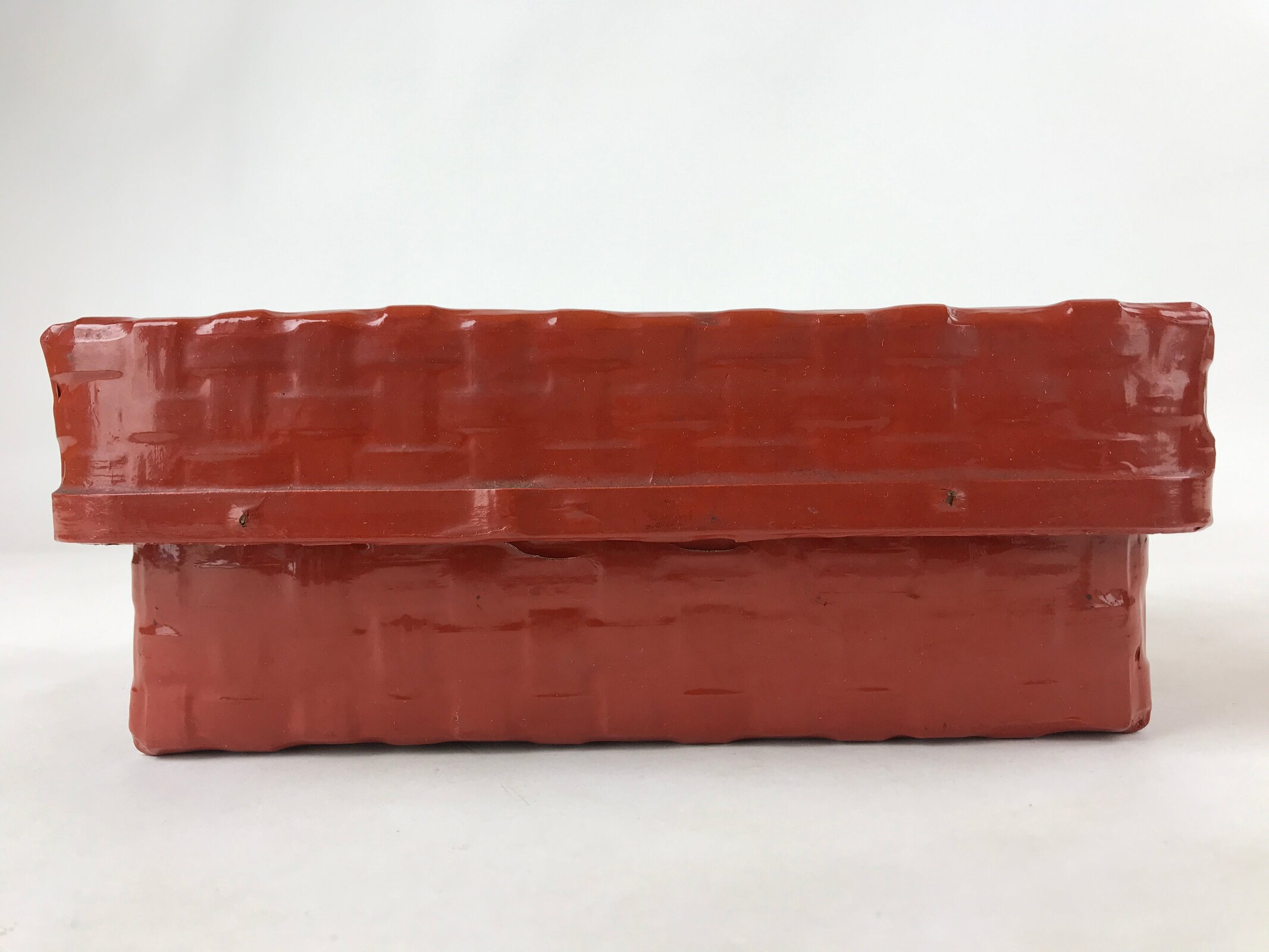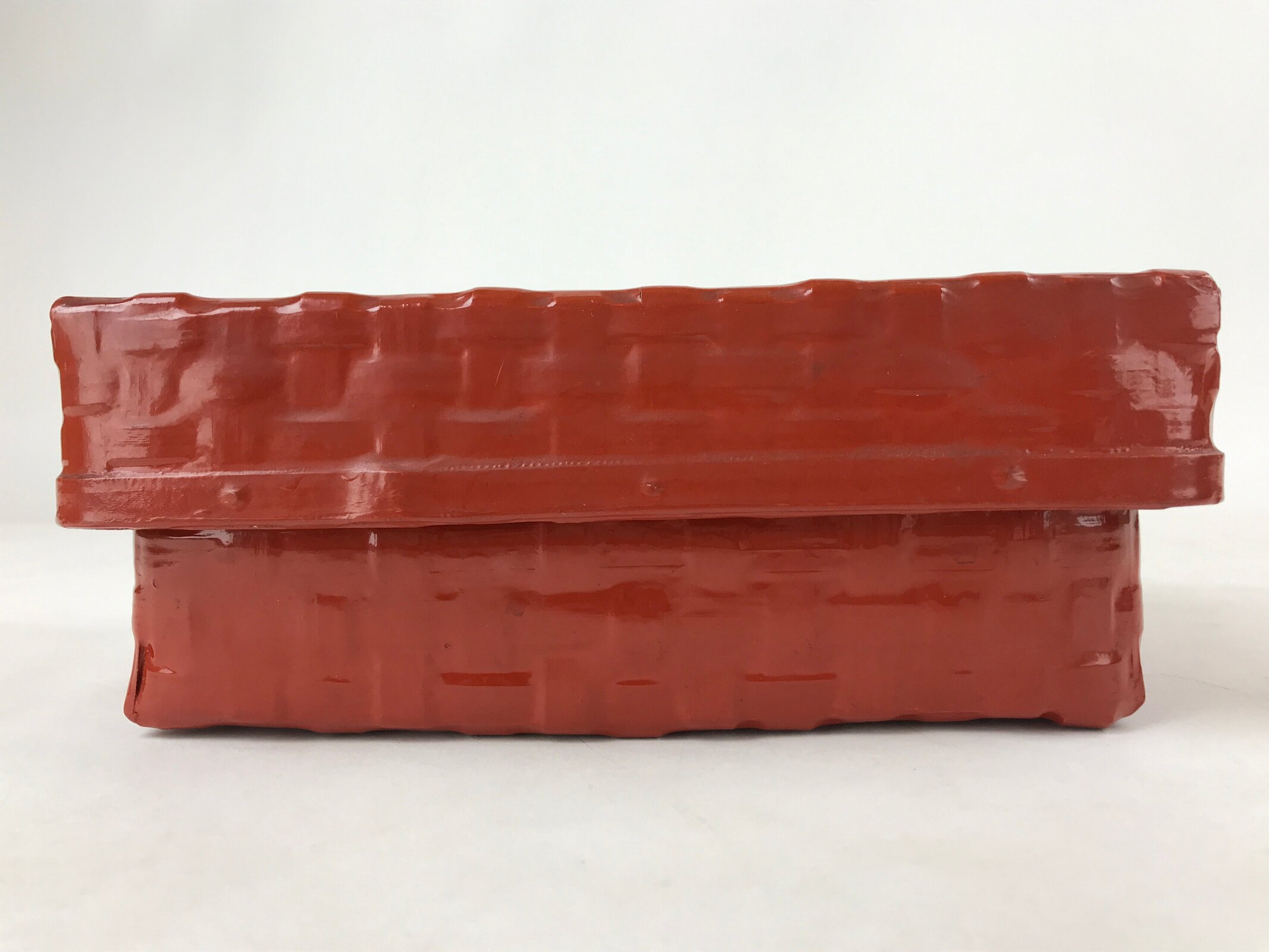 This is a Japanese rectangular box made of woven strips of bamboo and lacquered with a striking red color. It has a loosely fitted lid that can be used as a small tray. Inside it is lined with shimmering beige washi paper. This small lidded box is an excellent size to store small items such as craft or stationary materials, cosmetics, jewelry, or other trinkets.