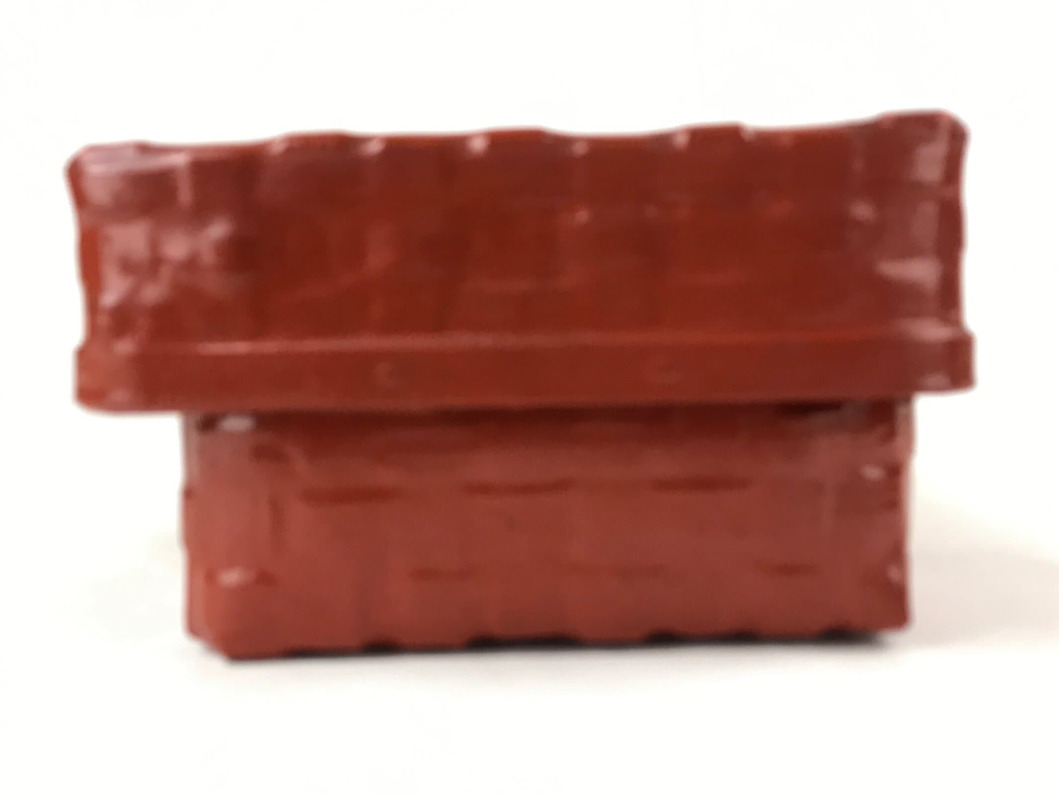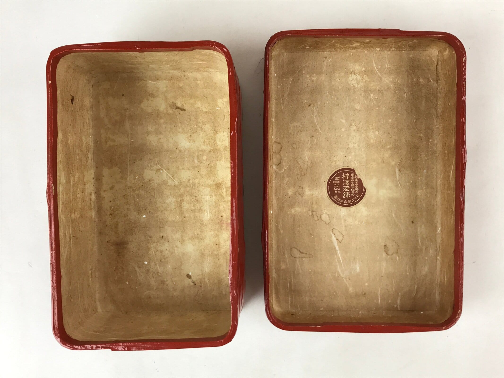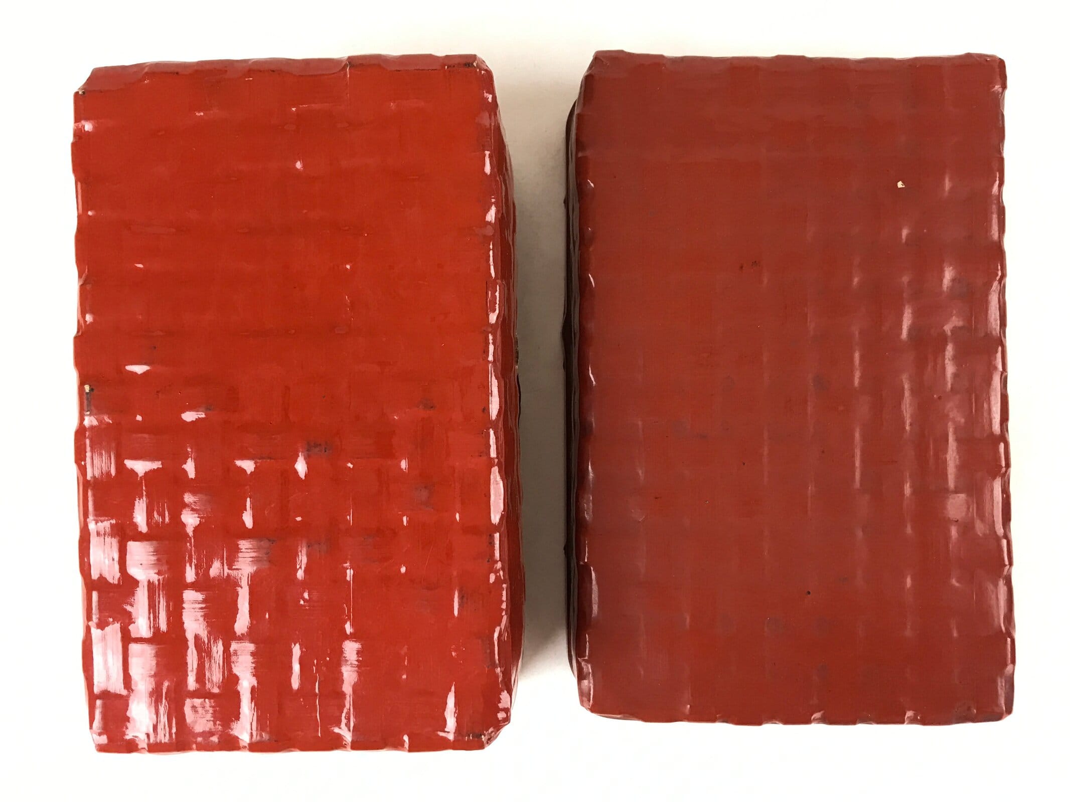 This is a Japanese rectangular box made of woven strips of bamboo and lacquered with a striking red color. It has a loosely fitted lid that can be used as a small tray. Inside it is lined with shimmering beige washi paper. This small lidded box is an excellent size to store small items such as craft or stationary materials, cosmetics, jewelry, or other trinkets.