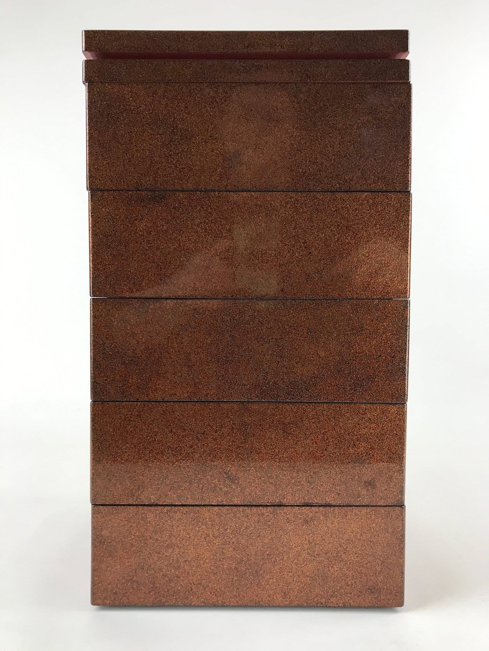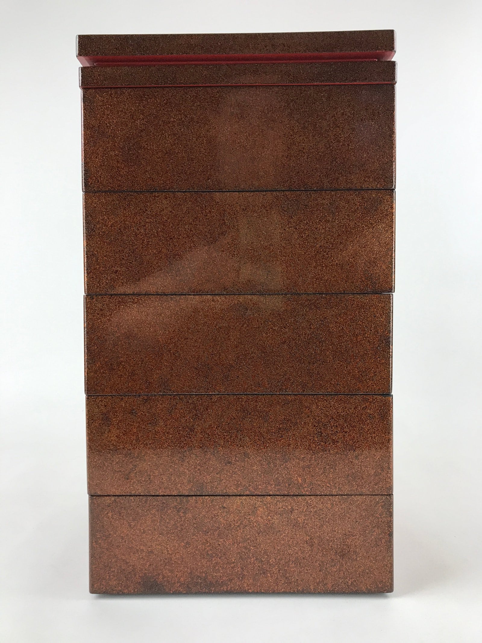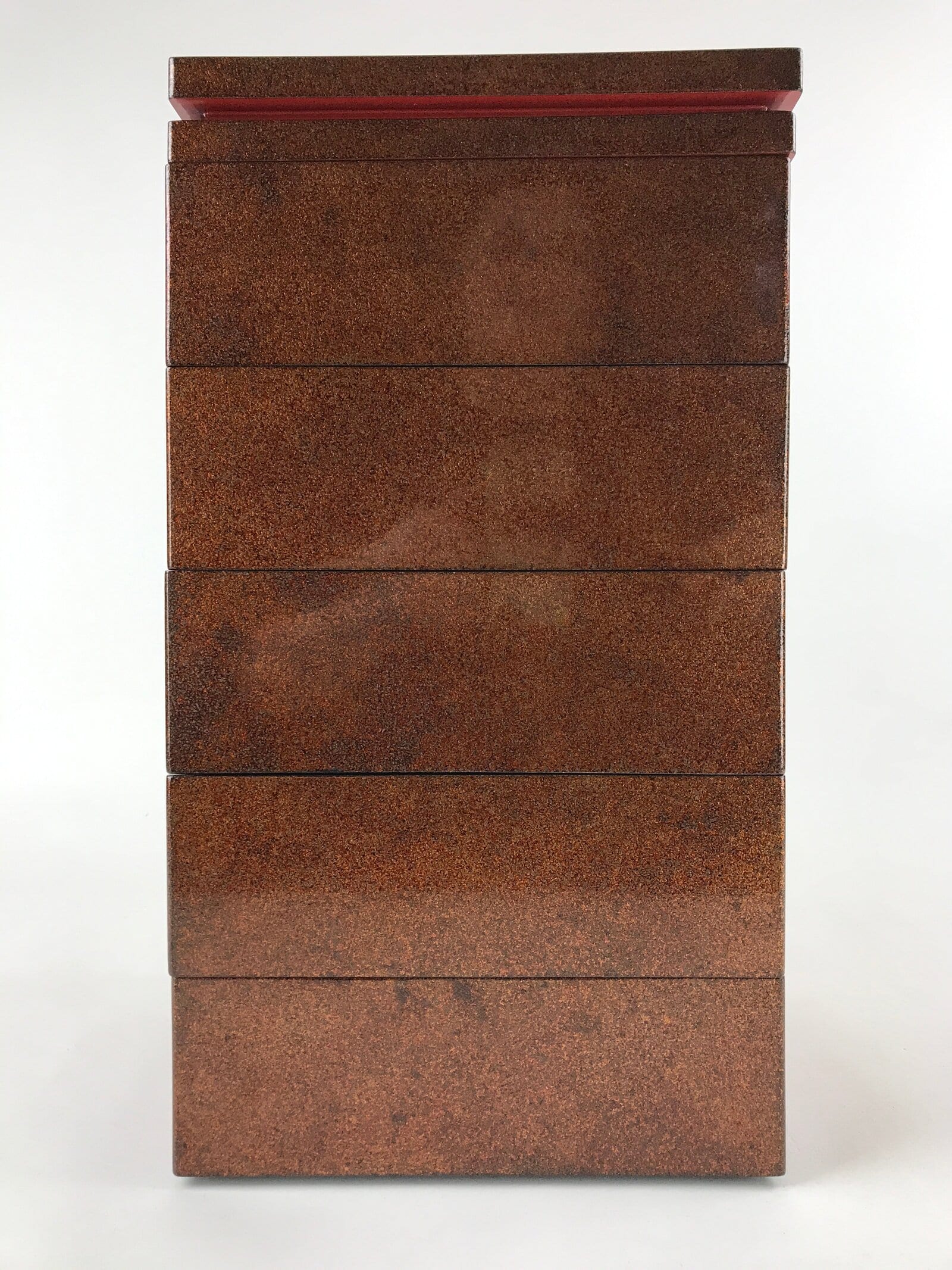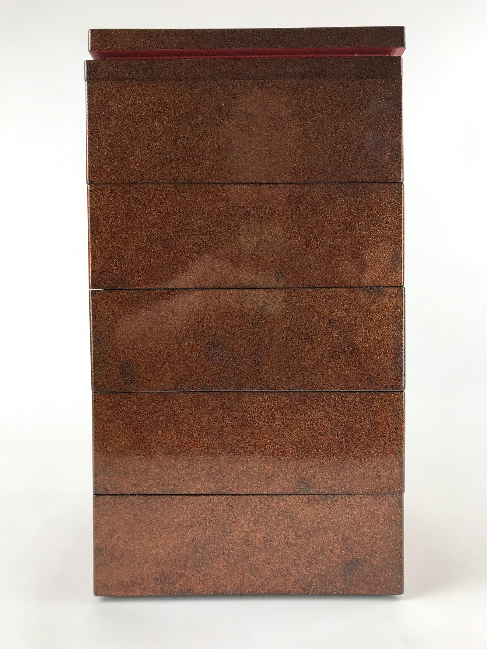 This is a Japanese vintage lacquered wooden five-tier lunch box (Jubako). The box is red on the inside, black on the bottom, and has a speckled brown, red and black pattern on the outside. This lunch box has an extra lid so it can be used as two lunch boxes. It comes in a brushed lacquer wooden storage box that opens from the front thanks to a panel that slides up completely. The front panel has a character painted on it, possibly the former owner’s name. This storage box has metal protective parts on the corners and two metal handles to carry it. There is a drawer inside the storage box to store the extra lid.