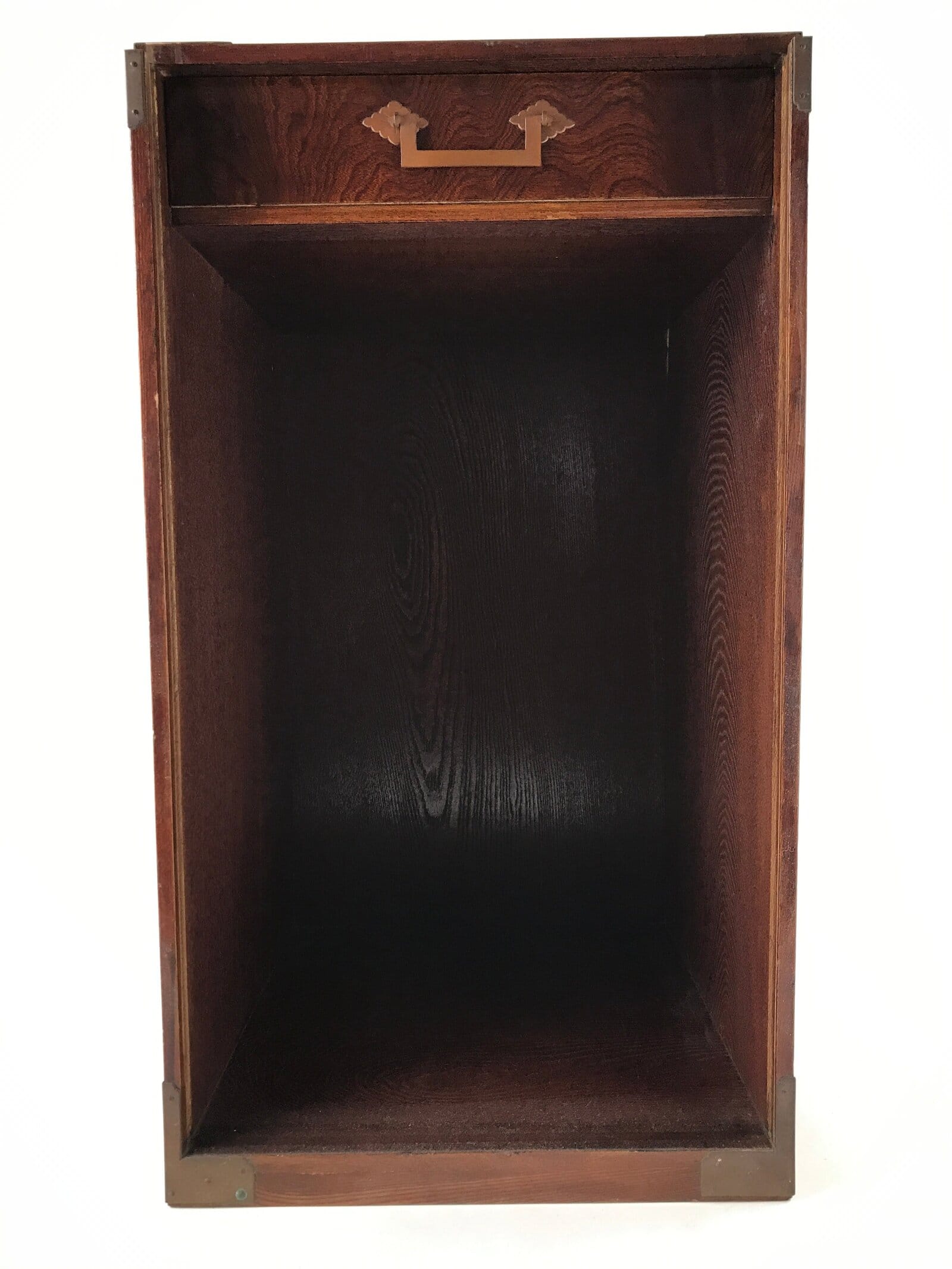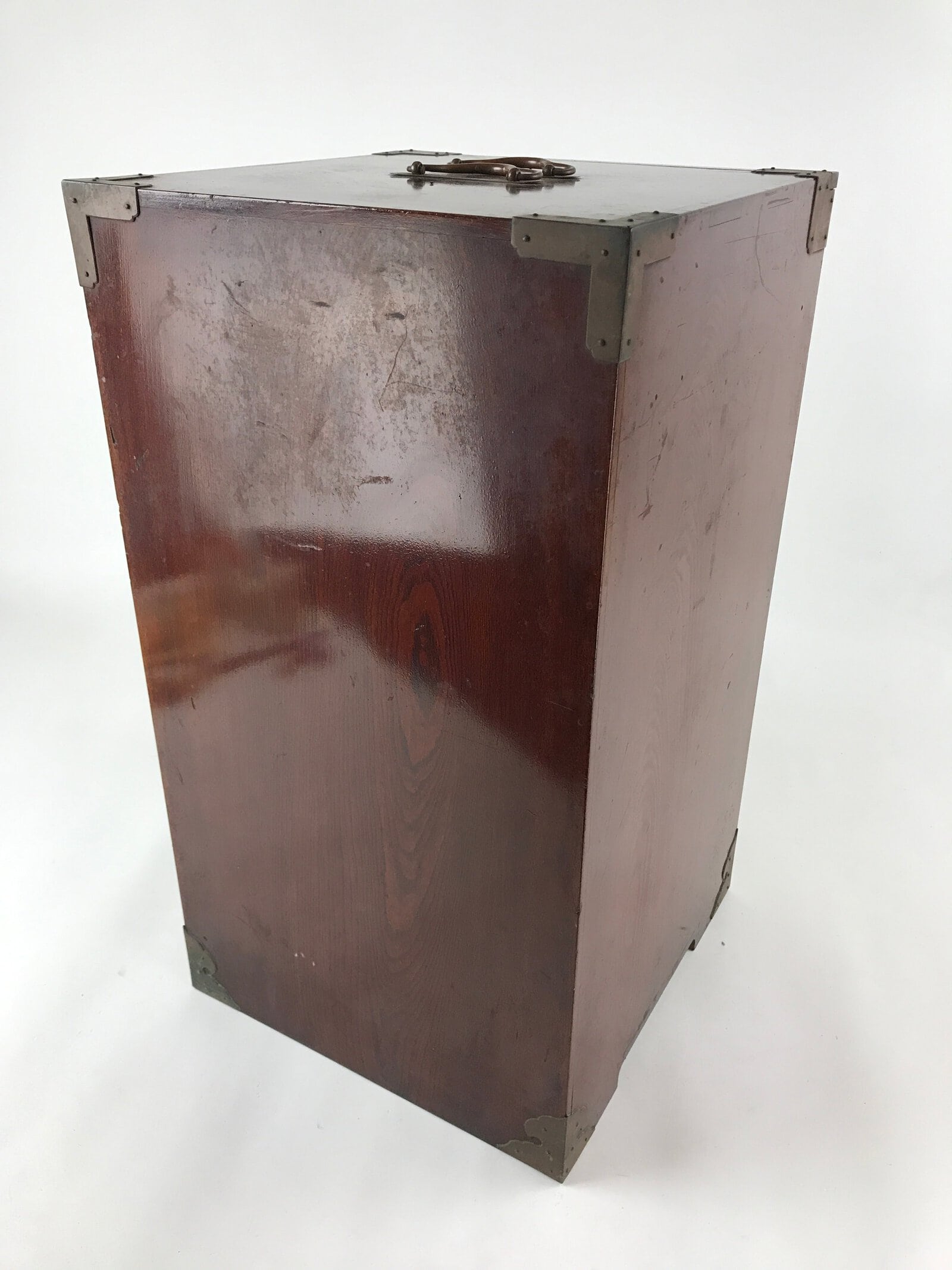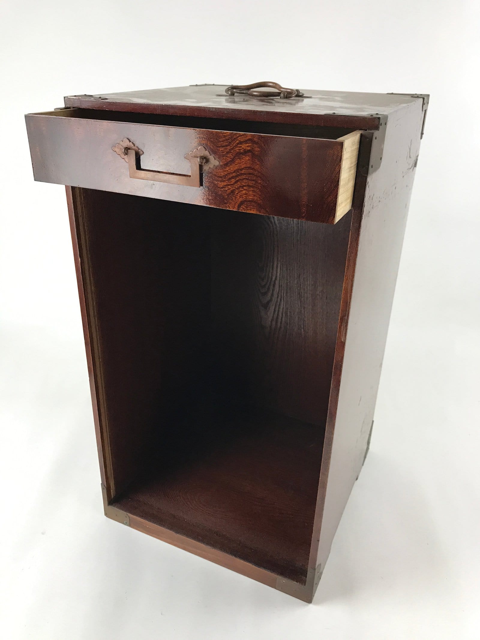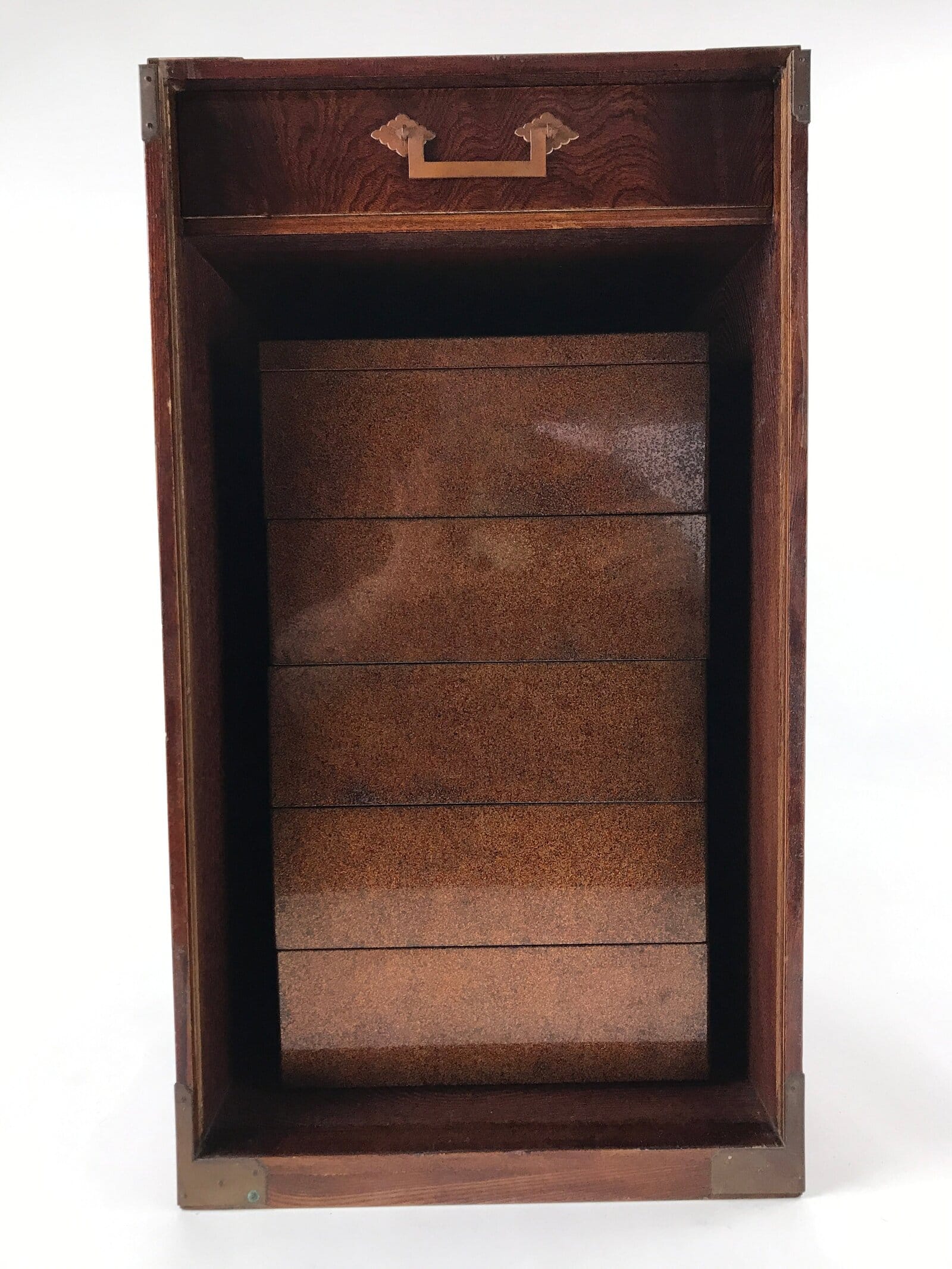 This is a Japanese vintage lacquered wooden five-tier lunch box (Jubako). The box is red on the inside, black on the bottom, and has a speckled brown, red and black pattern on the outside. This lunch box has an extra lid so it can be used as two lunch boxes. It comes in a brushed lacquer wooden storage box that opens from the front thanks to a panel that slides up completely. The front panel has a character painted on it, possibly the former owner’s name. This storage box has metal protective parts on the corners and two metal handles to carry it. There is a drawer inside the storage box to store the extra lid.