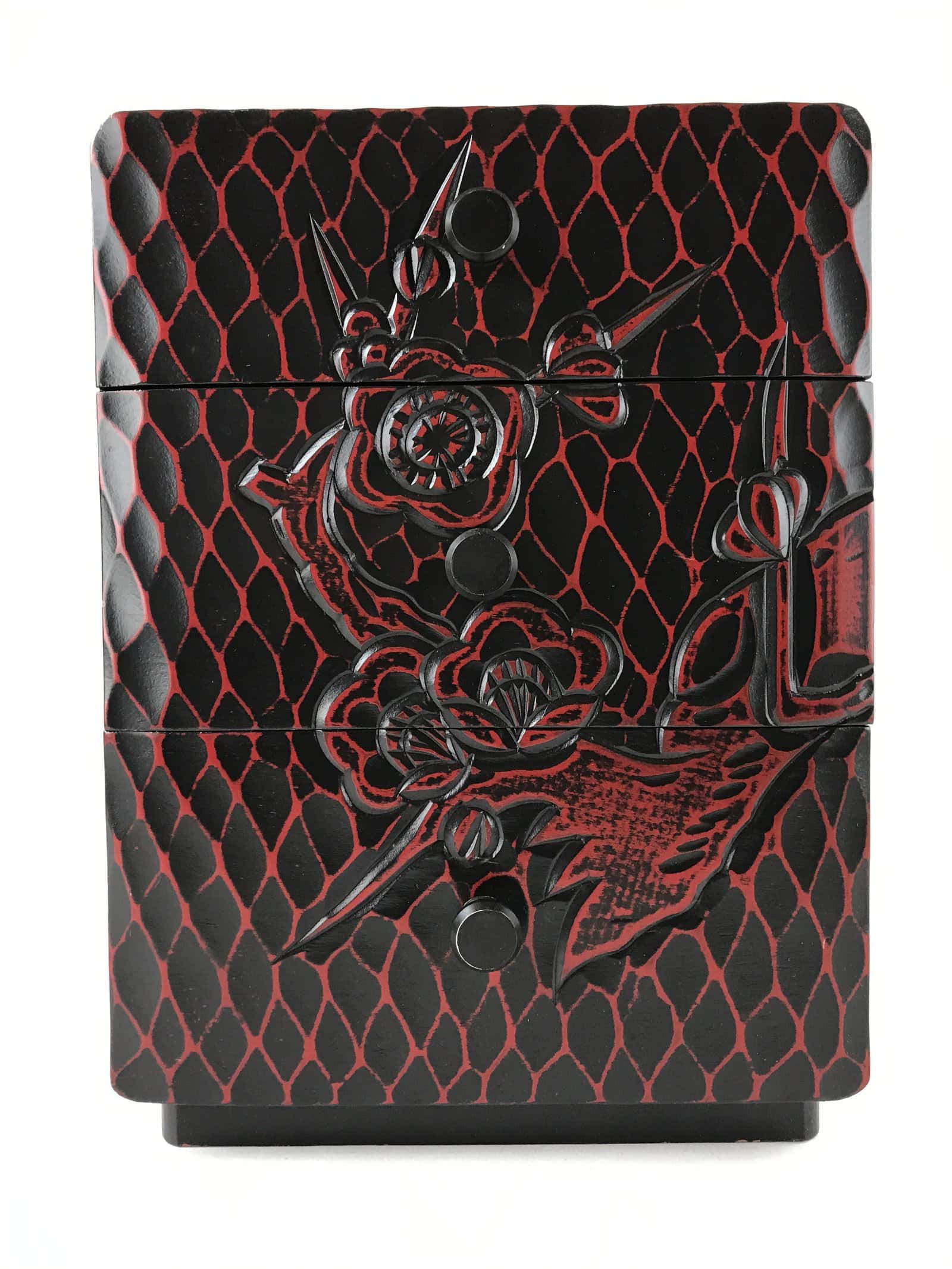 This is a Japanese sewing box, also called haribako. Coated with a striking deep reddish-brown lacquer in kamakurabori style, it is decorated with bold hand-carved plum blossoms (ume) and leaves. It has 3 different size drawers (with one wooden insert) with simple wooden knob hardware. This beautiful tansu chest can also be used for storing sewing supplies, jewelry, or other trinkets.