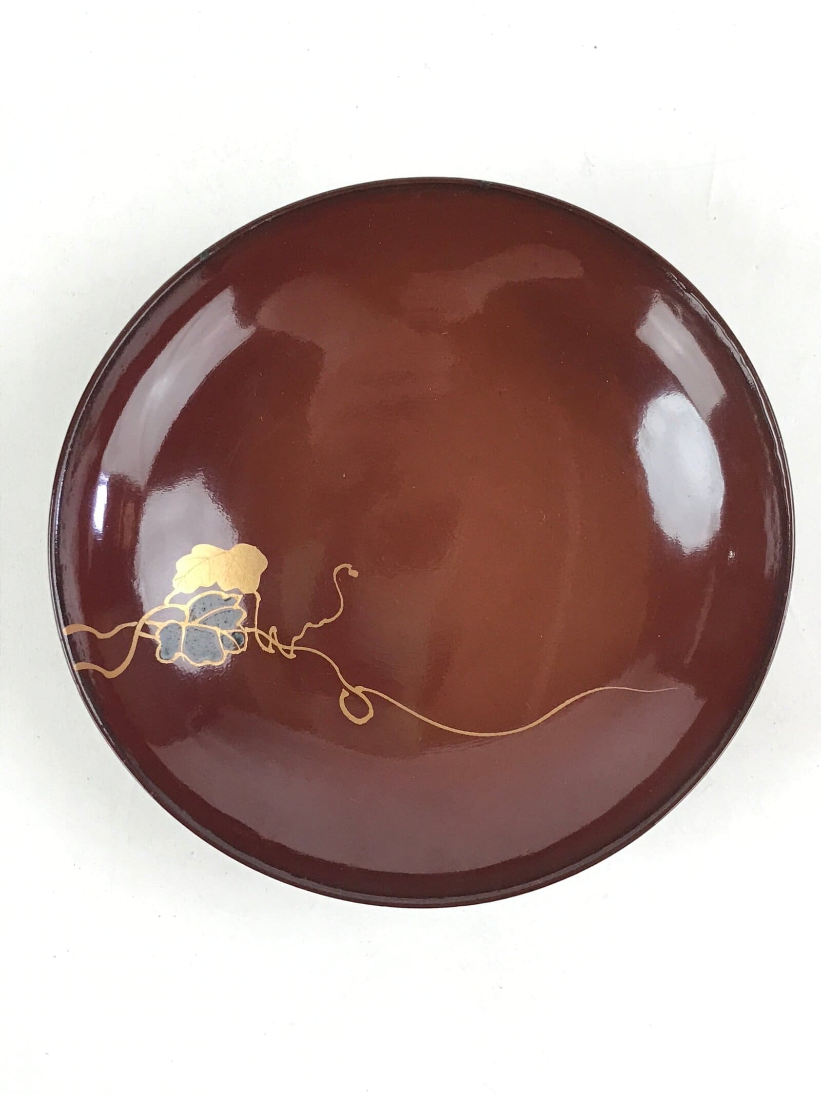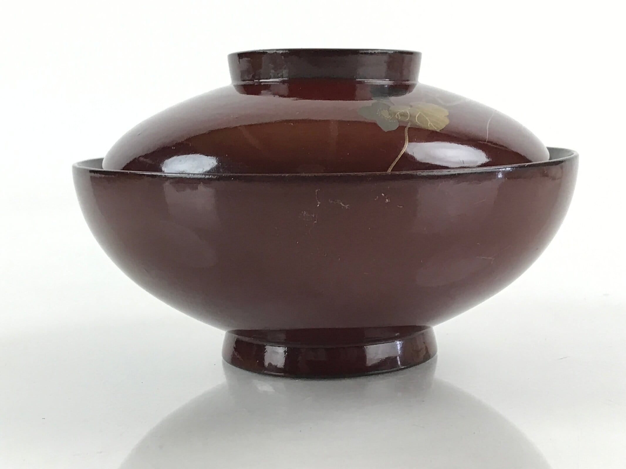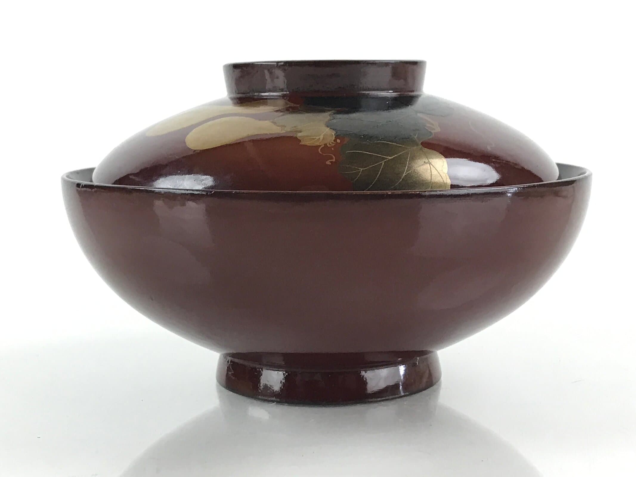 A deep red, almost brown, with a handpainted makie image of a vine of hyotan (gourds) in green and gold, this vintage lacquered wooden bowl with lid is a beautifully decorative addition to any traditional Japanese dinnerware set. This particular bowl is considered a nimonowan, a bowl made for boiled main dishes such as vegetables, fish, and sometimes tofu. It can also be used for soups and rice.