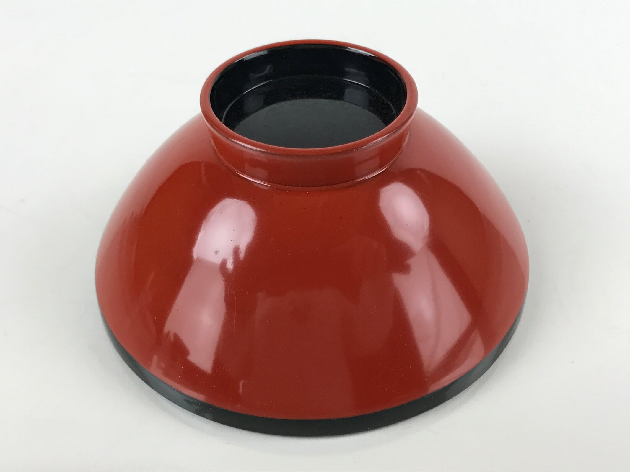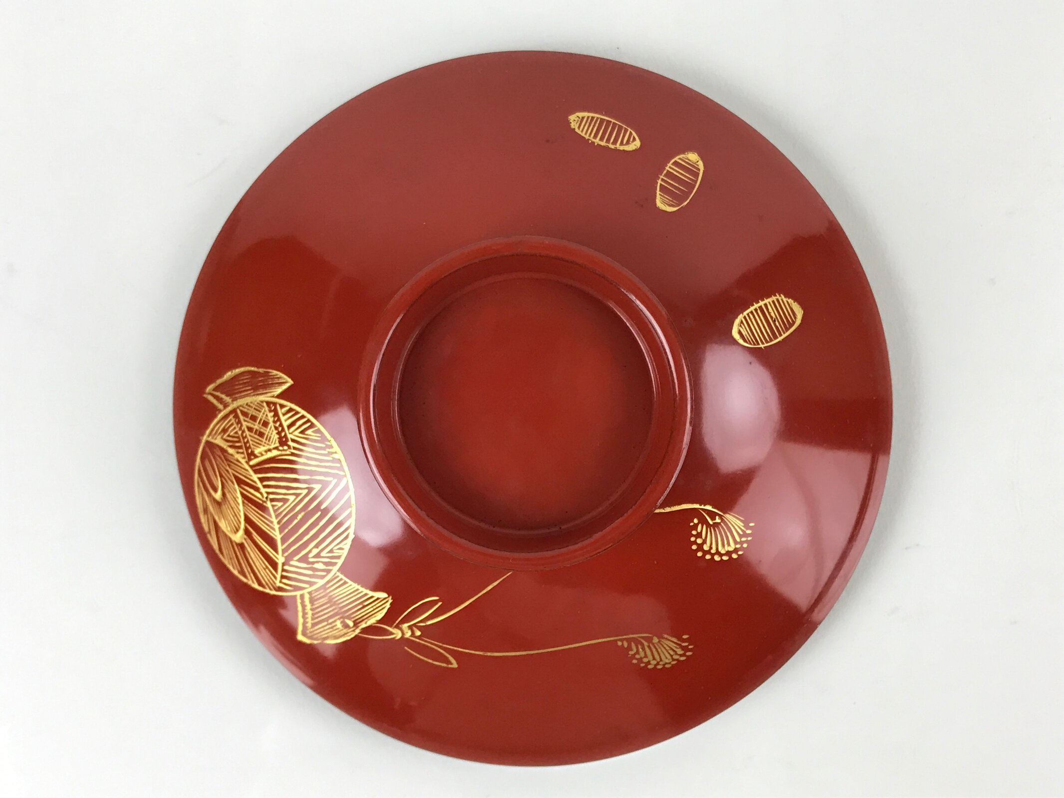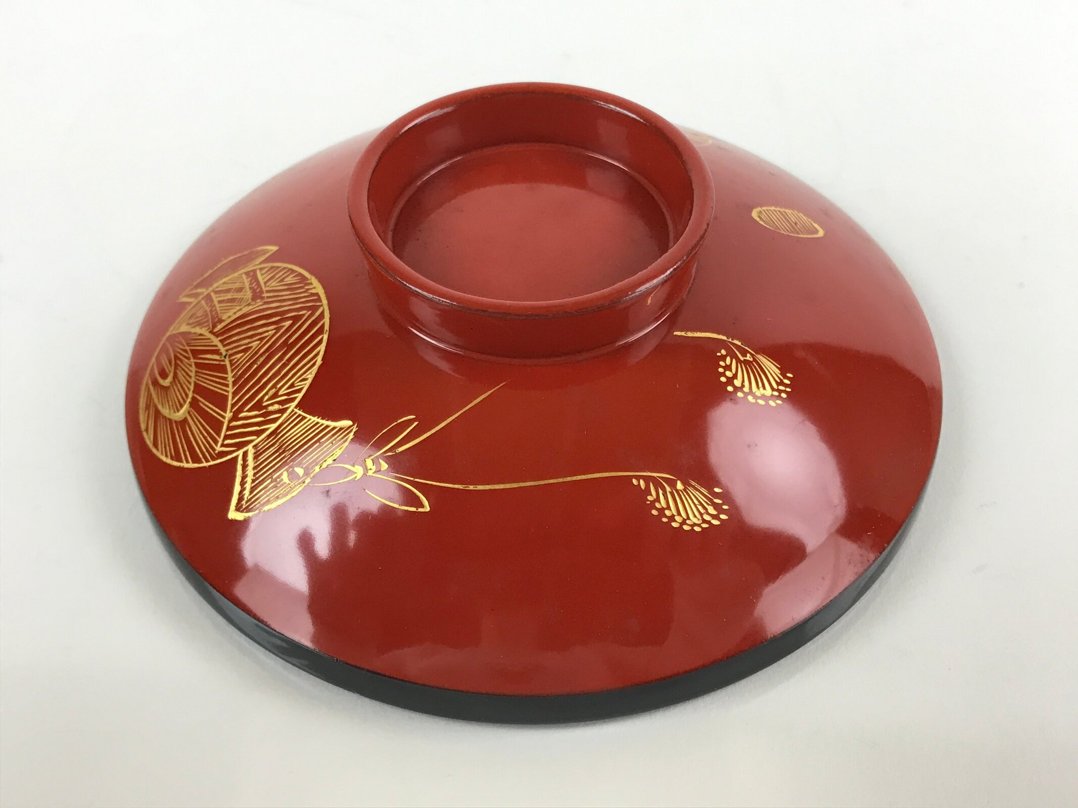 A bright red with black a black inside and outer rim, this vintage lacquered wooden bowl with lid is a beautifully decorative addition to any traditional Japanese dinnerware set. The main feature of this bown is the painted makie gold designs on the lid both inside and out. There is a large lucky magic hammer (tool often depicted with Daikokuten, one of the 7 Lucky Gods) as well as some koban gold coins. This particular bowl is considered a nimonowan, a bowl made for boiled main dishes such as vegetables, fish, and sometimes tofu. It can also be used for soups and rice.