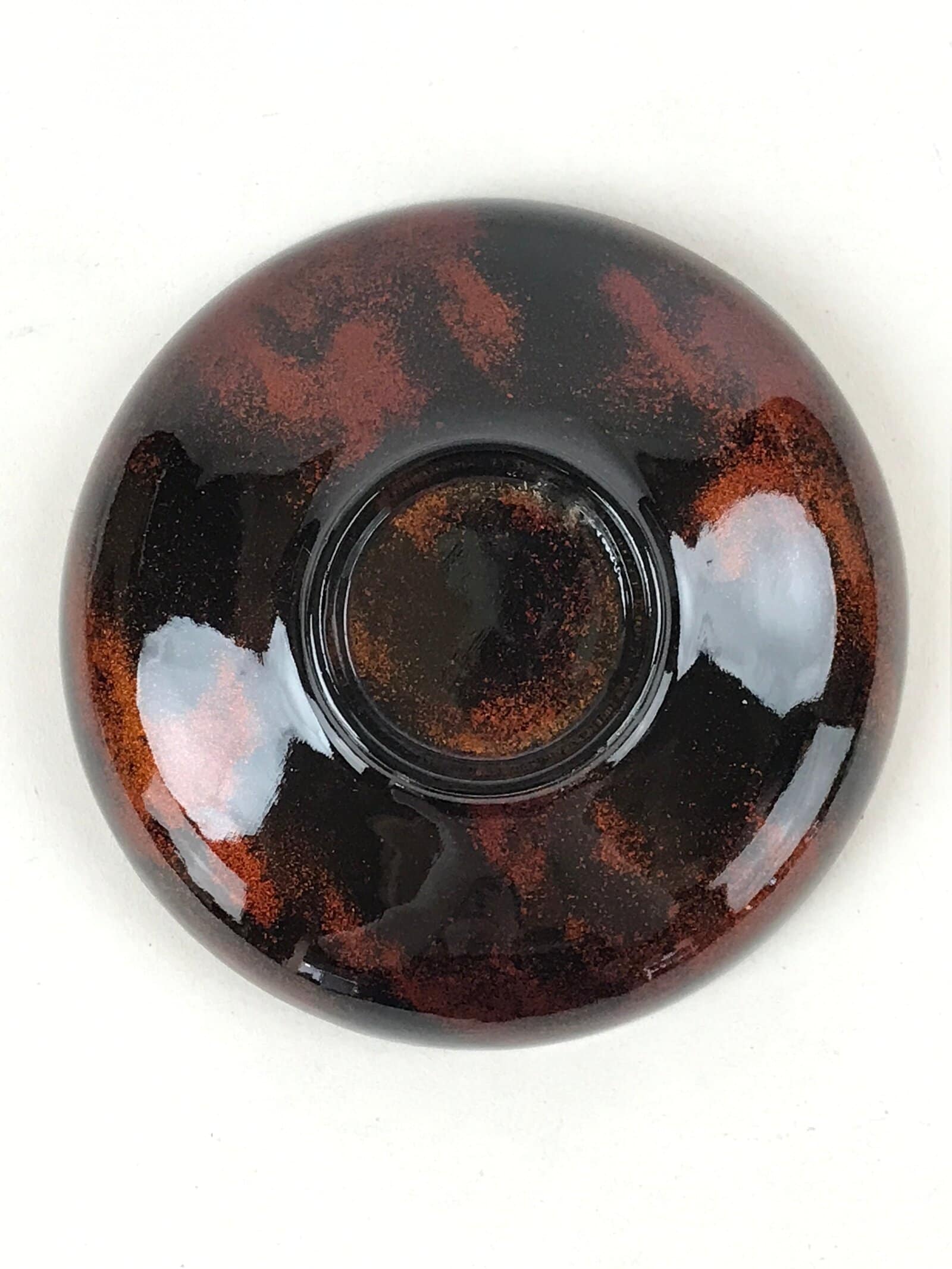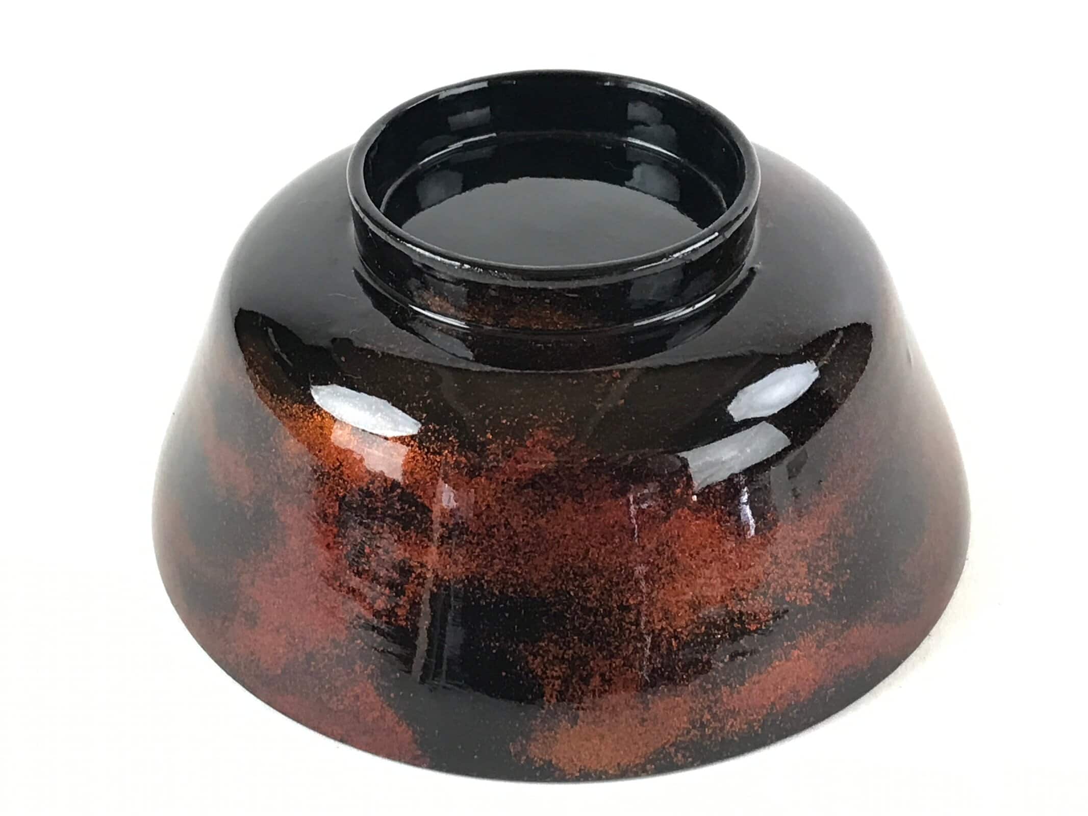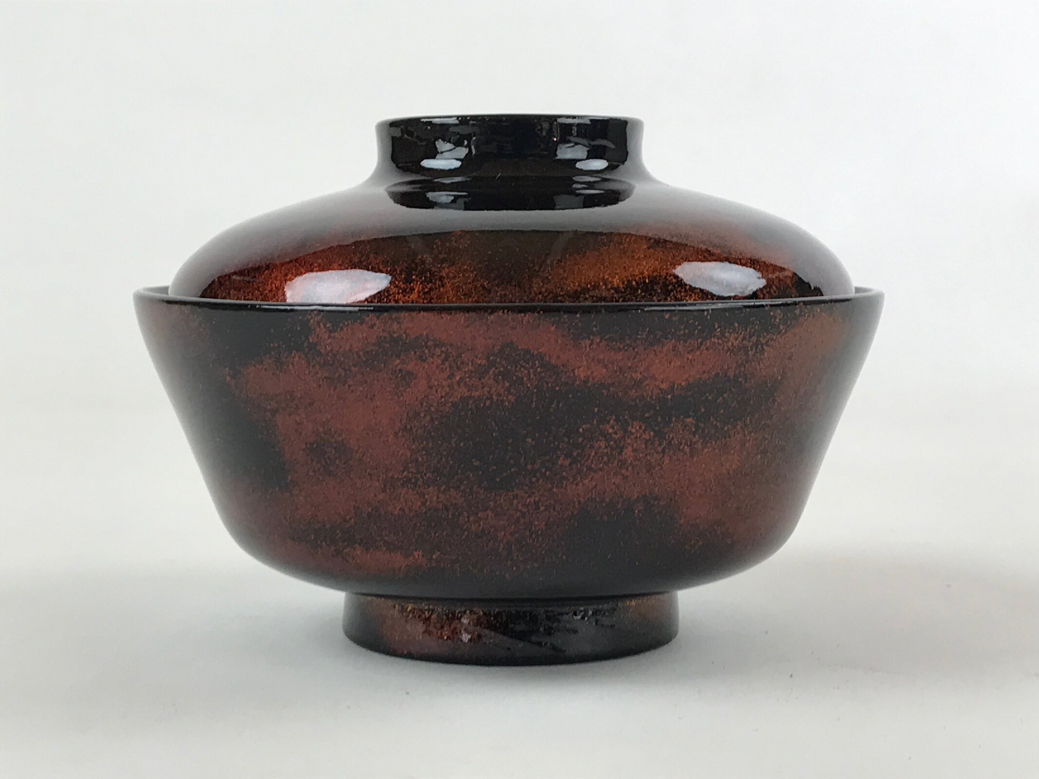 A deep glossy black with a dusted glittery copper-orange accent, this vintage lacquered wooden bowl with lid is a beautifully decorative addition to any traditional Japanese dinnerware set. This particular bowl is considered a nimonowan, a bowl made for boiled main dishes such as vegetables, fish, and sometimes tofu. It can also be used for soups and rice.