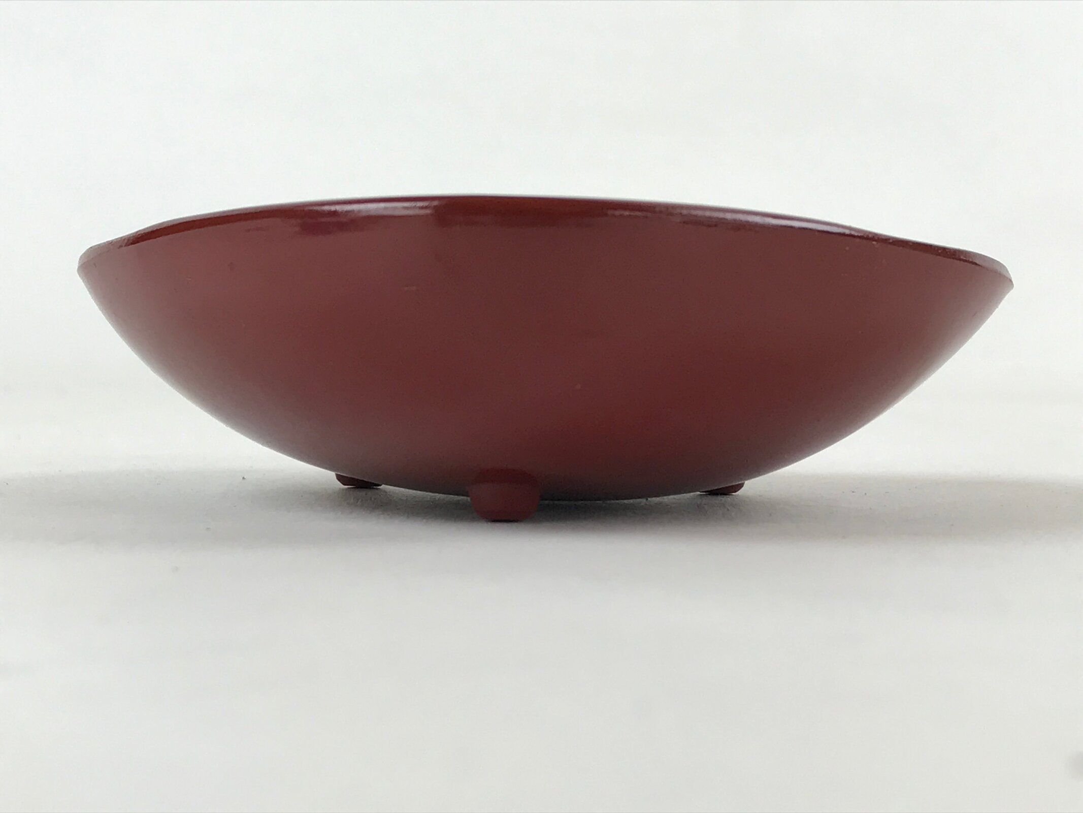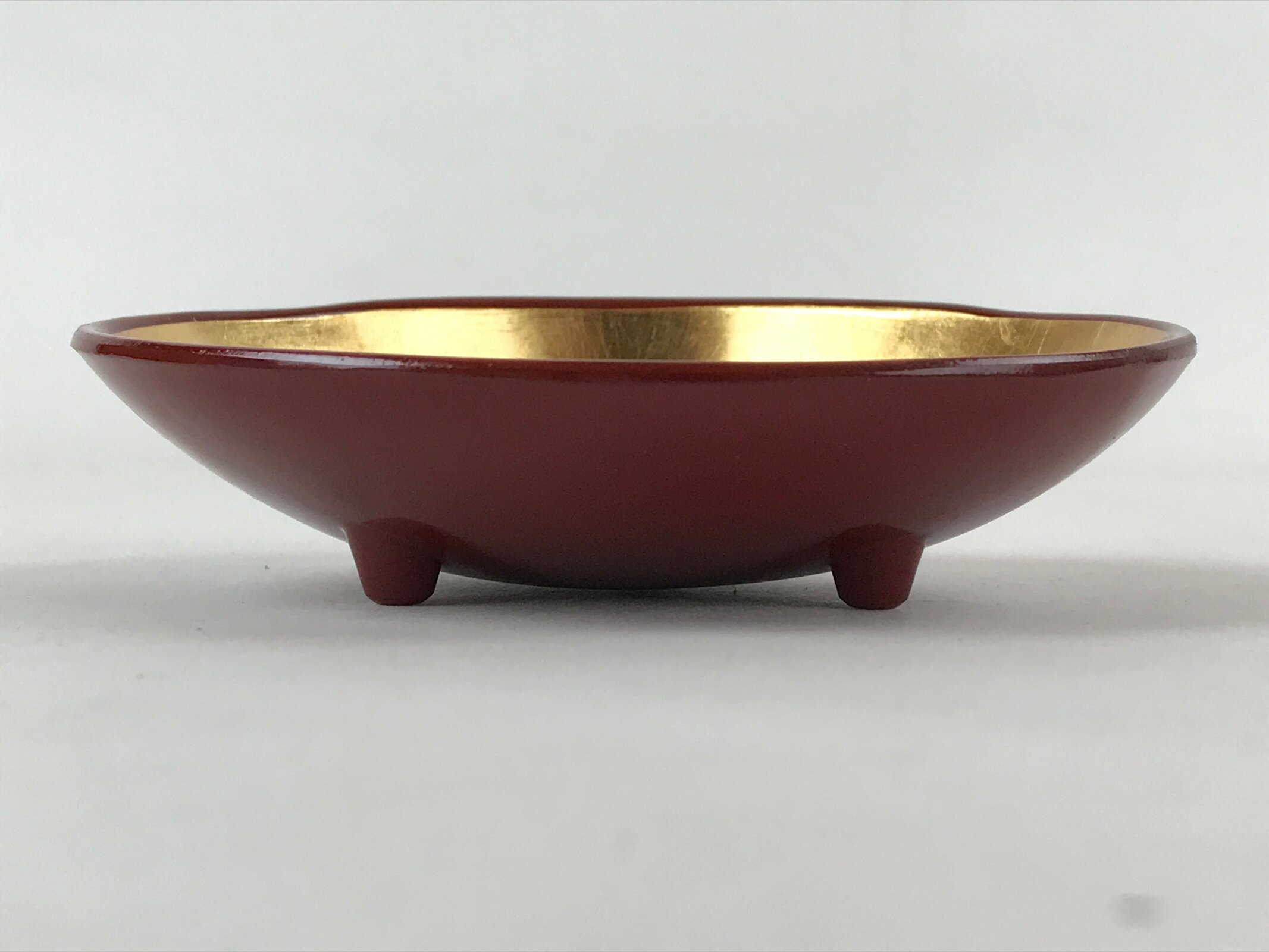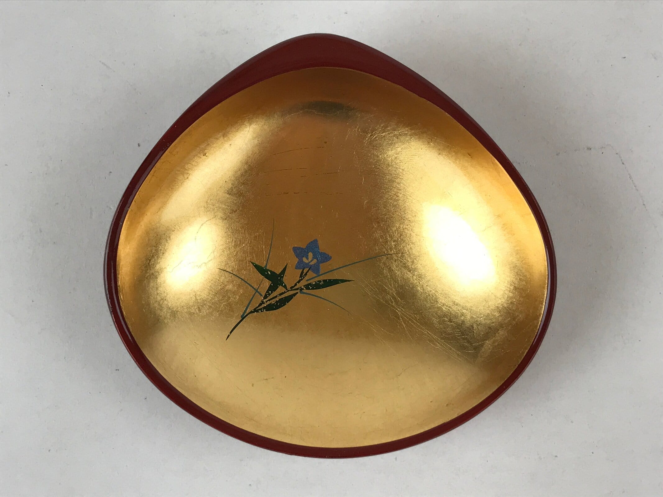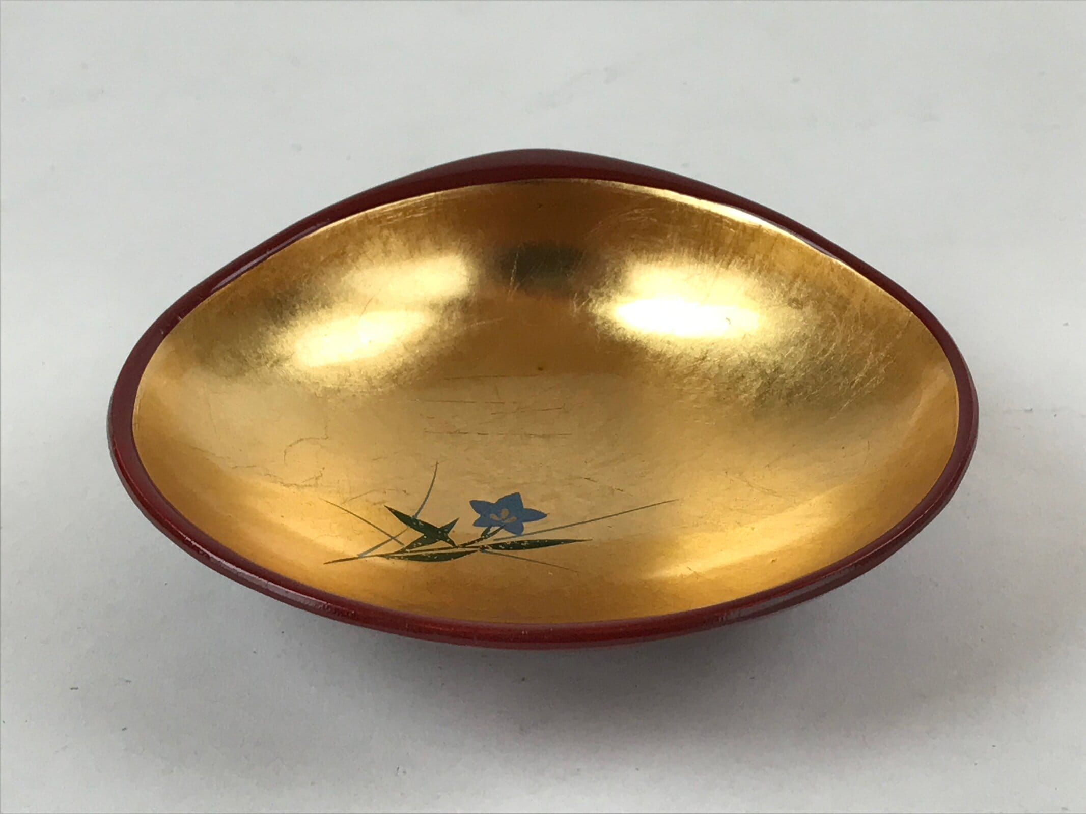 This is a vintage Japanese resin lacquerware replica bowl made for holding small items like trinkets and jewelry or for serving traditional sweets. It is gilt gold on the inside with a simple blue and green morning glory (asagao) floral design, and a deep red on the outside. It is a unique clam shell shape and stands steady on three small legs.