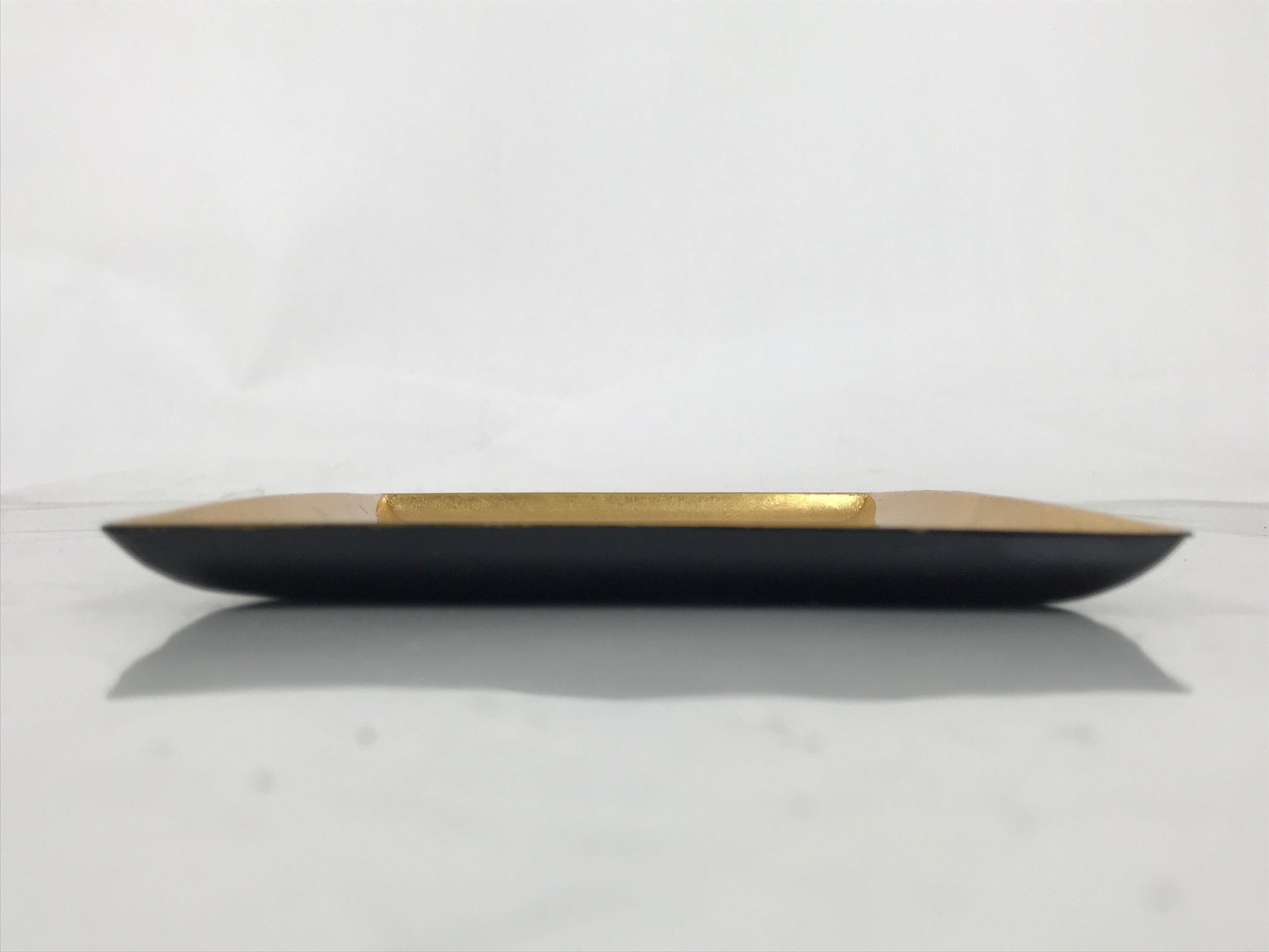 This is a vintage Japanese resin lacquer replica decorative tray, or Obon. It is small and the perfect size for jewelry, key, small trinkets, and also can be used as a money tray. A glossy black on the back side, this tray’s top side is decorated with gold leaf and hand-painted purple and green irises (hanashoubu). The gold leaf surface is secured with a clear lacquer coating. It comes in a white paper box.