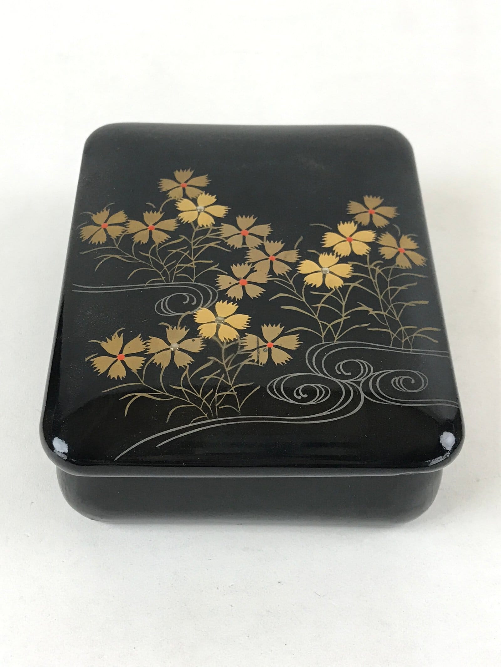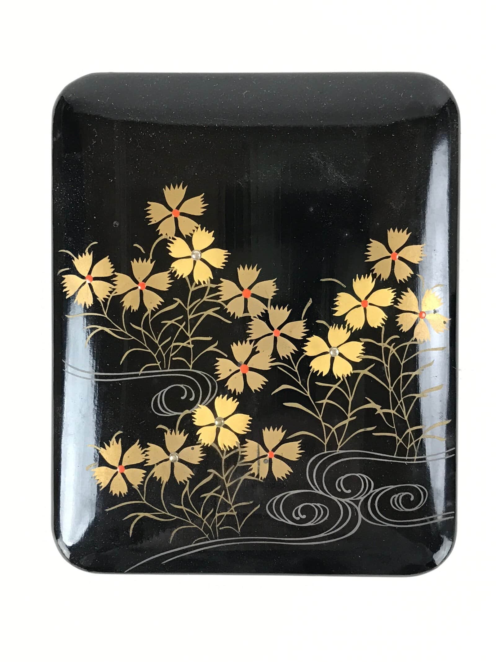 This is a vintage Japanese lacquered wooden box with a lid. This small, rectangular box is black with a makie picture of gold and red cornflowers on the lid. It has elegant round corners.