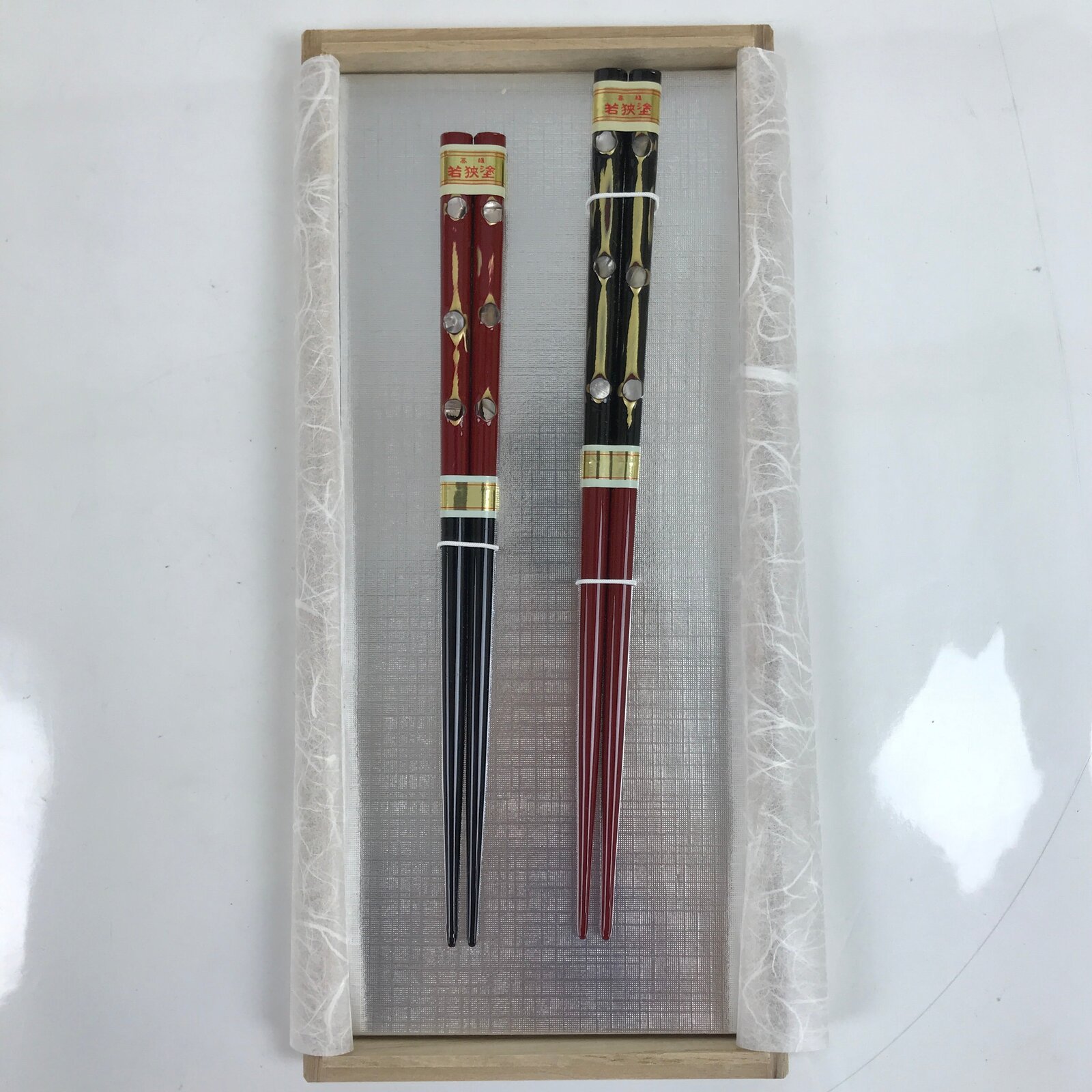 Japanese Lacquered Wooden Chopstick Pair Set Vtg Wakasa Raden Red Black L297