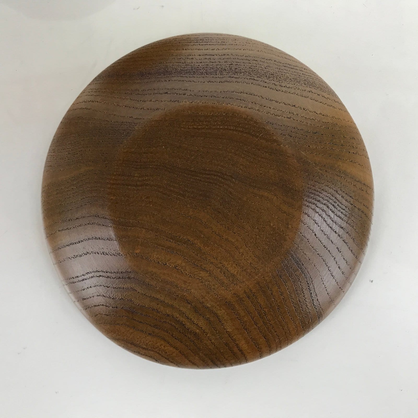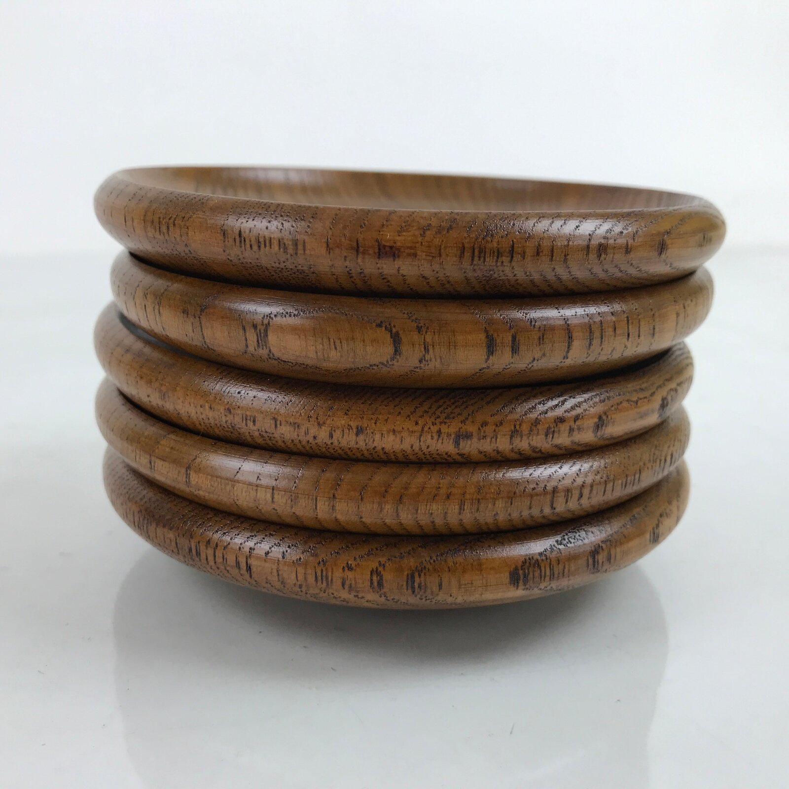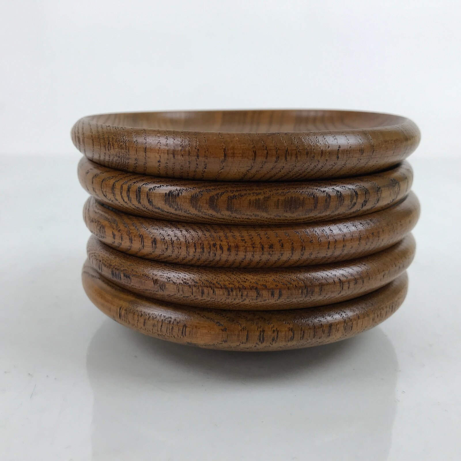 This is a five-piece set of vintage Japanese wooden lacquered drink saucers/coasters, or chataku. Stained a medium brown and brushed with a clear lacquer coating, this easily stackable set is a simple, classic style. It has a ringed indentation at the center to keep a cup from slipping off. The original box is included.