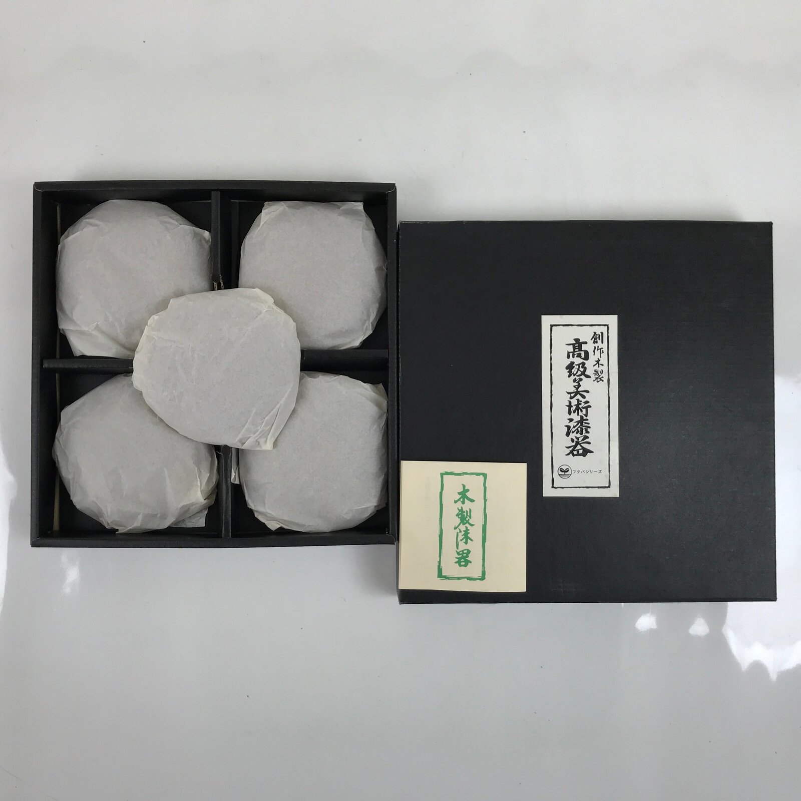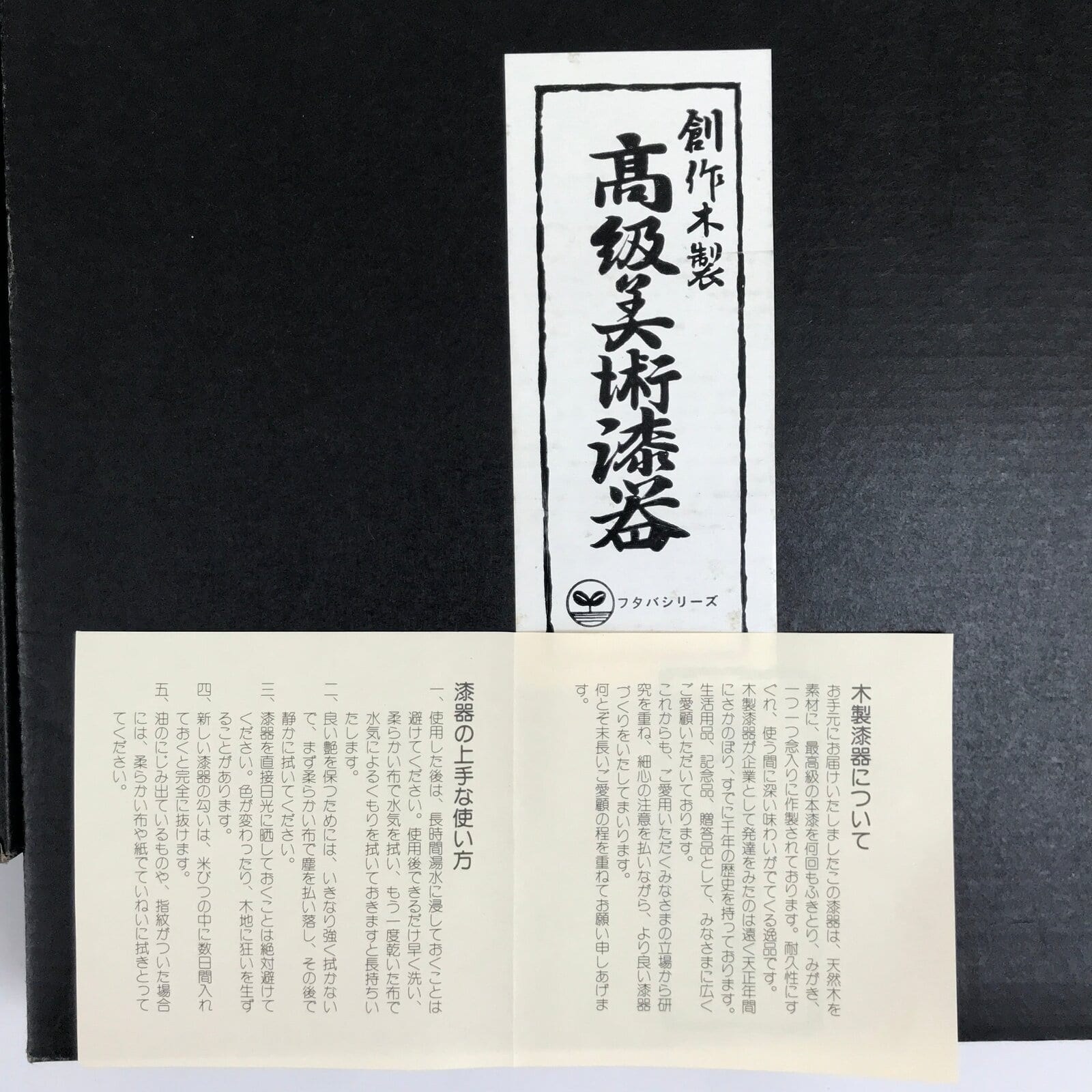 - Kanji on box: Creative wooden high-grade artistic lacquerware, Futaba series,