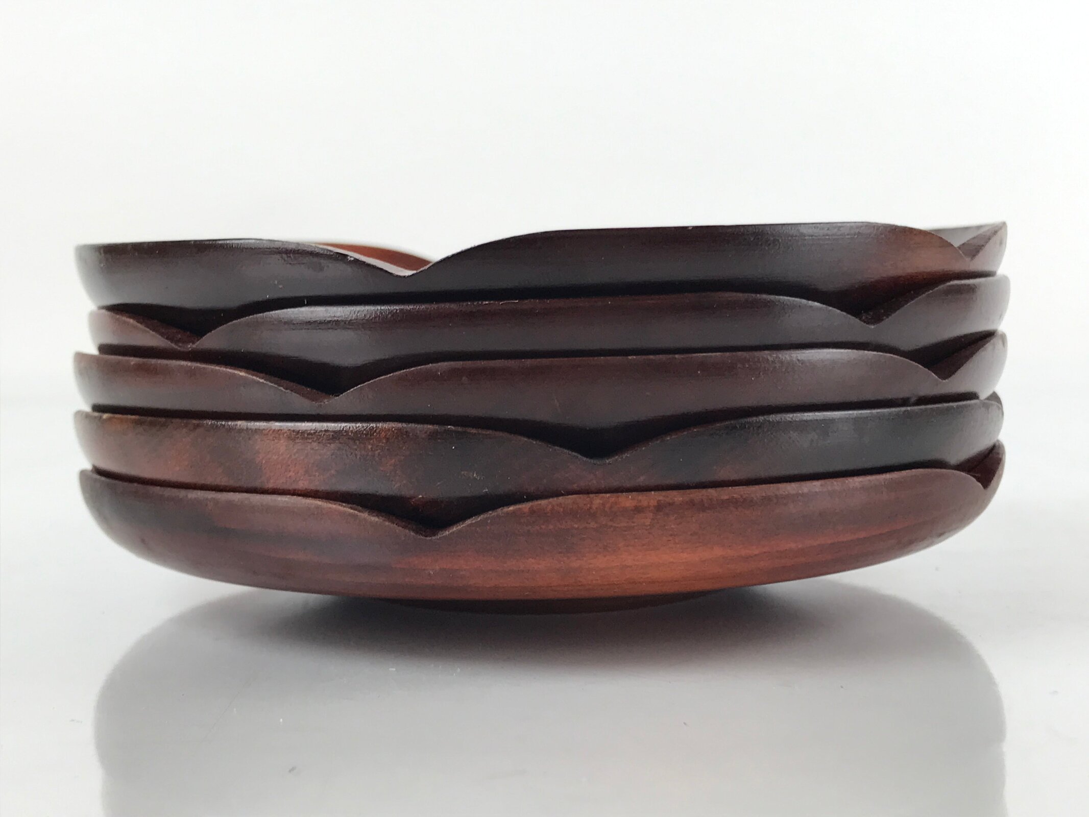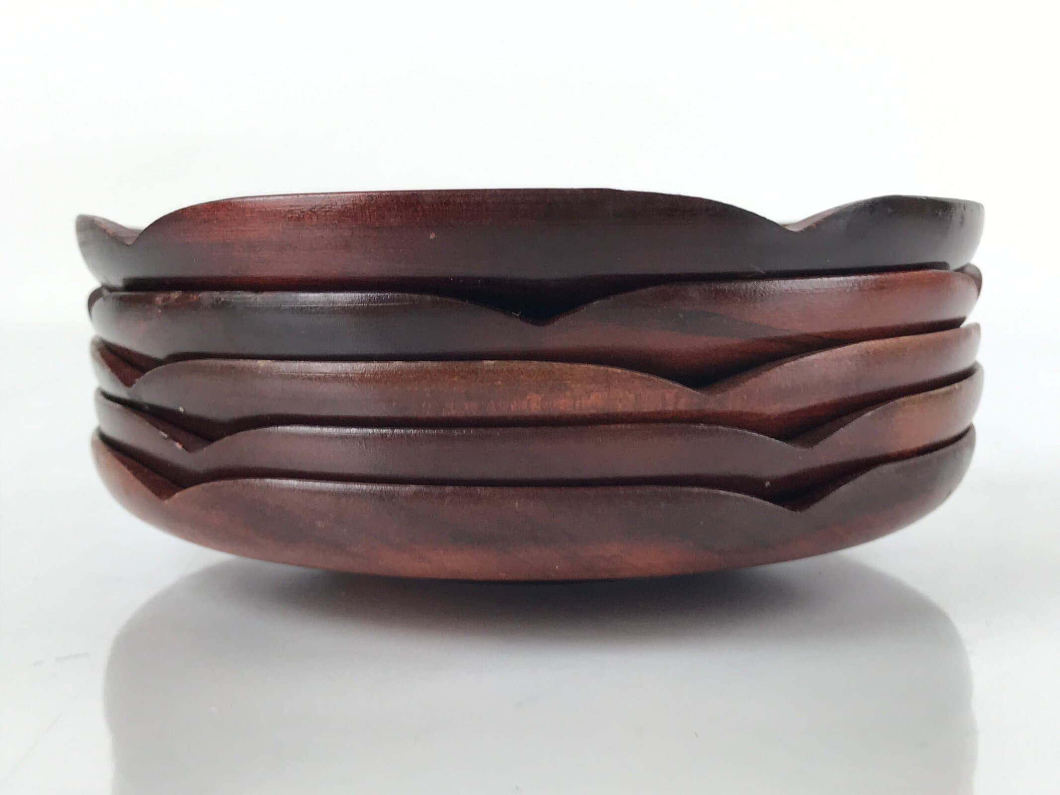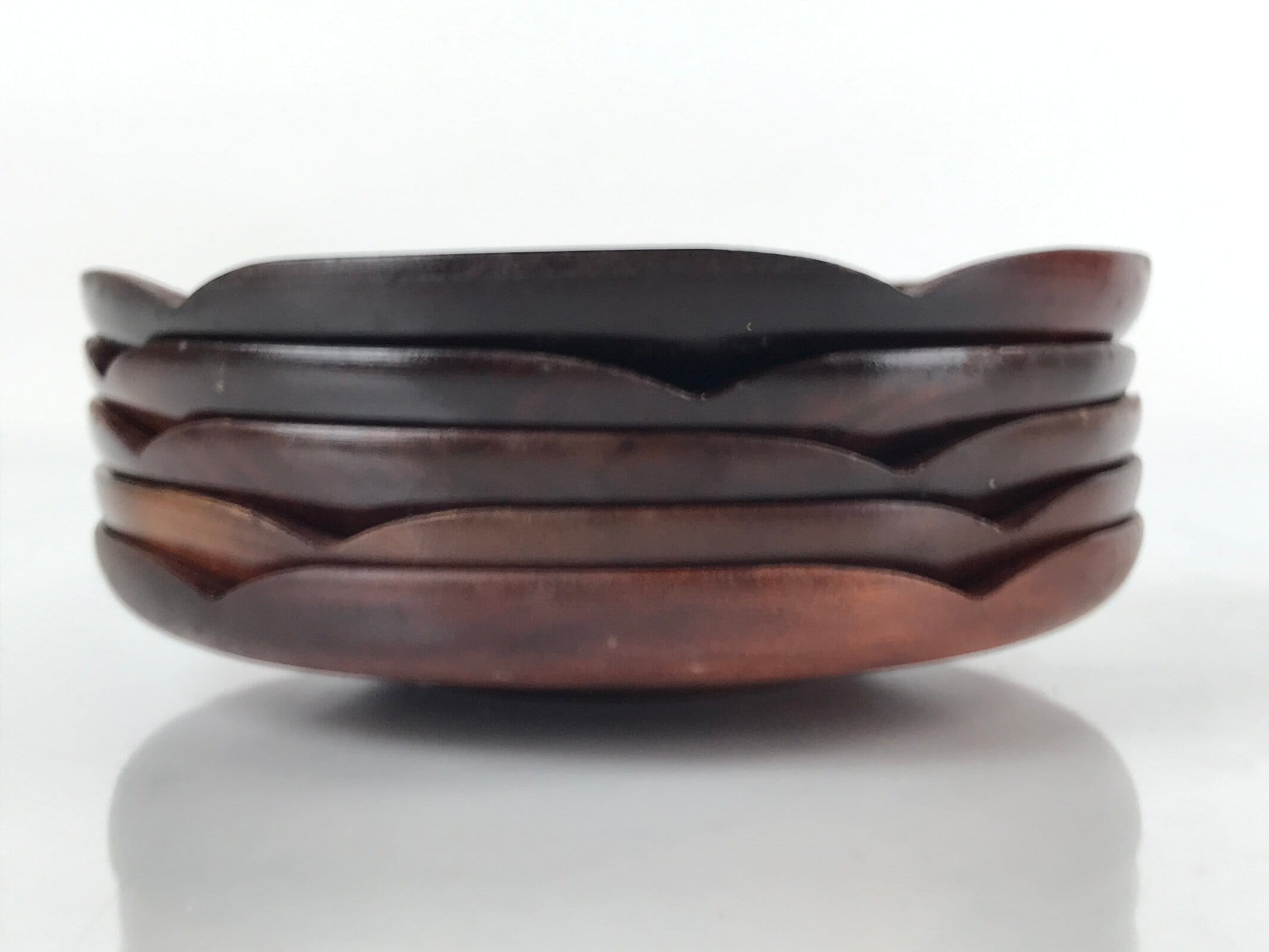 This is a five-piece set of vintage Japanese wooden lacquered drink saucers/coasters, or chataku. Stained a medium brown and brushed with a clear lacquer coating, this easily stackable set has flower-petal-like edges for subtle, elegant decoration.