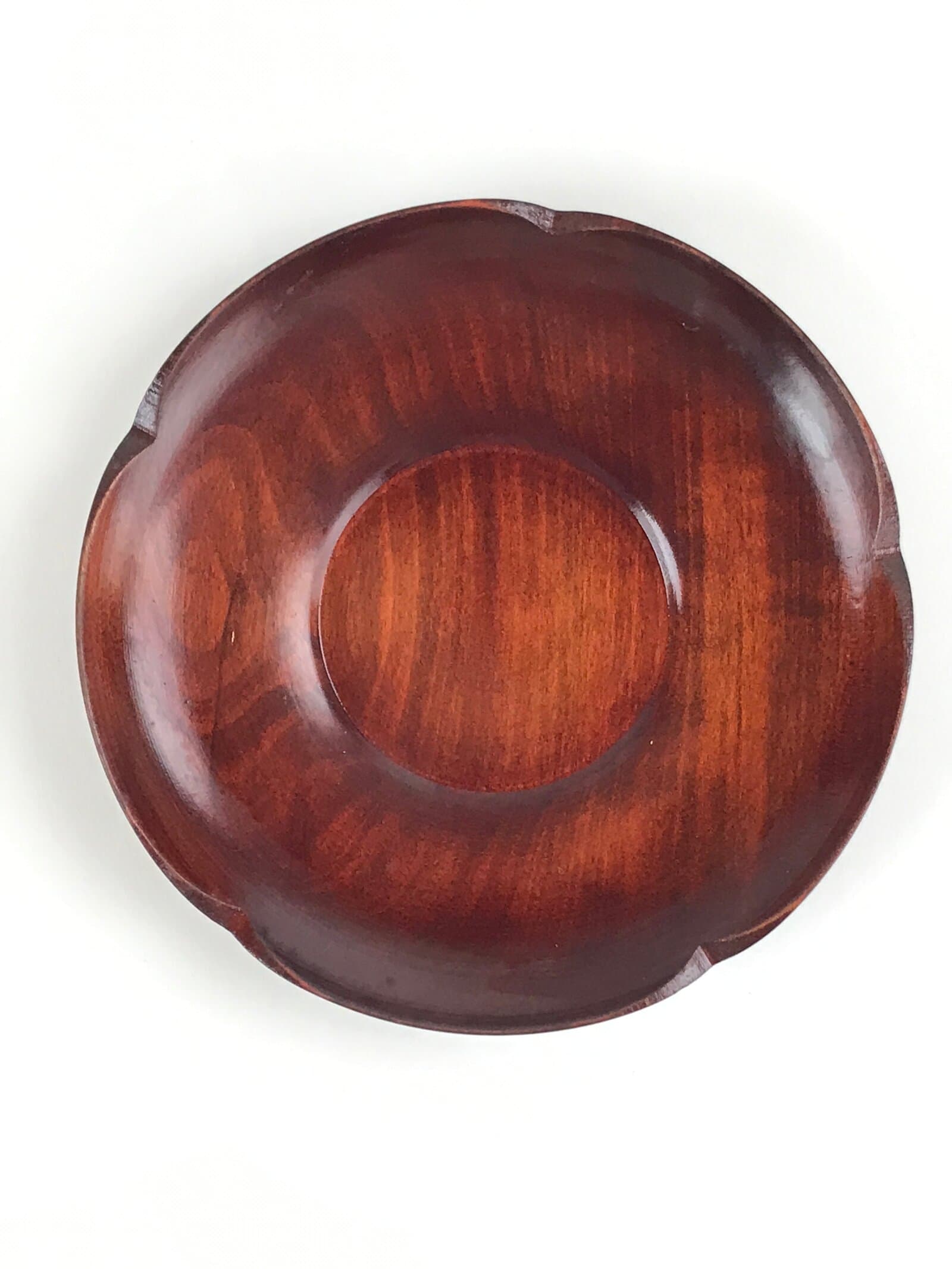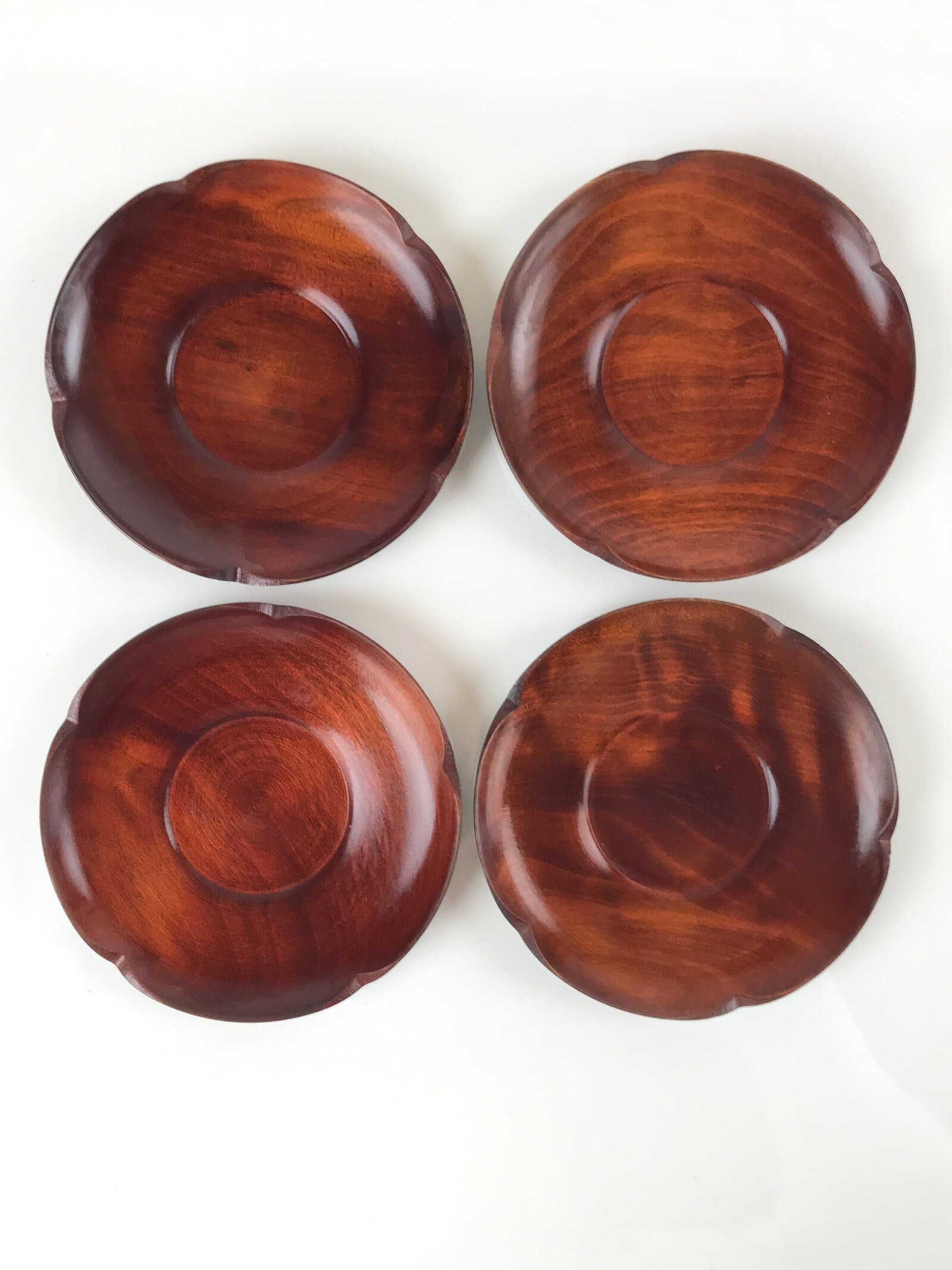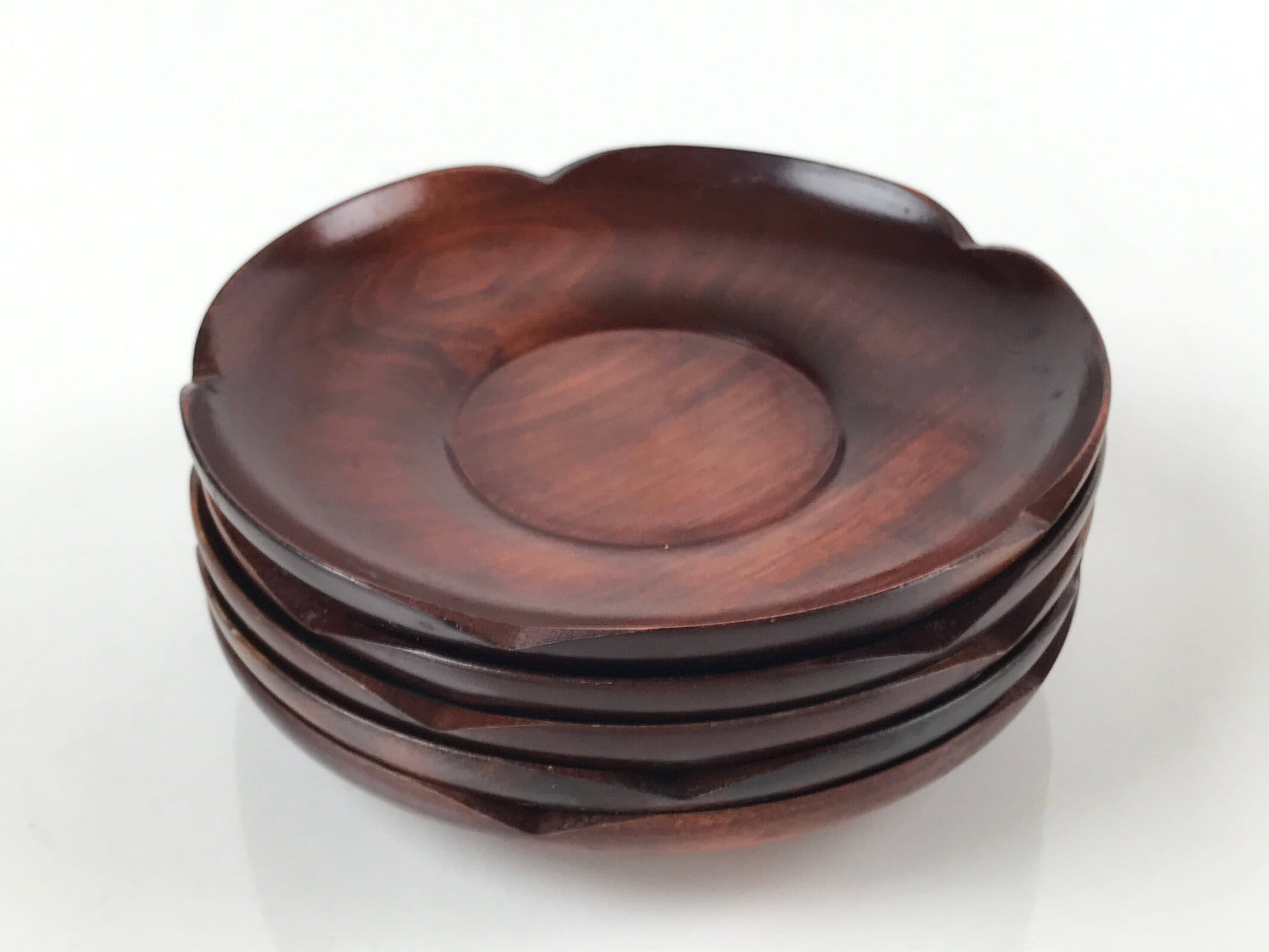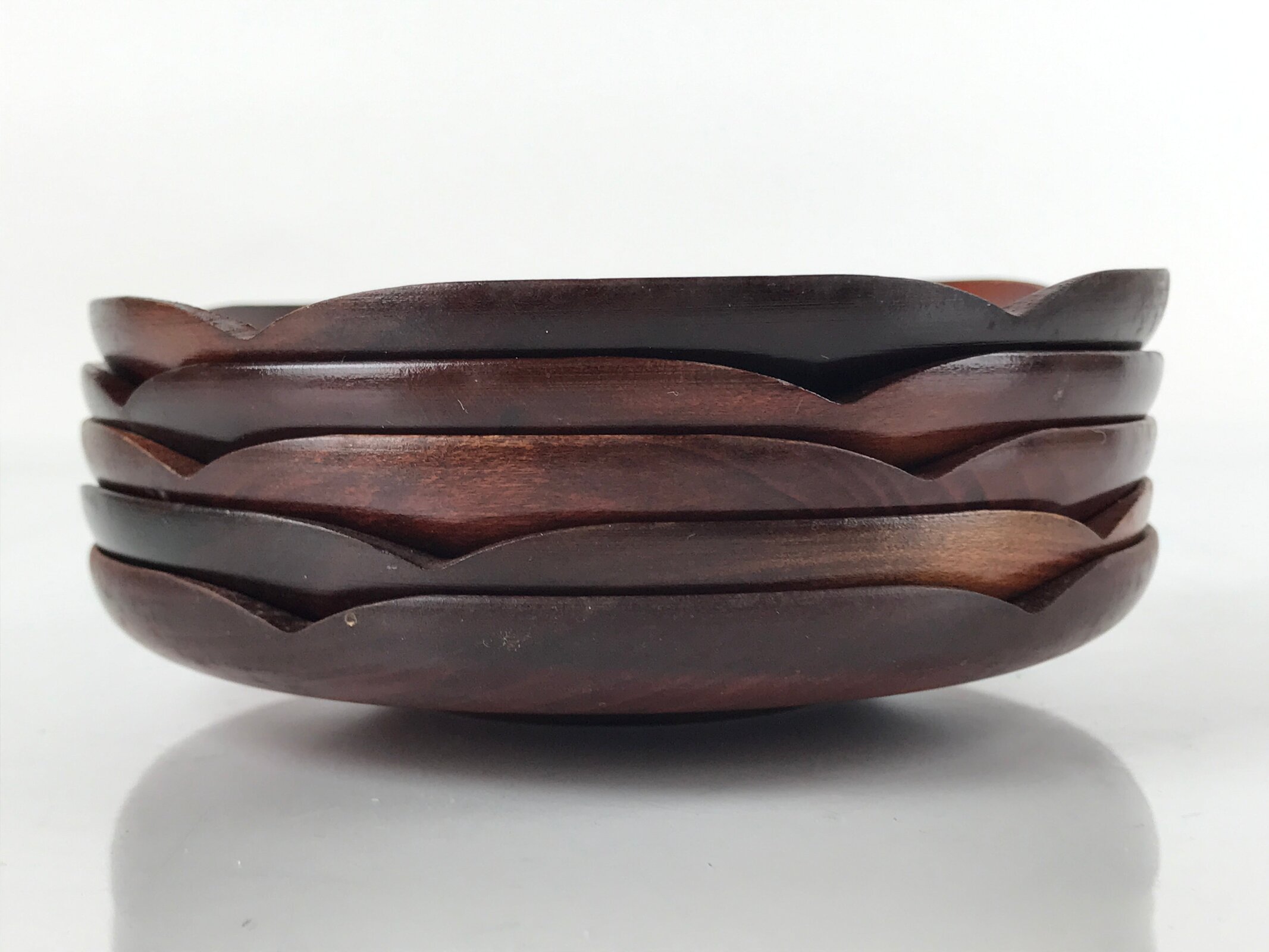 This is a five-piece set of vintage Japanese wooden lacquered drink saucers/coasters, or chataku. Stained a medium brown and brushed with a clear lacquer coating, this easily stackable set has flower-petal-like edges for subtle, elegant decoration.