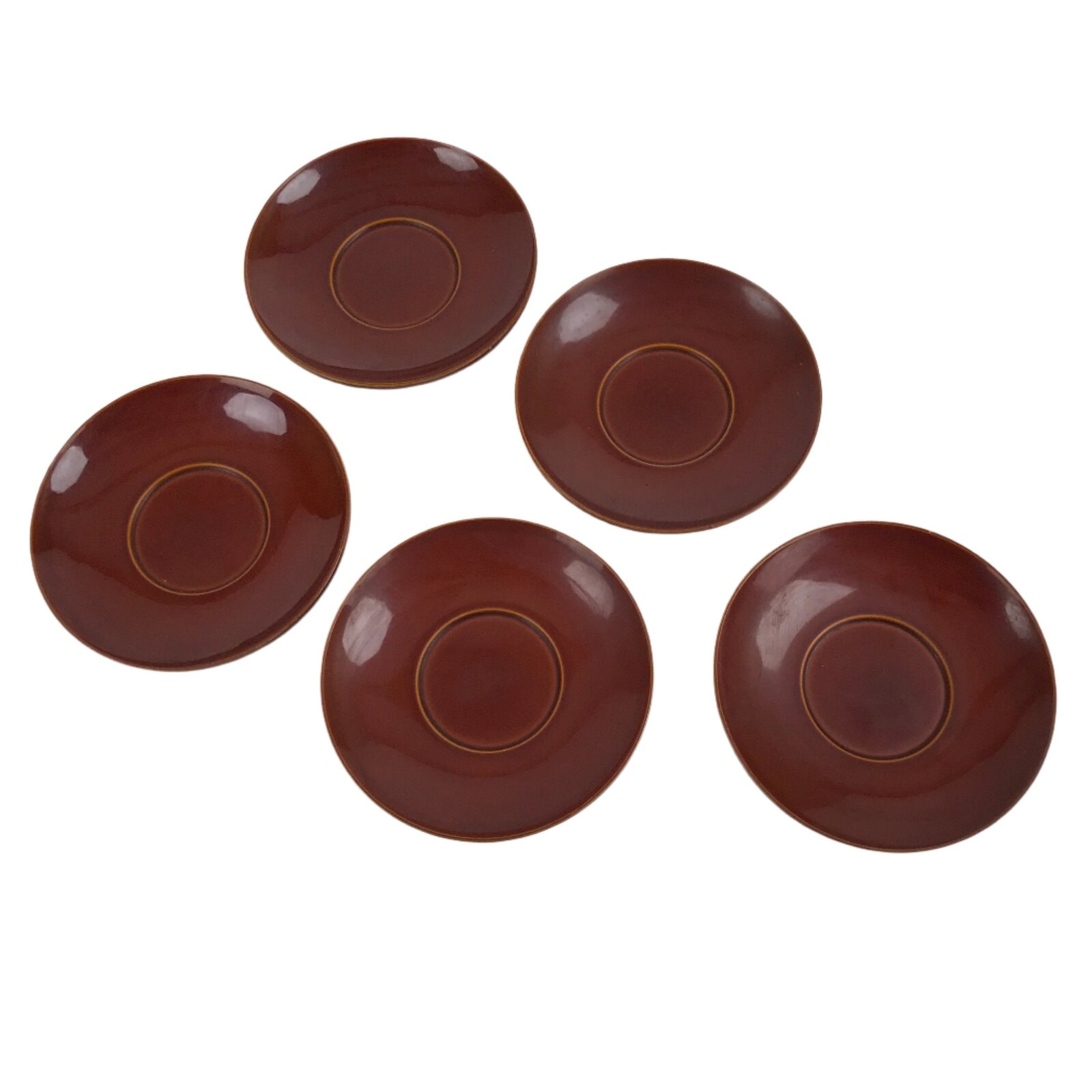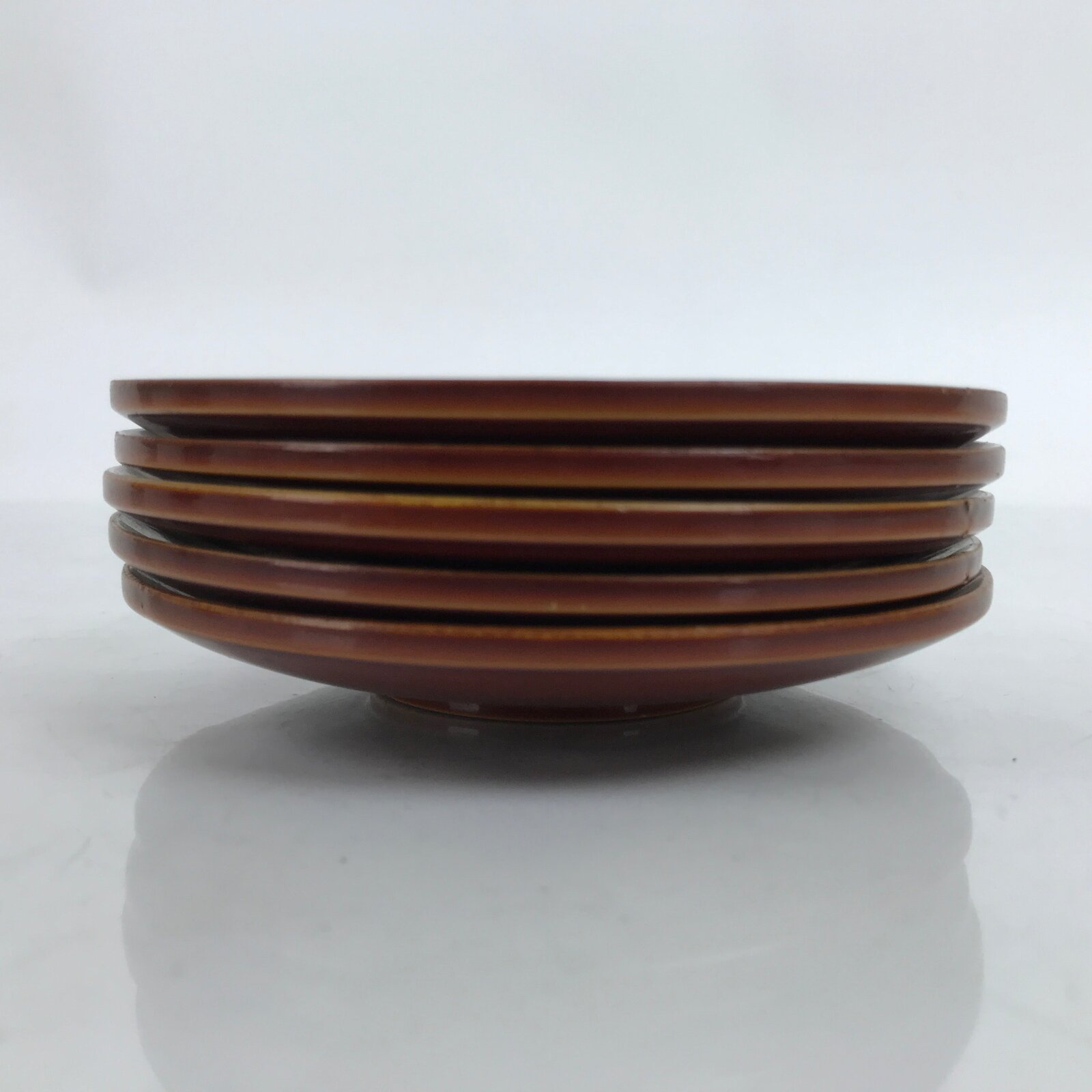 This is a five-piece set of vintage Japanese lacquered wooden drink saucers/coasters, or chataku. A stunning caramel brown lacquer color in true Hida Shunkei Nuri style, this lightweight and easily stackable set is a simple and classic. It has an indentation at the center to keep a cup from slipping off.