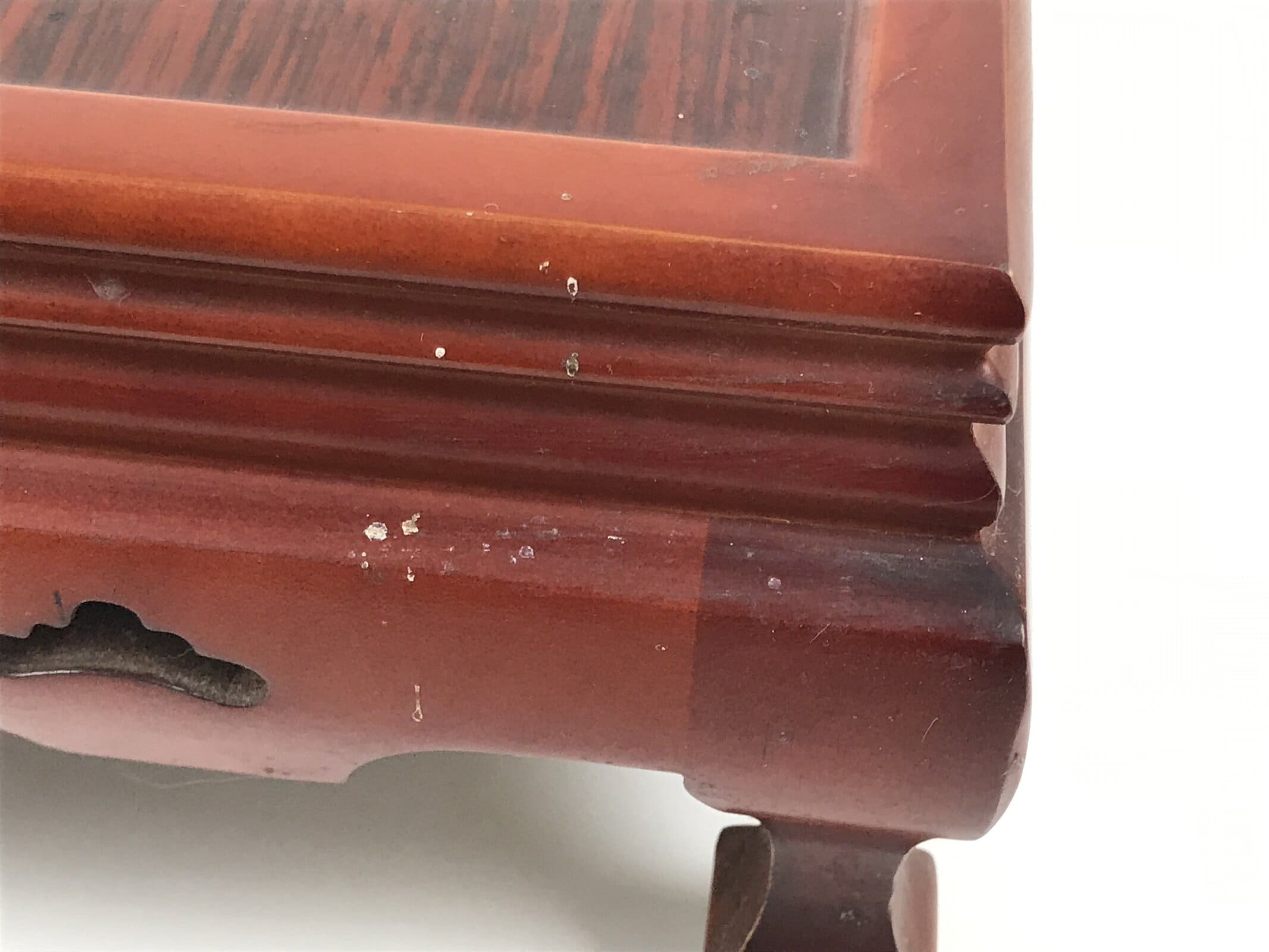 - Good condition considering its age. Scratches on top surface and rub marks on the edges and legs. Small chips on corner. Wear and tear due to age. Please see the photos.