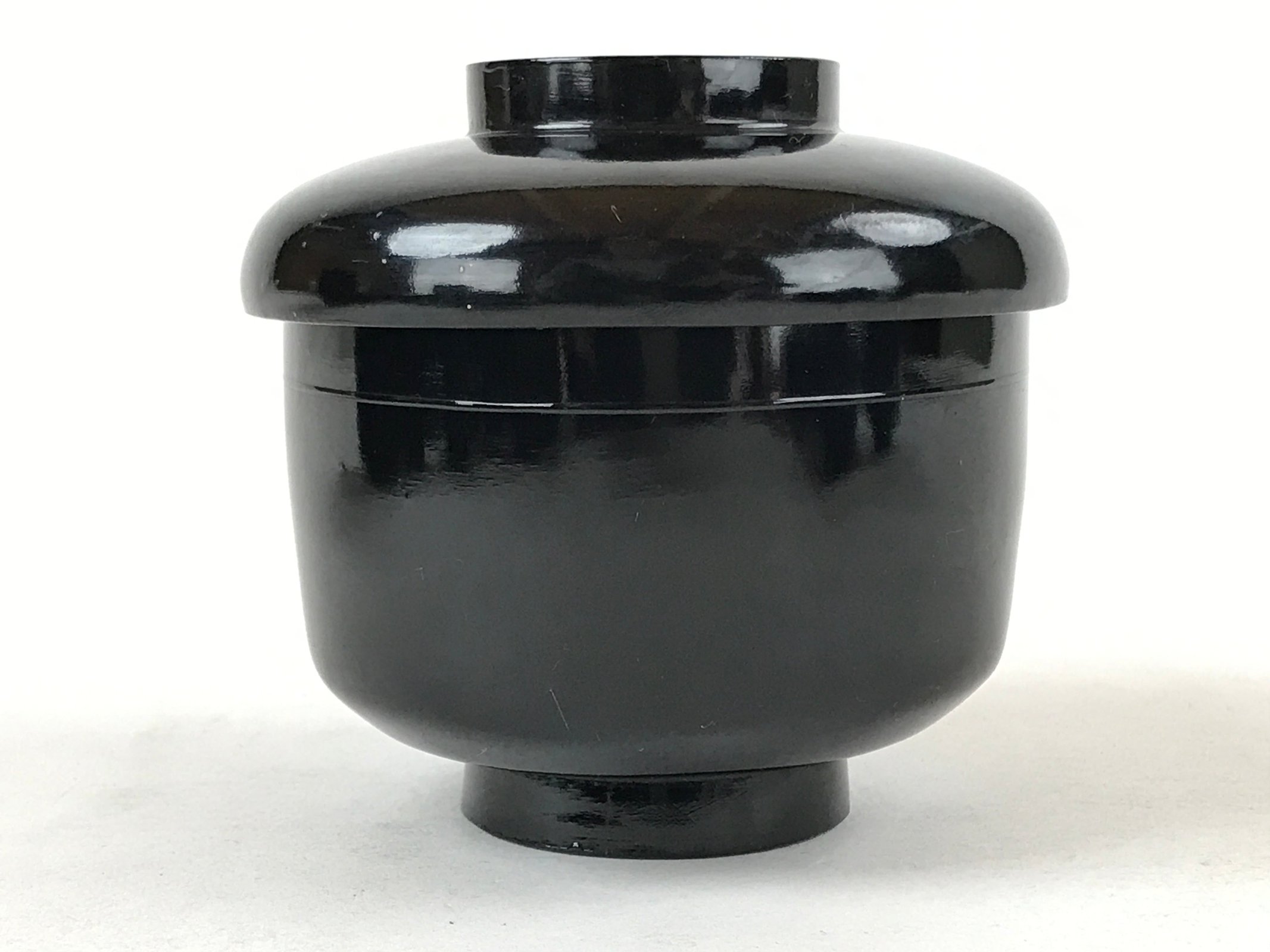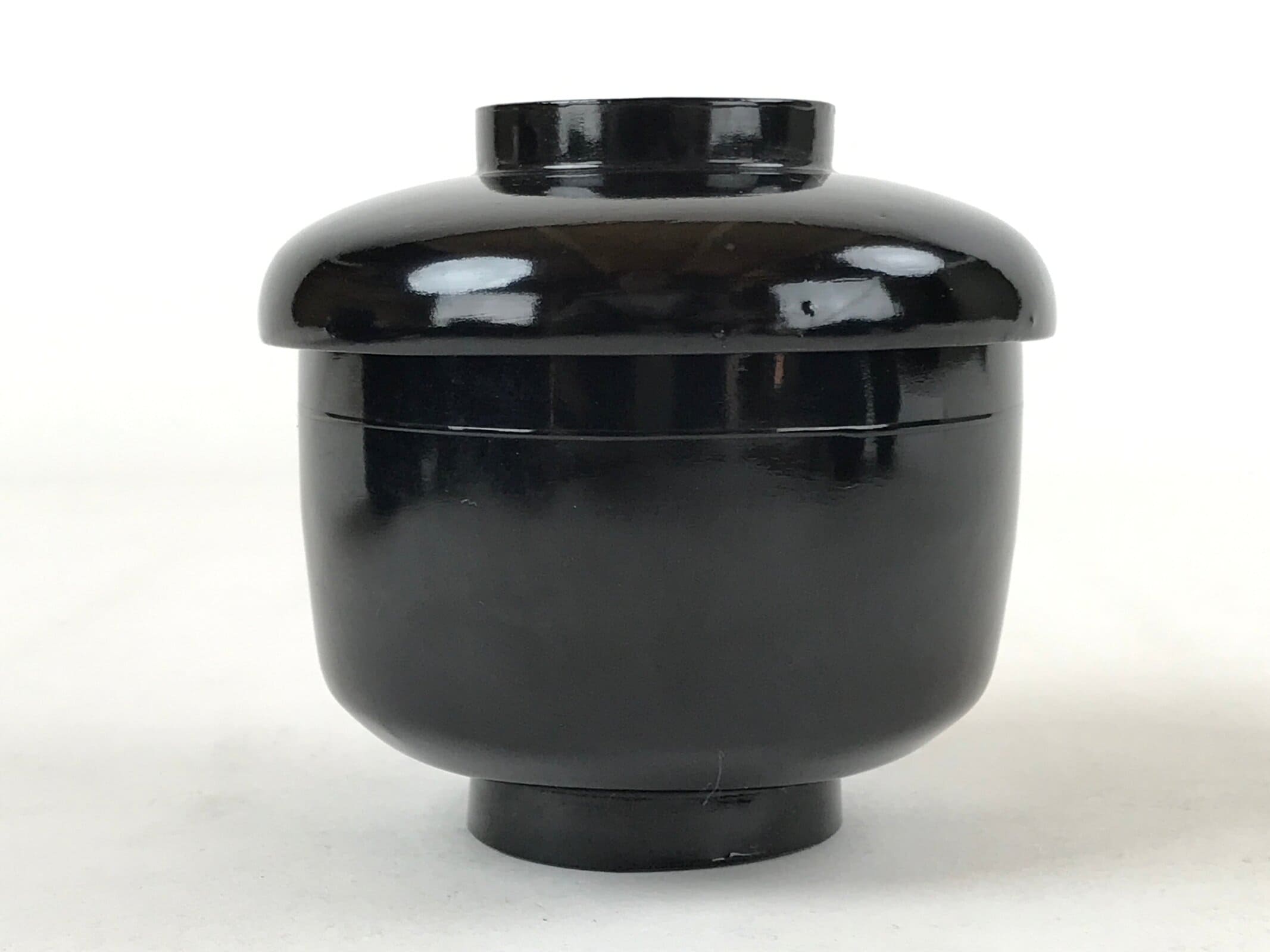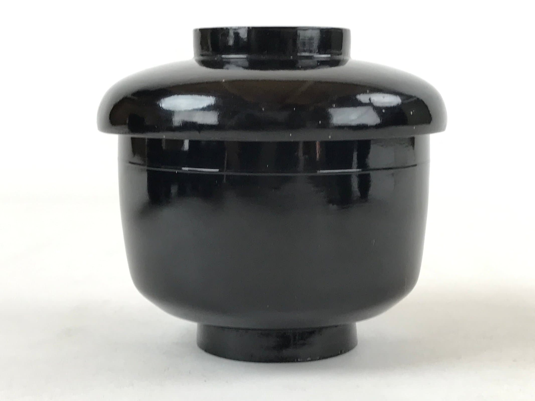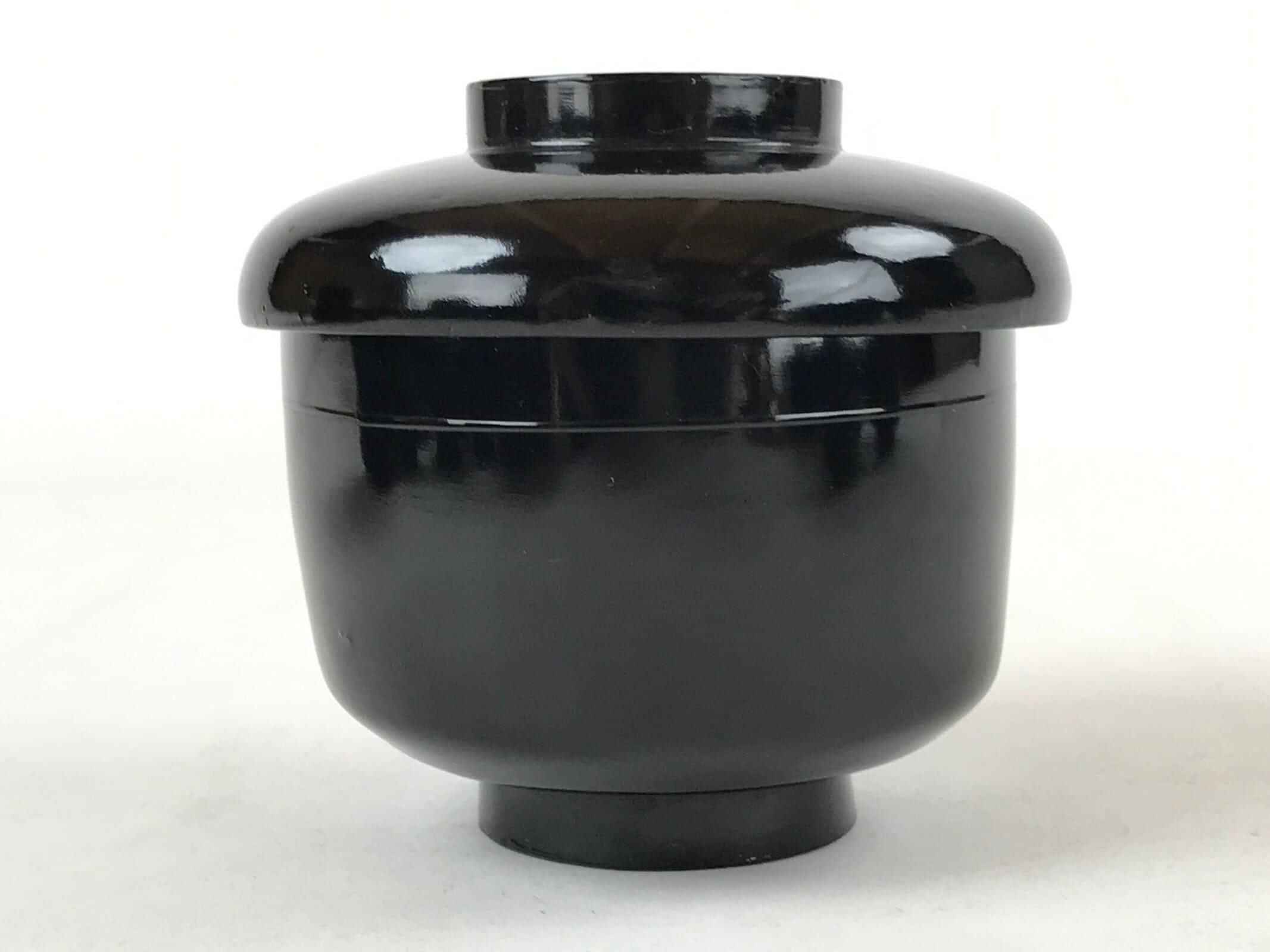An iconic glossy black outside and bright red inside, this vintage lacquered wooden bowl with lid is a classic addition to any traditional Japanese dinnerware set. This particular bowl is considered an owan, a bowl made for soups or rice. It can also be used for other dishes. The bowl itself is easy to hold while eating and the lid fits loosely on the top with an overhang.