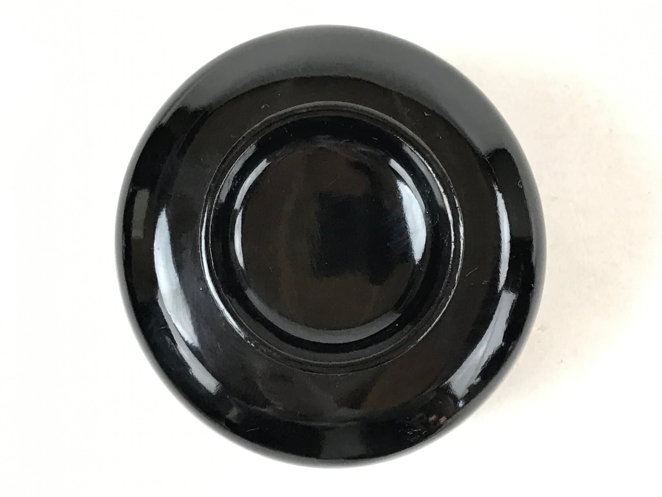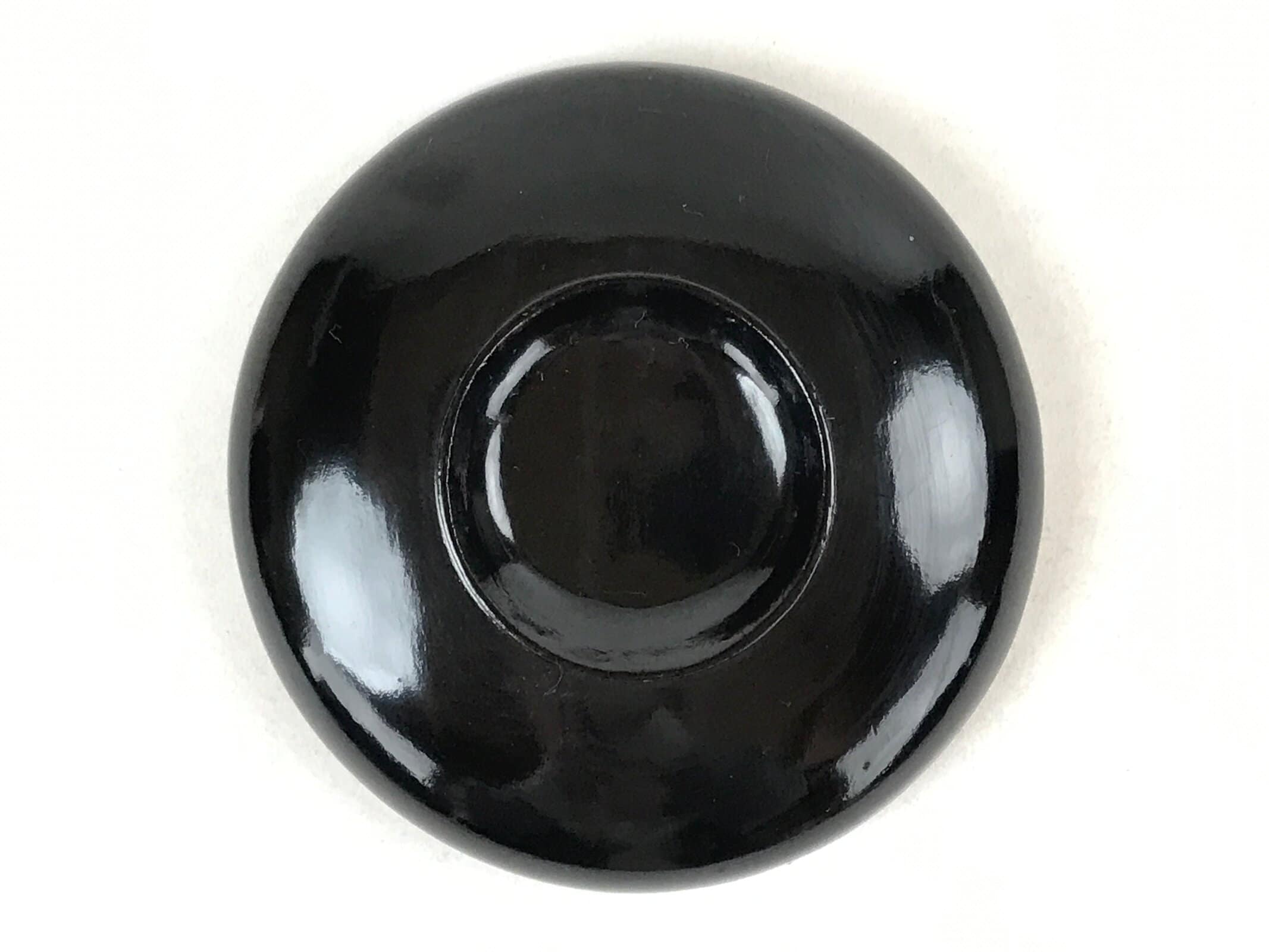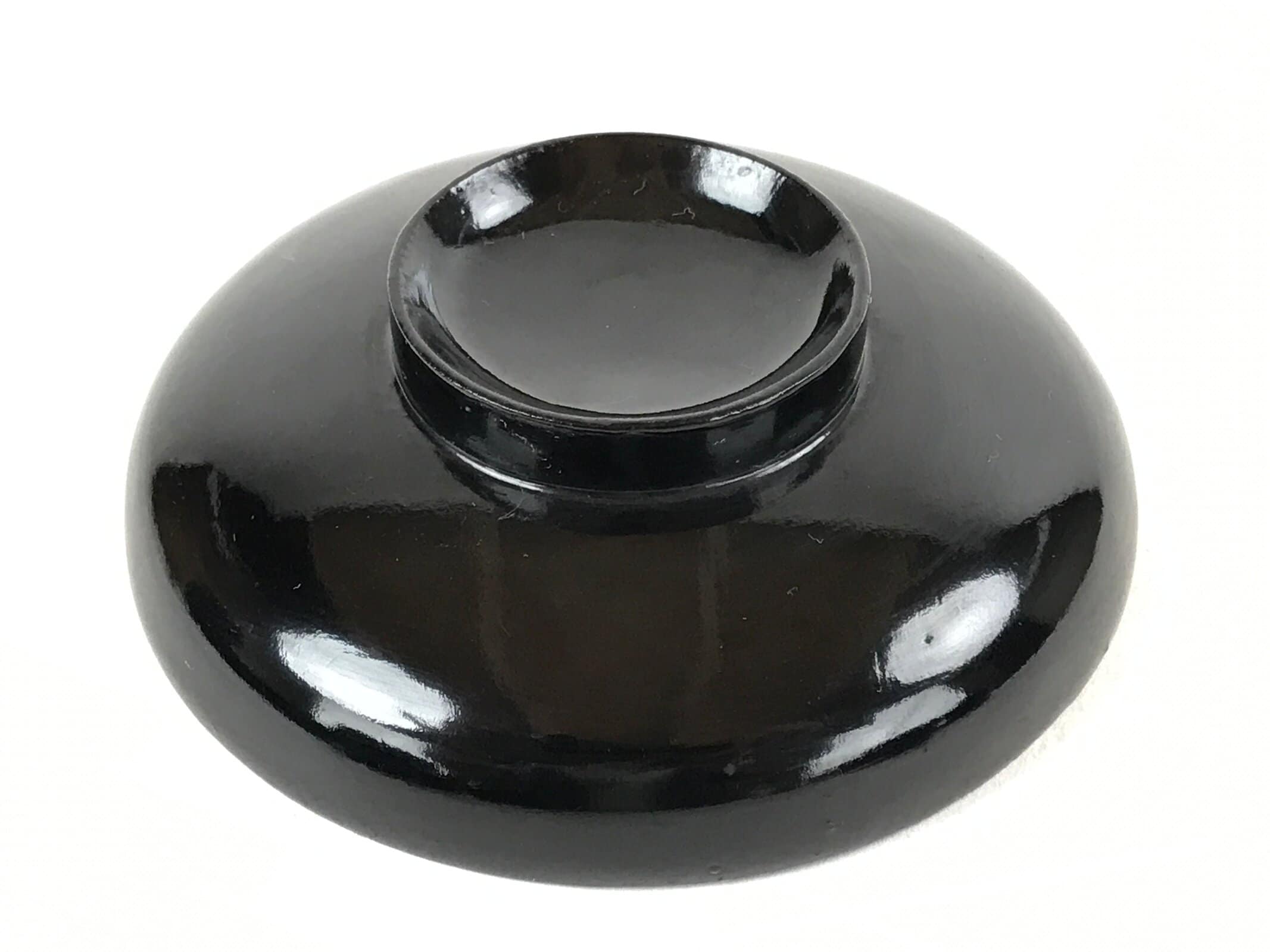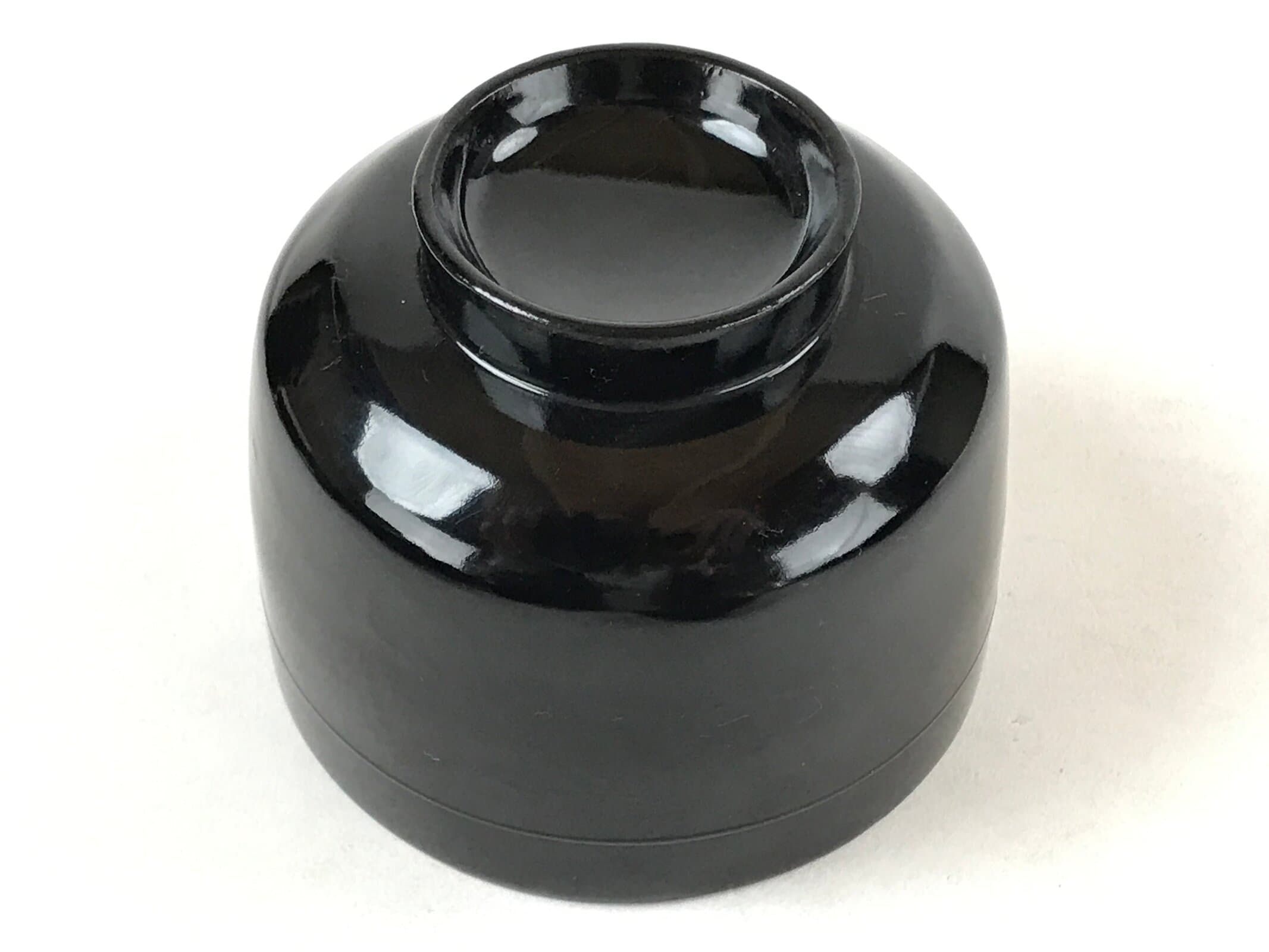 An iconic glossy black outside and bright red inside, this vintage lacquered wooden bowl with lid is a classic addition to any traditional Japanese dinnerware set. This particular bowl is considered an owan, a bowl made for soups or rice. It can also be used for other dishes. The bowl itself is easy to hold while eating and the lid fits loosely on the top with an overhang.