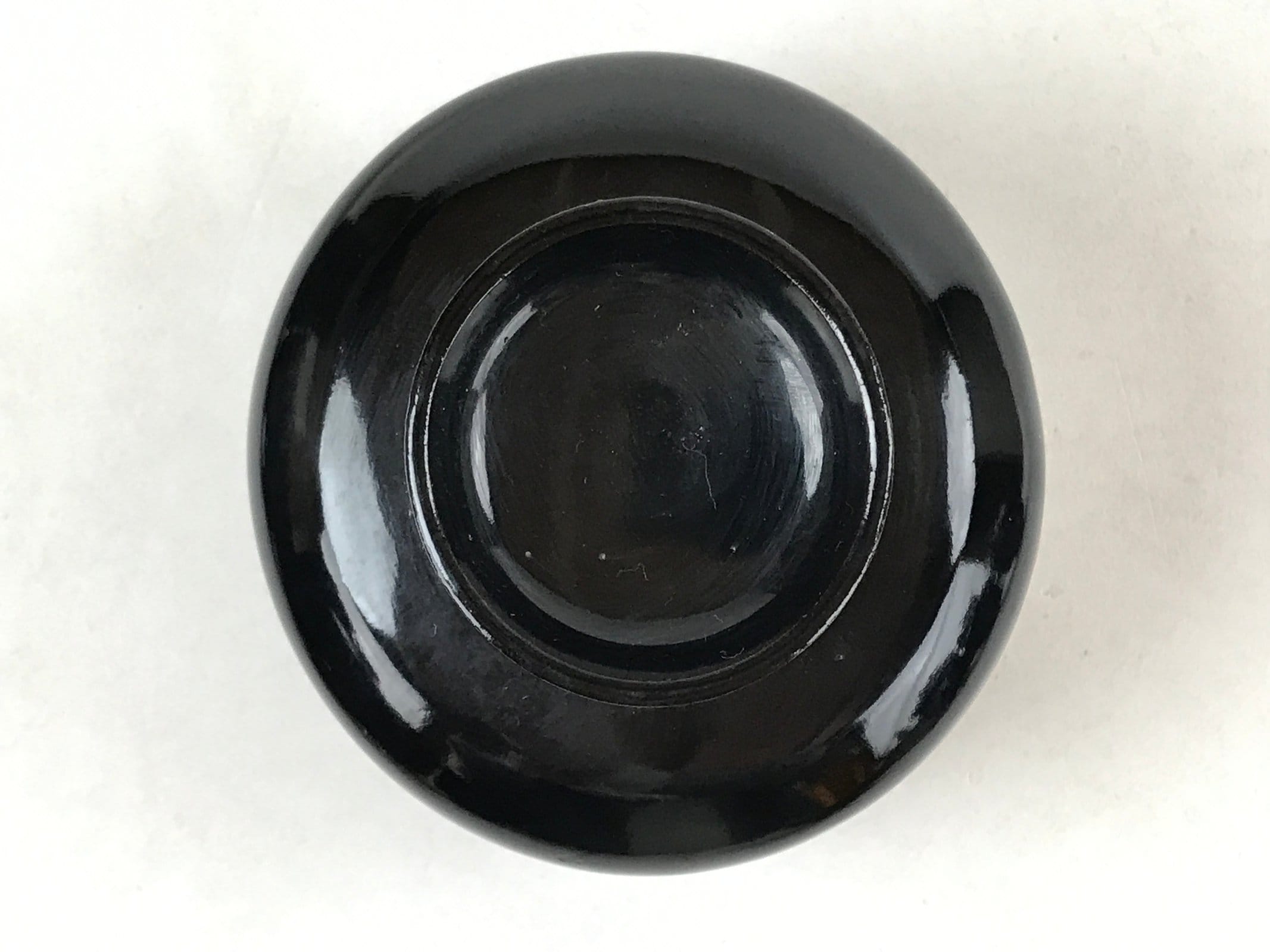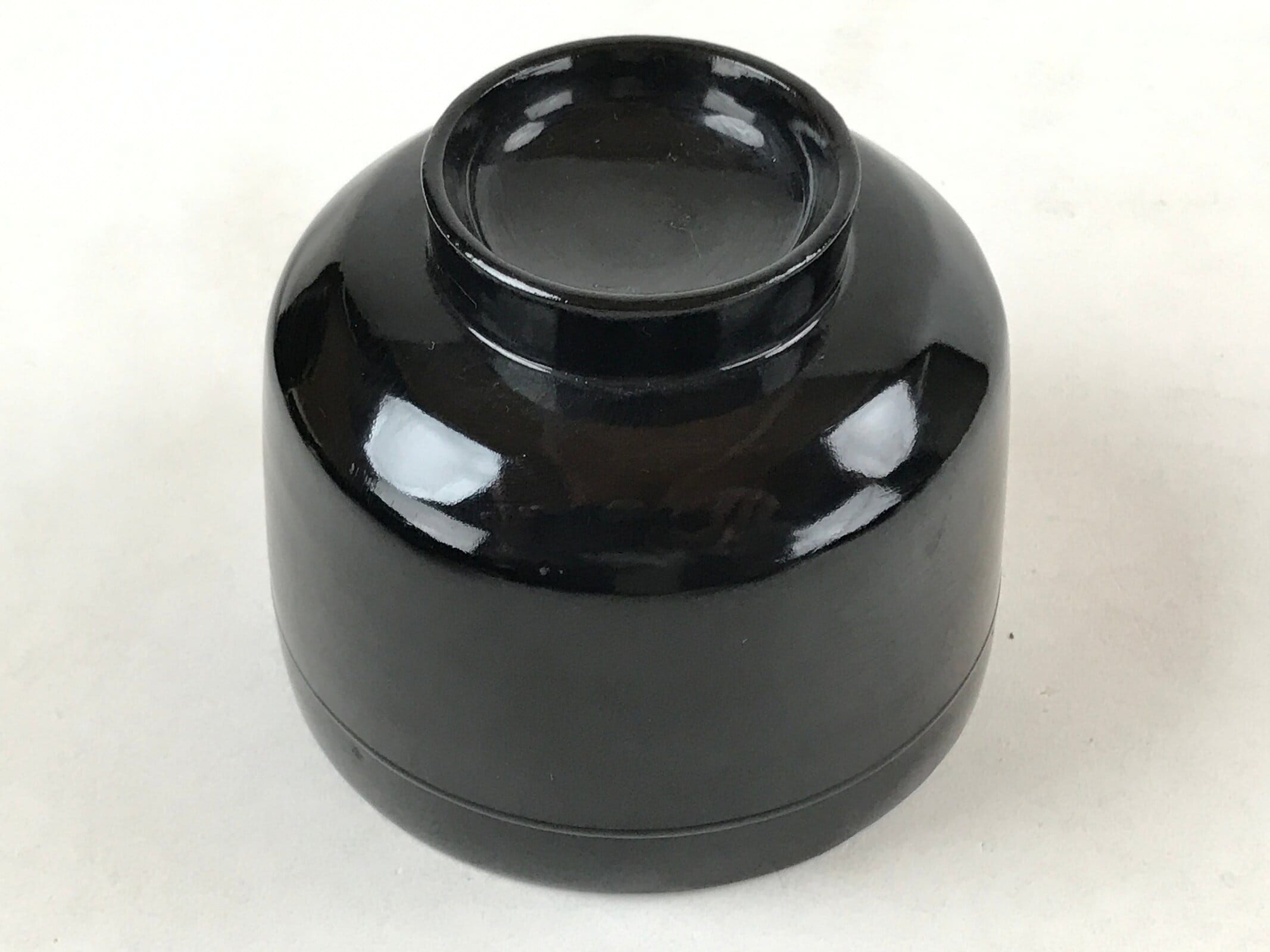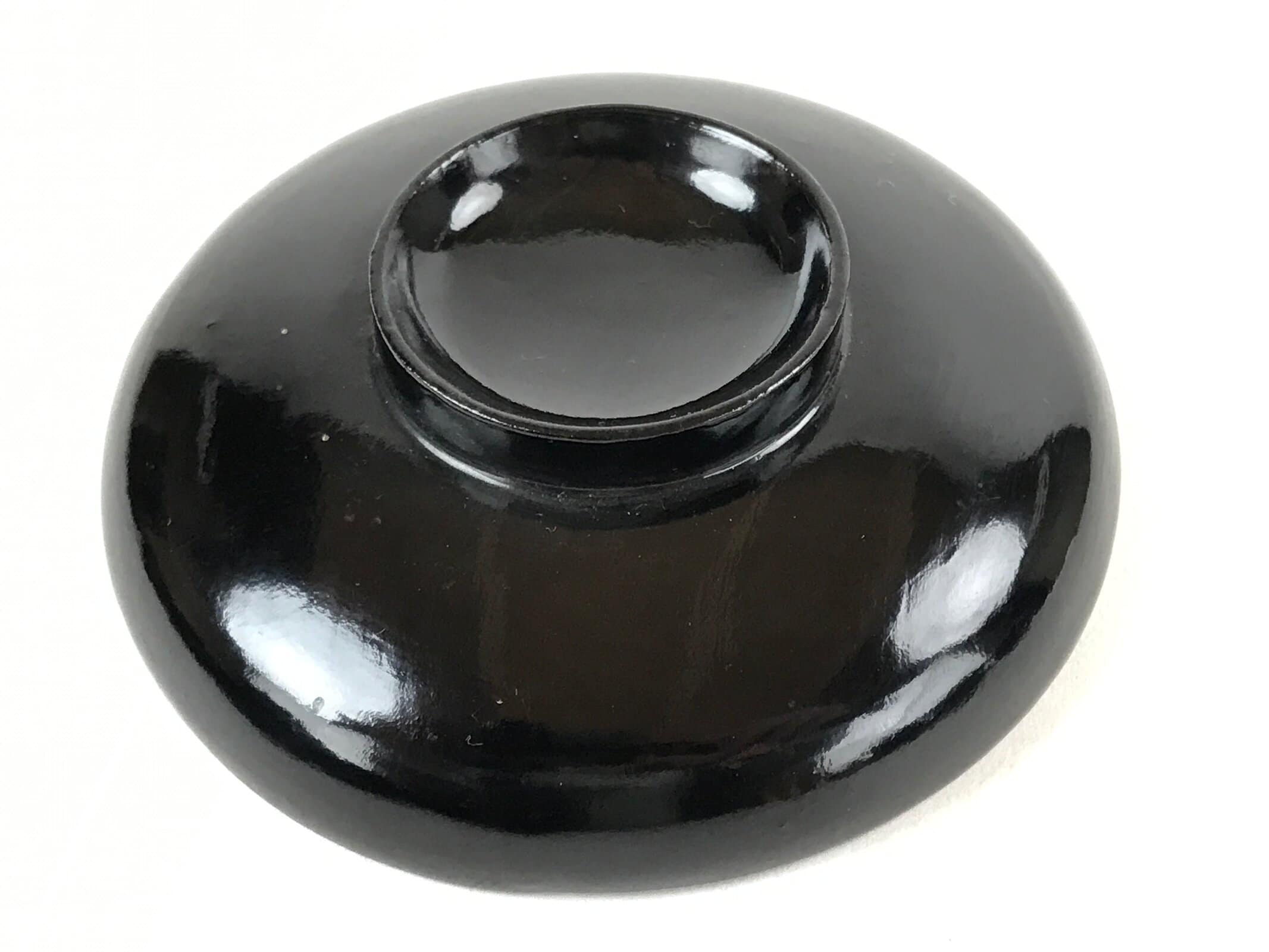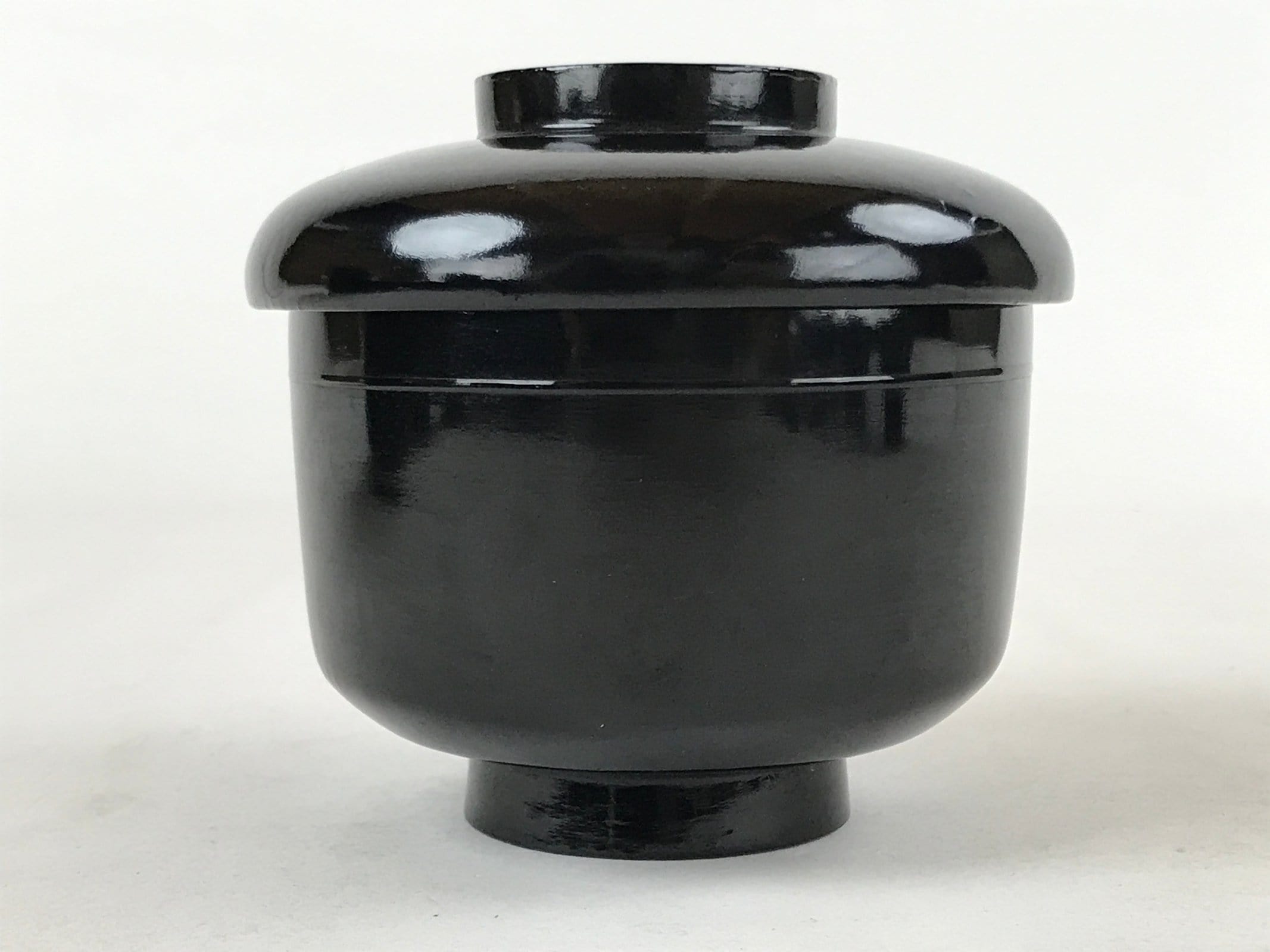 An iconic glossy black outside and bright red inside, this vintage lacquered wooden bowl with lid is a classic addition to any traditional Japanese dinnerware set. This particular bowl is considered an owan, a bowl made for soups or rice. It can also be used for other dishes. The bowl itself is easy to hold while eating and the lid fits loosely on the top with an overhang.
