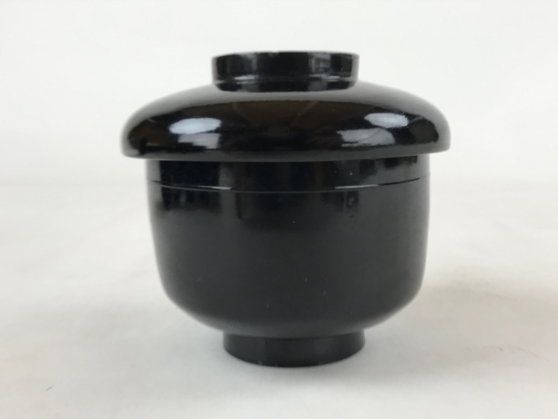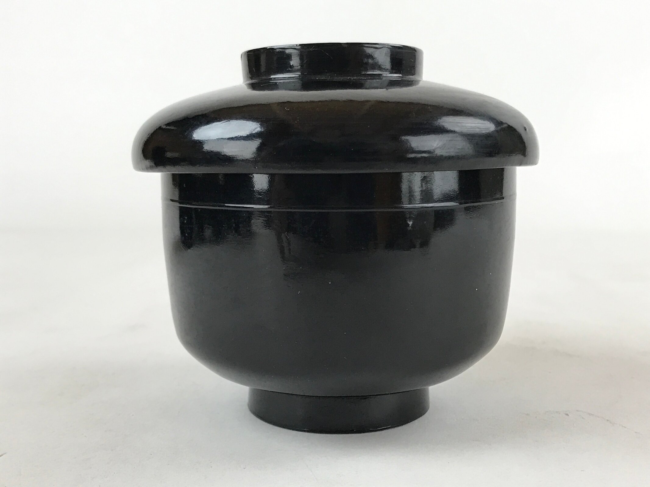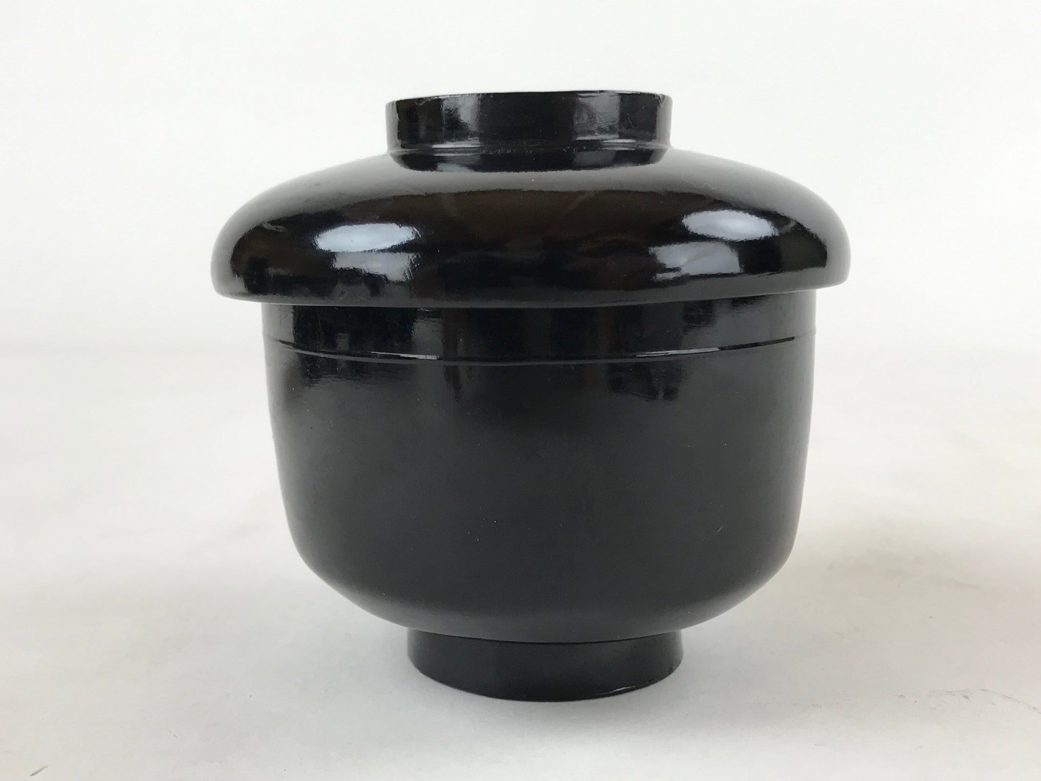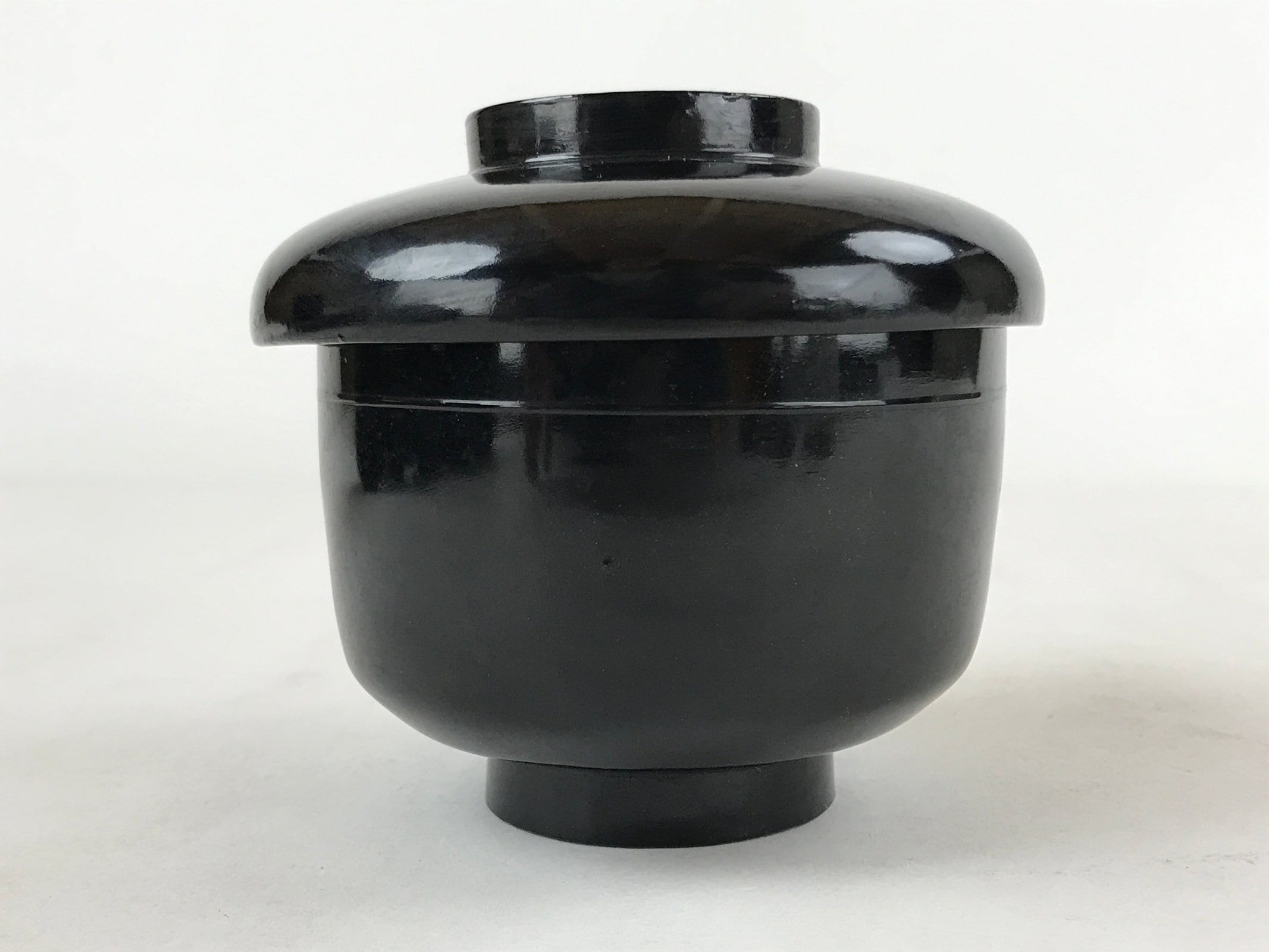 An iconic glossy black outside and bright red inside, this vintage lacquered wooden bowl with lid is a classic addition to any traditional Japanese dinnerware set. This particular bowl is considered an owan, a bowl made for soups or rice. It can also be used for other dishes. The bowl itself is easy to hold while eating and the lid fits loosely on the top with an overhang.
