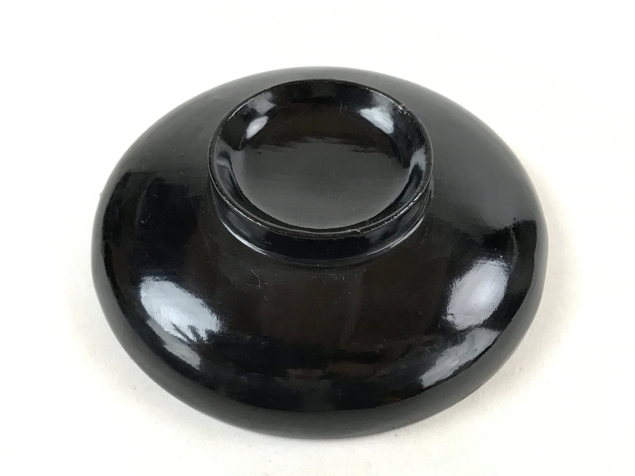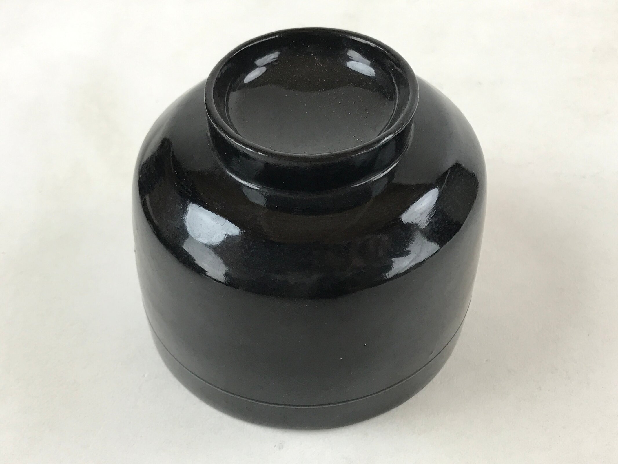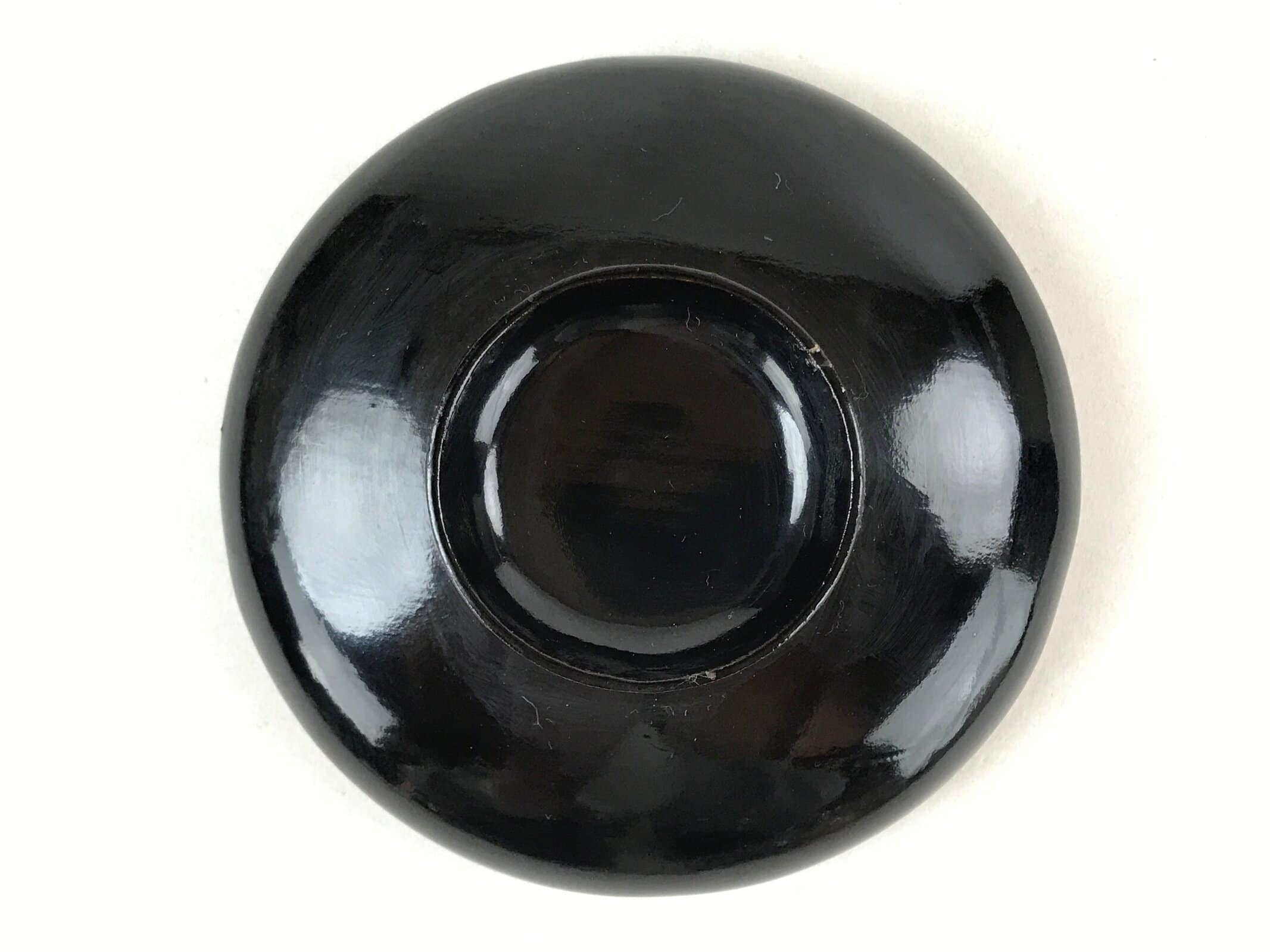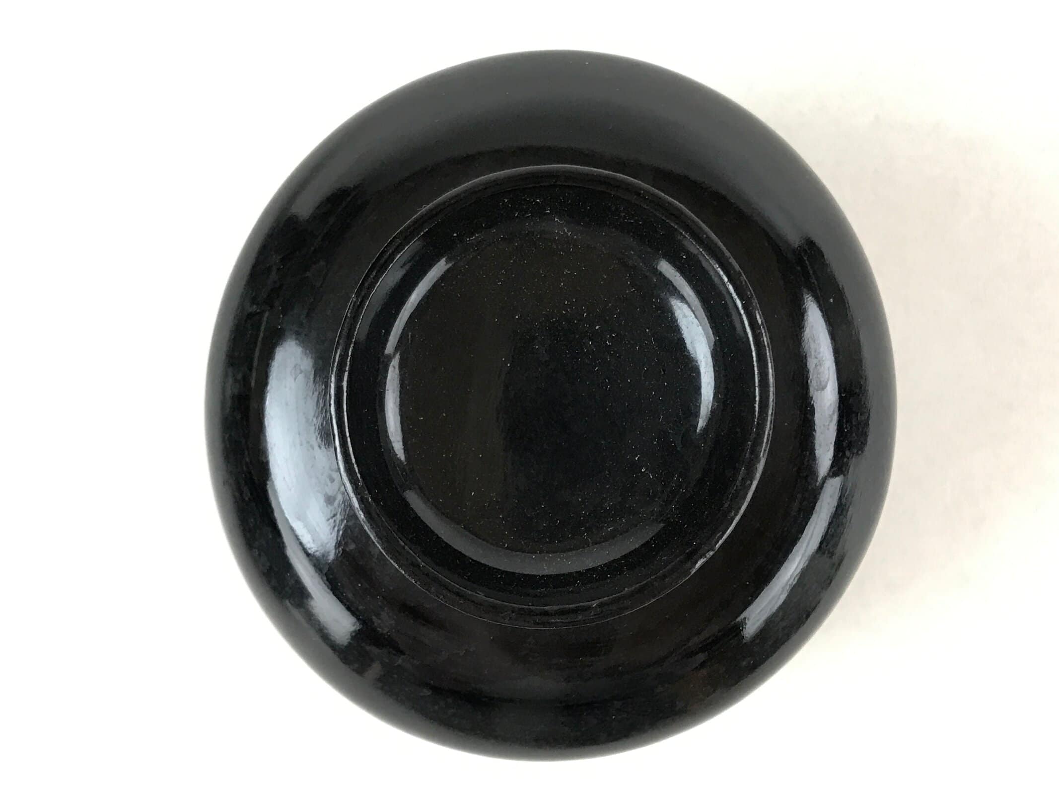An iconic glossy black outside and bright red inside, this vintage lacquered wooden bowl with lid is a classic addition to any traditional Japanese dinnerware set. This particular bowl is considered an owan, a bowl made for soups or rice. It can also be used for other dishes. The bowl itself is easy to hold while eating and the lid fits loosely on the top with an overhang.