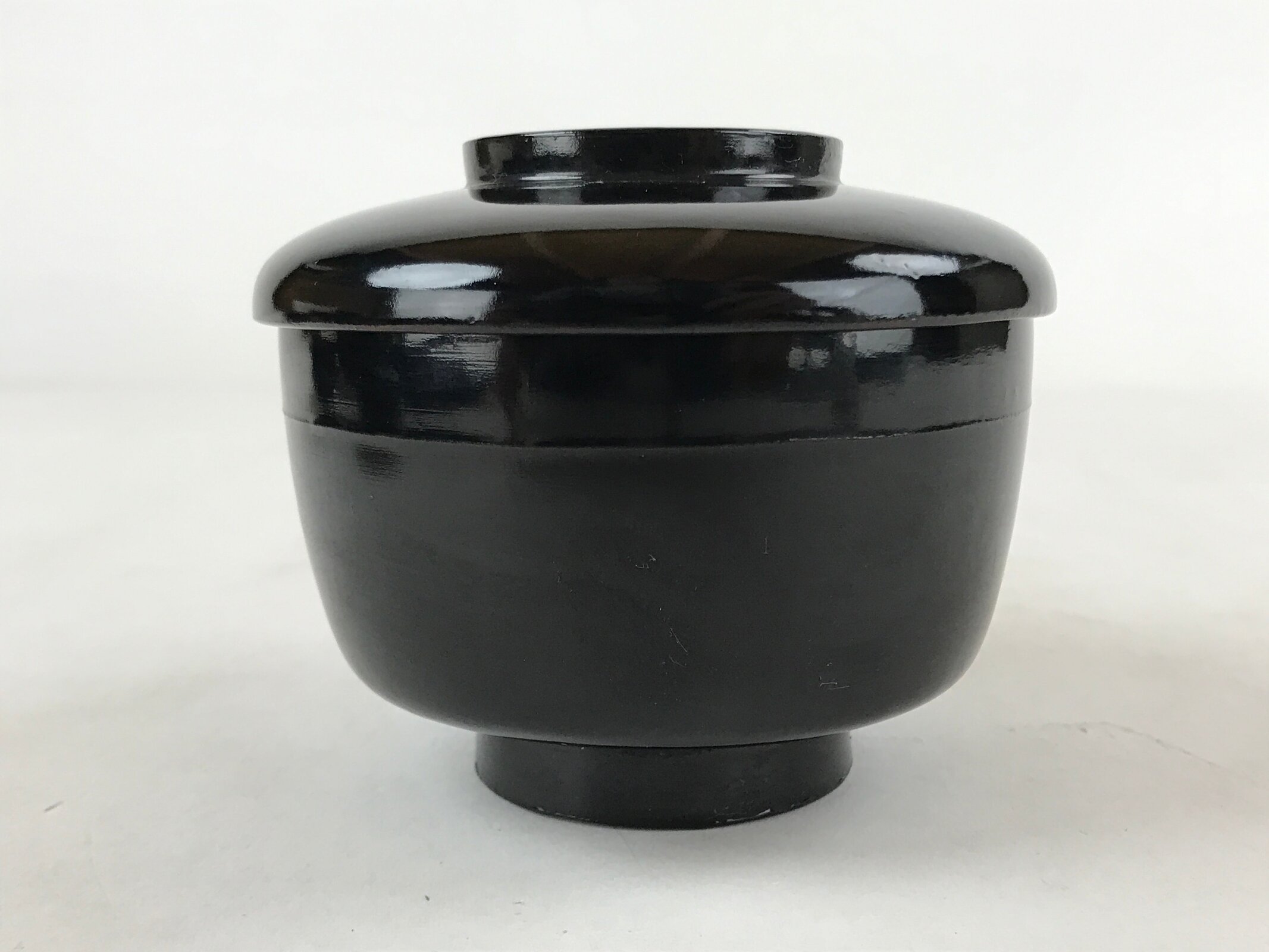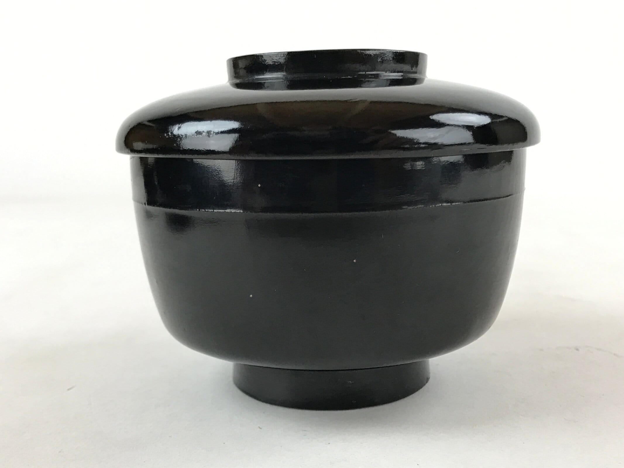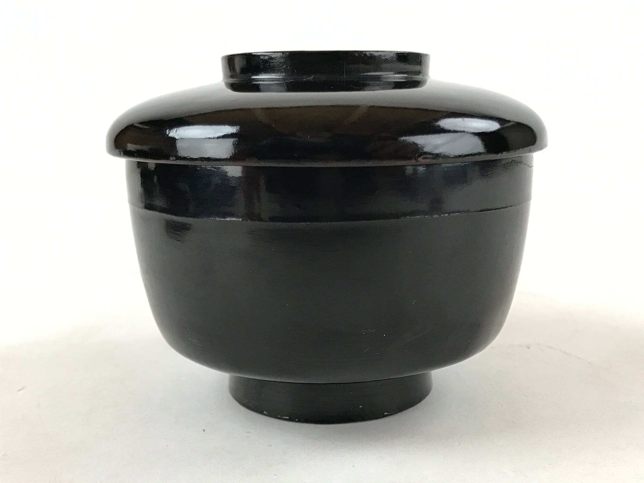 An iconic glossy black outside and bright red inside, this vintage lacquered wooden bowl with a lid is a classic addition to any traditional Japanese dinnerware set. This particular bowl is considered an owan, a bowl made for soups or rice. It can also be used for other dishes. The bowl itself is easy to hold while eating and the lid fits loosely on the top with an overhang.