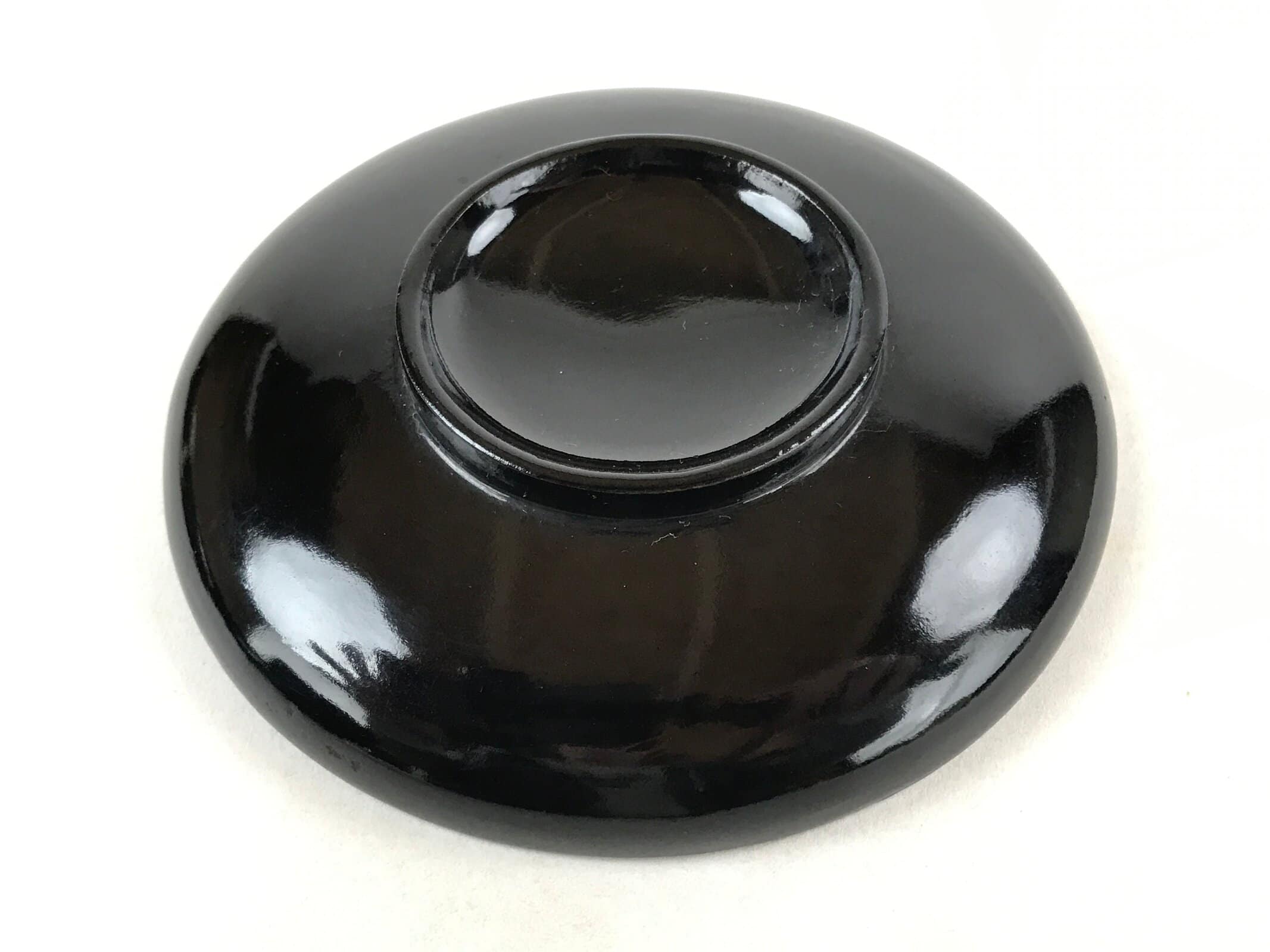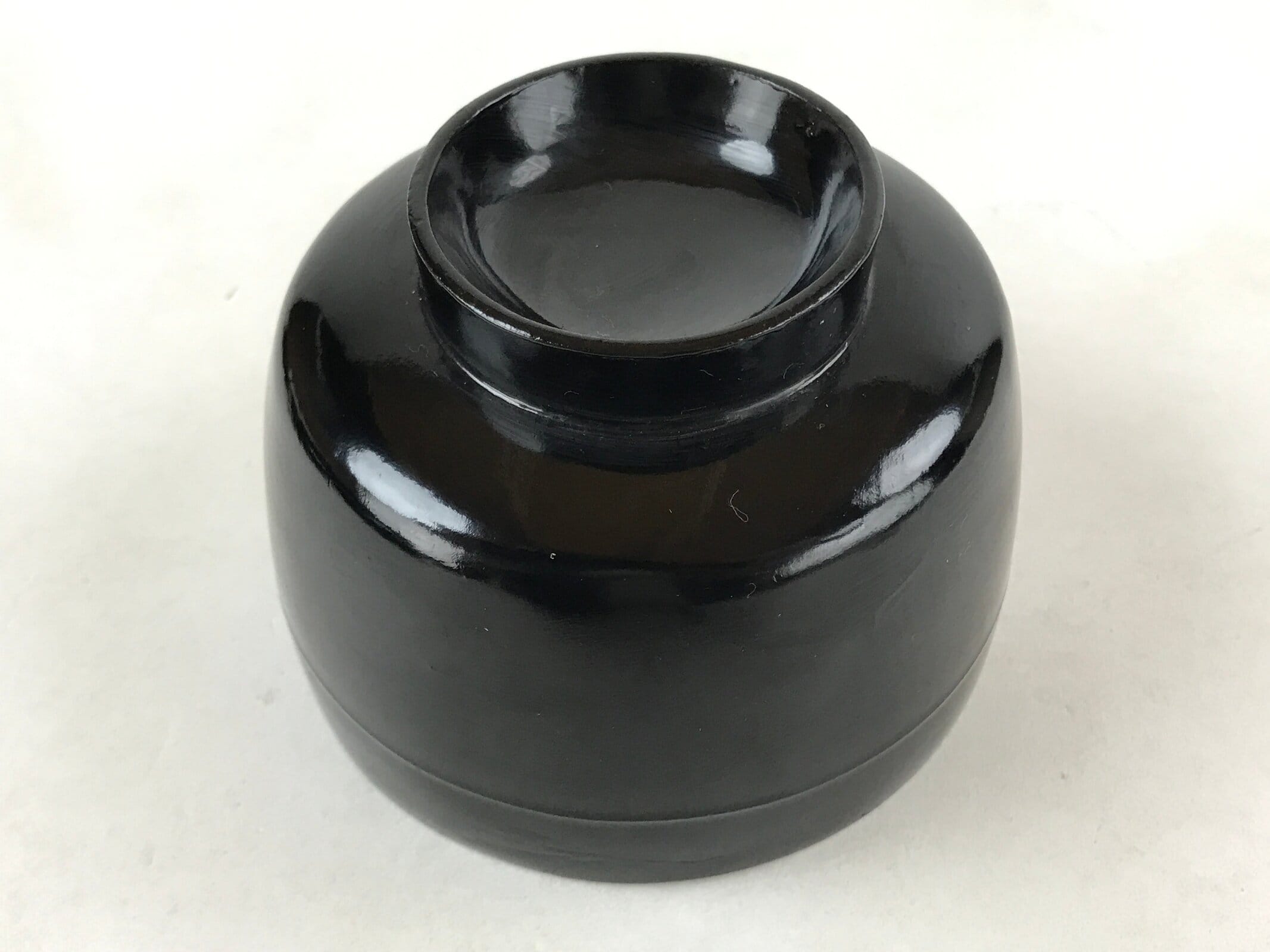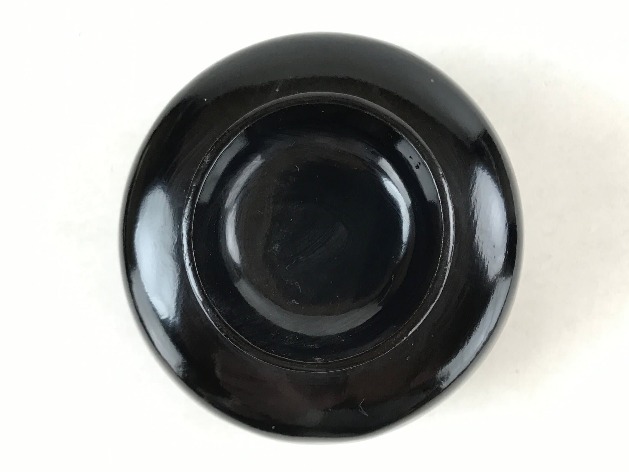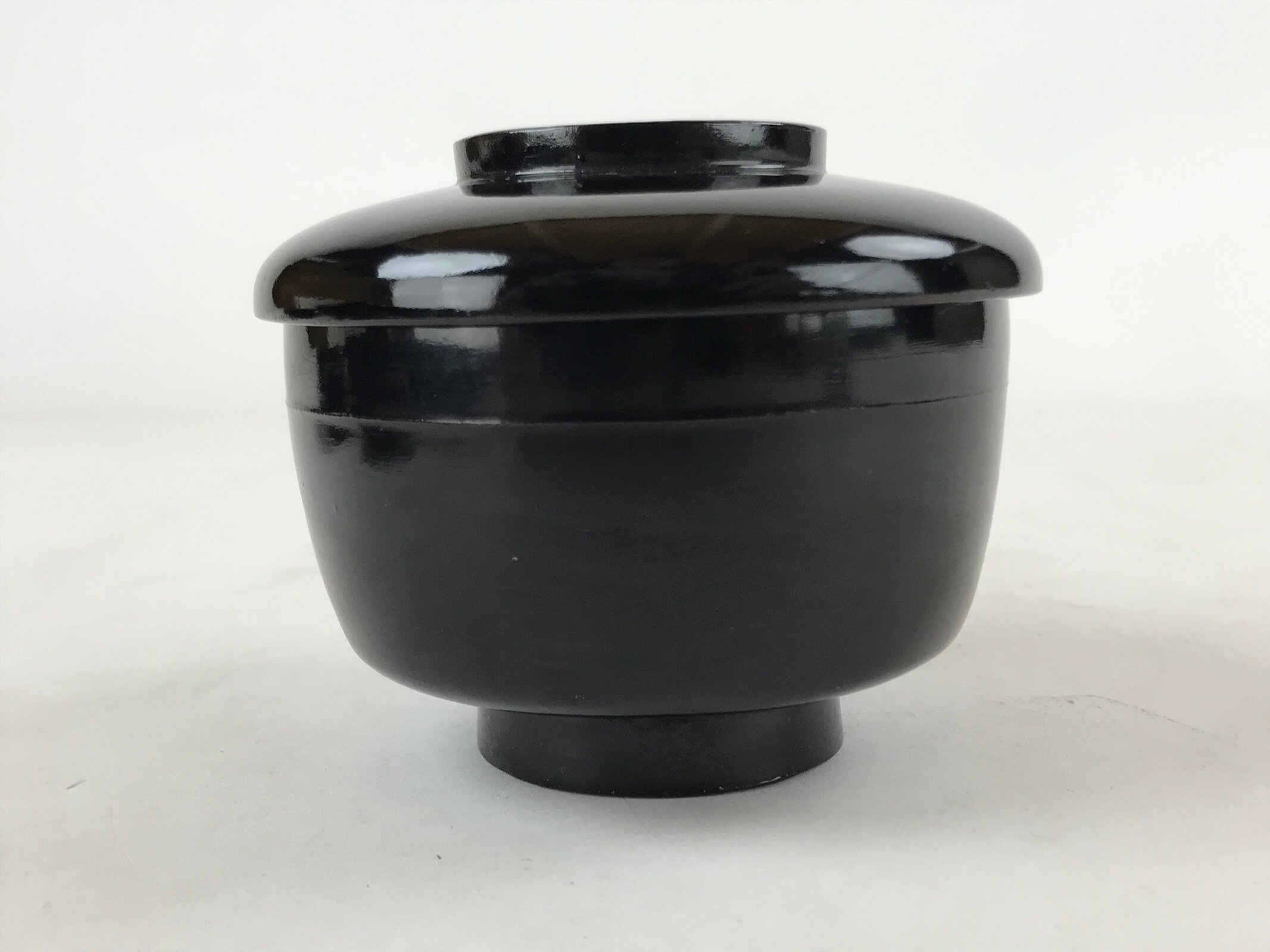 An iconic glossy black outside and bright red inside, this vintage lacquered wooden bowl with a lid is a classic addition to any traditional Japanese dinnerware set. This particular bowl is considered an owan, a bowl made for soups or rice. It can also be used for other dishes. The bowl itself is easy to hold while eating and the lid fits loosely on the top with an overhang.