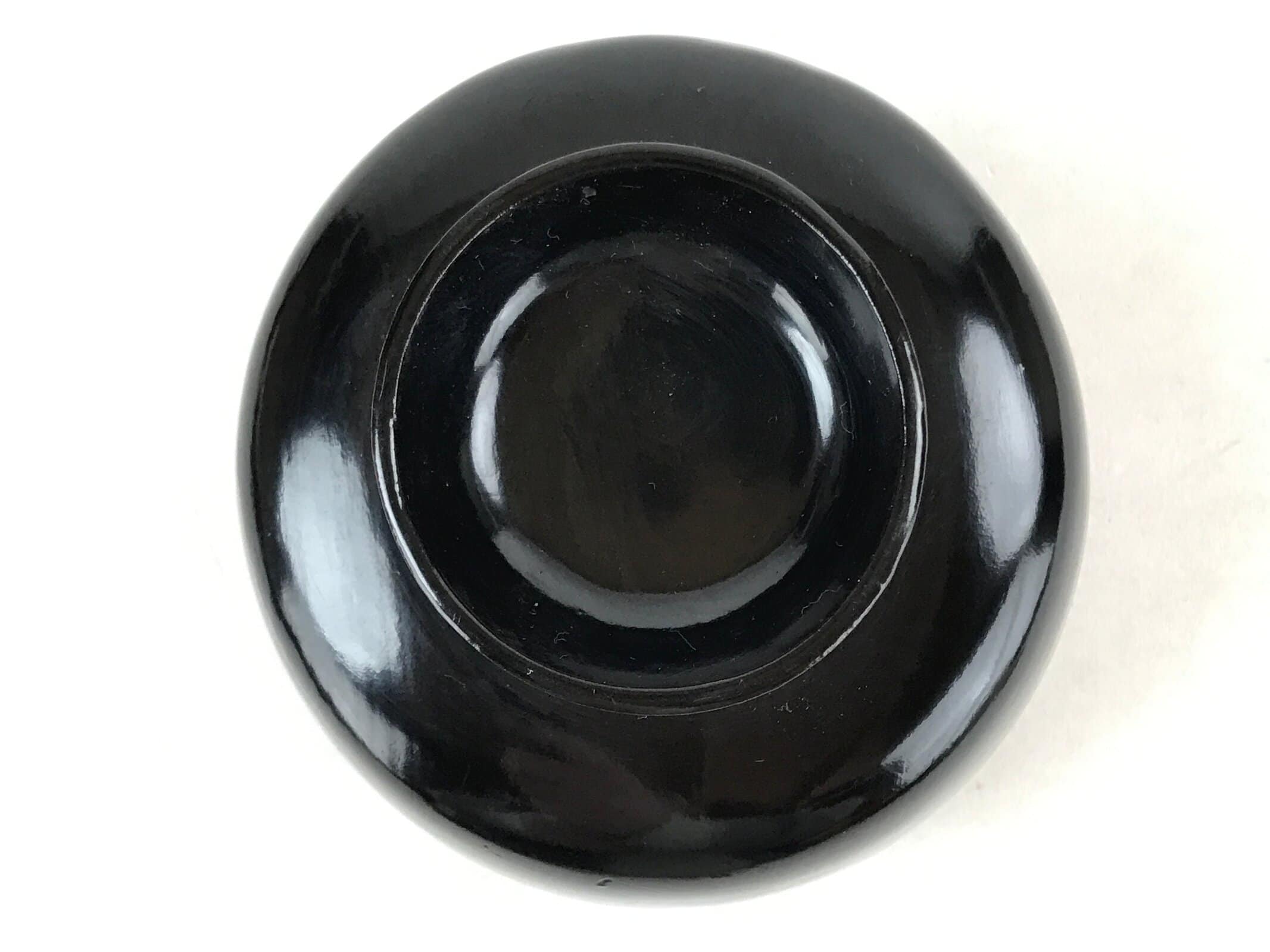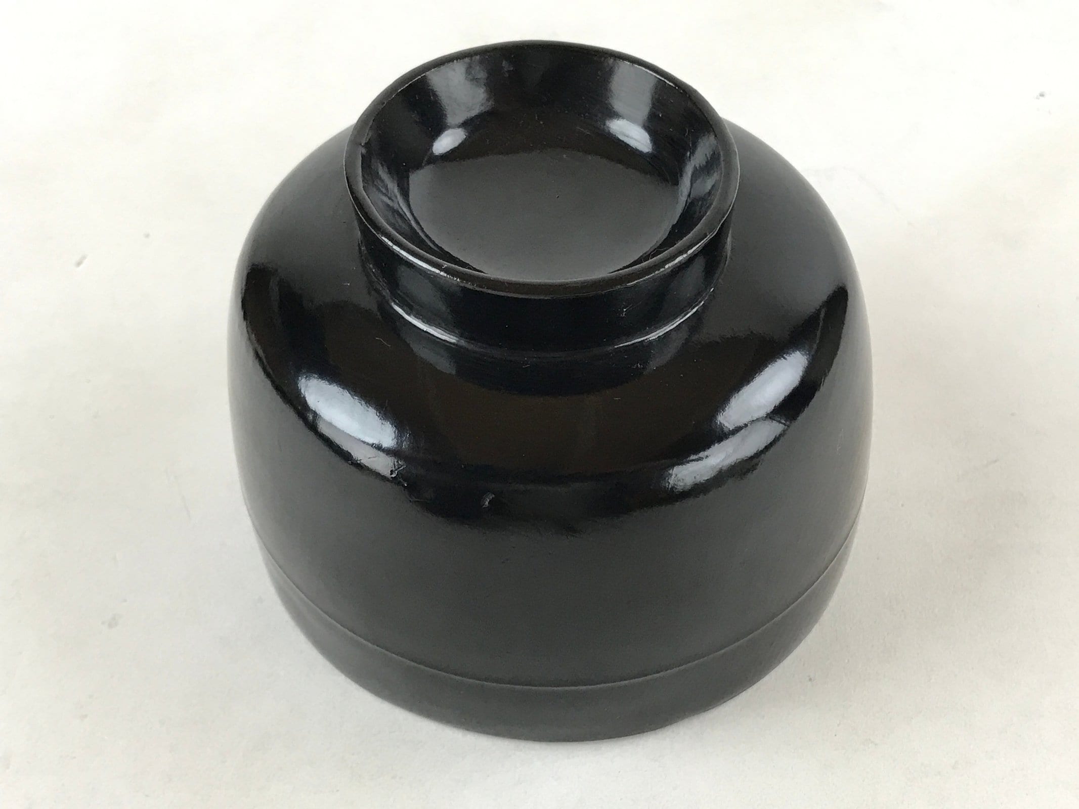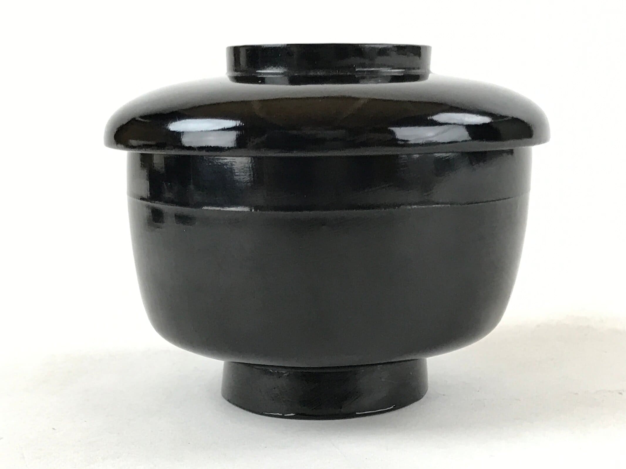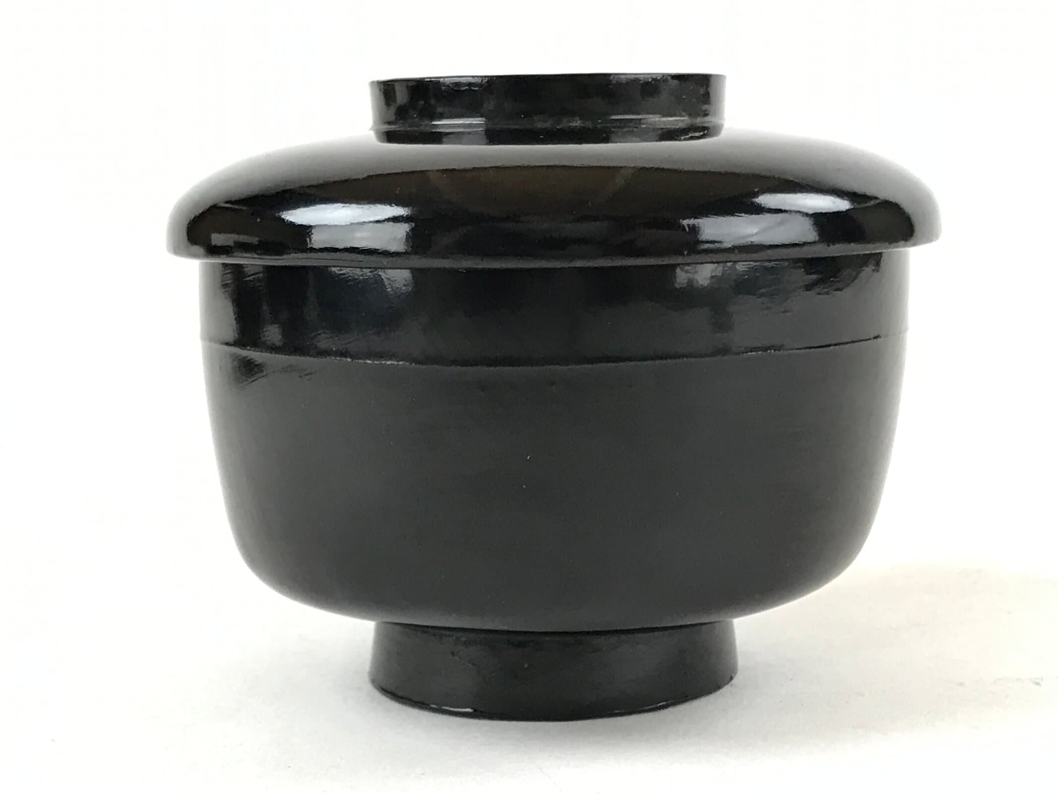 An iconic glossy black outside and bright red inside, this vintage lacquered wooden bowl with a lid is a classic addition to any traditional Japanese dinnerware set. This particular bowl is considered an owan, a bowl made for soups or rice. It can also be used for other dishes. The bowl itself is easy to hold while eating and the lid fits loosely on the top with an overhang.