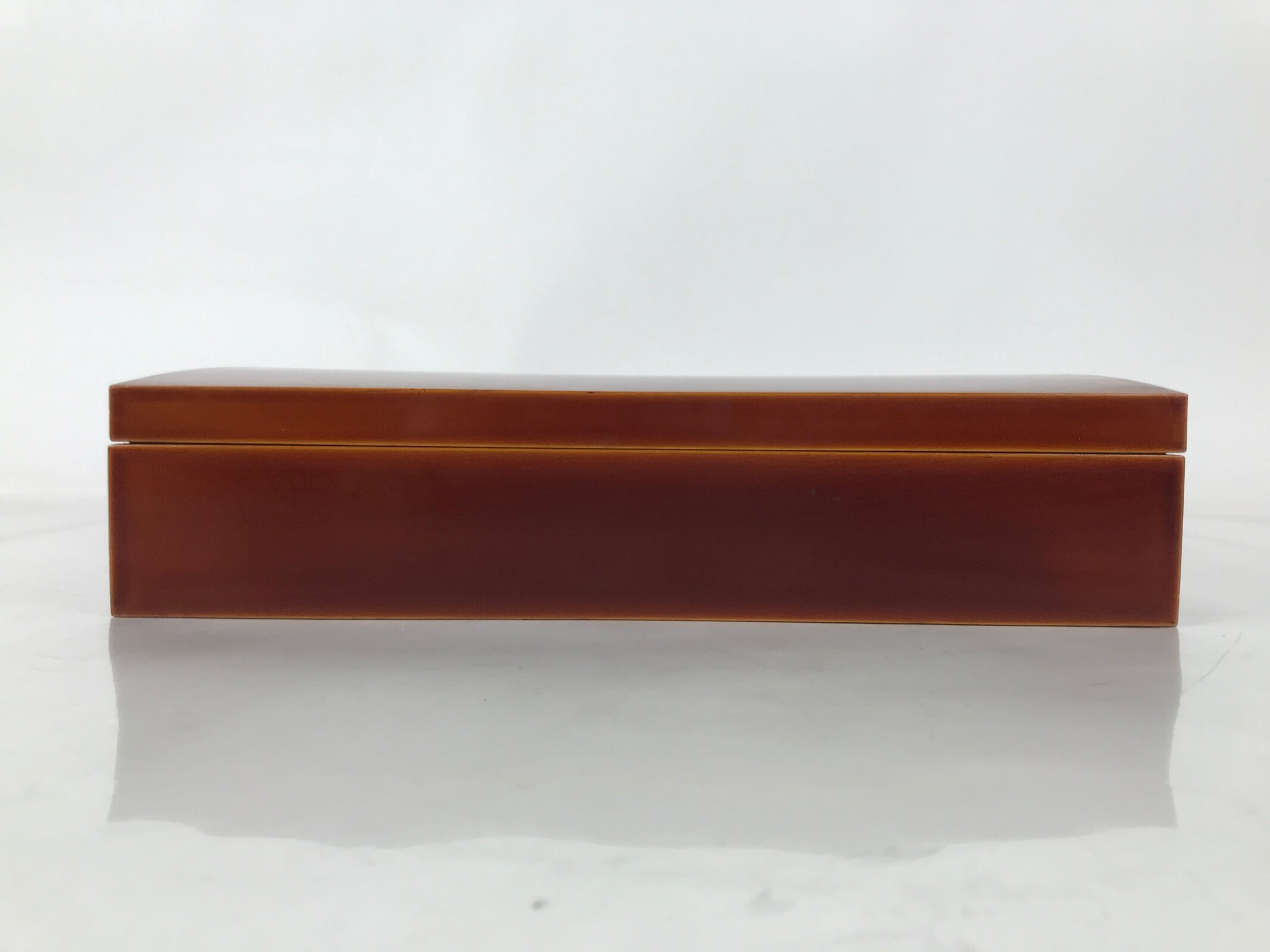 This classic caramel-brown Shunkei-nuri lacquer piece is lightweight and a beautiful decorative and functional addition to any home or office space. It features a simple lined design on the lid.