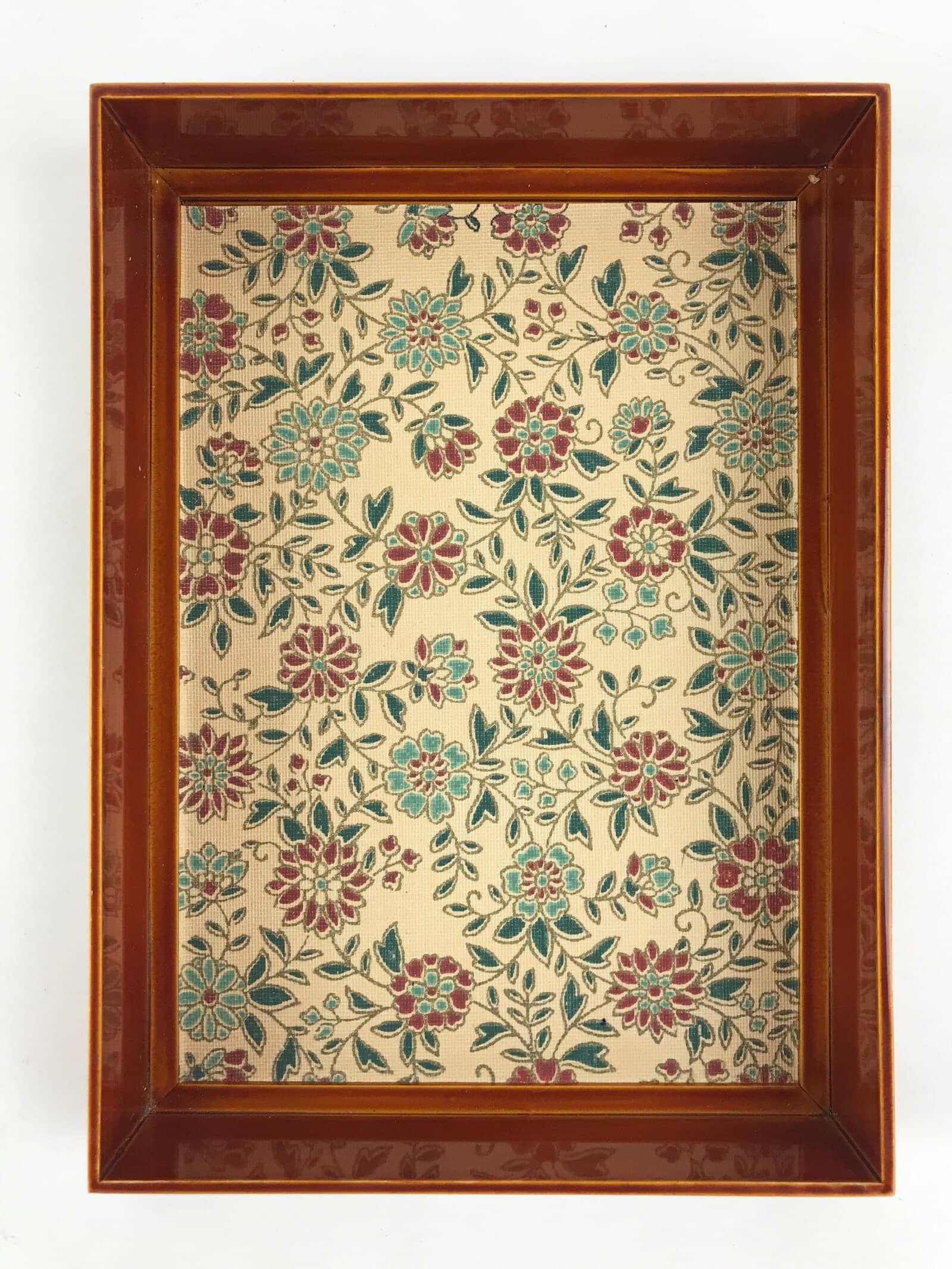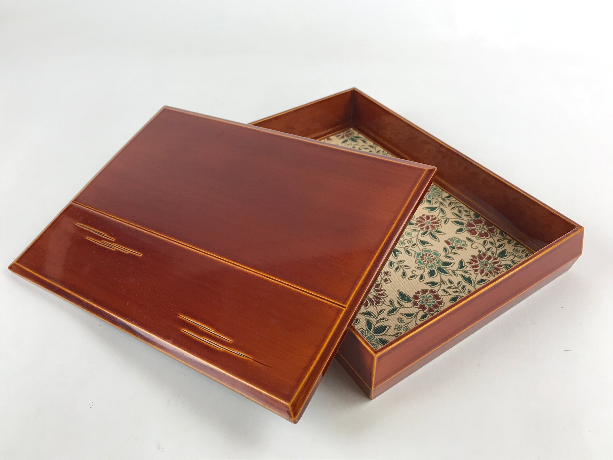 This classic brown shunkei-nuri lacquer piece is a beautiful decorative and functional addition to any home or office space. It features a simple lined design on the lid and inside is a unique floral fabric lining