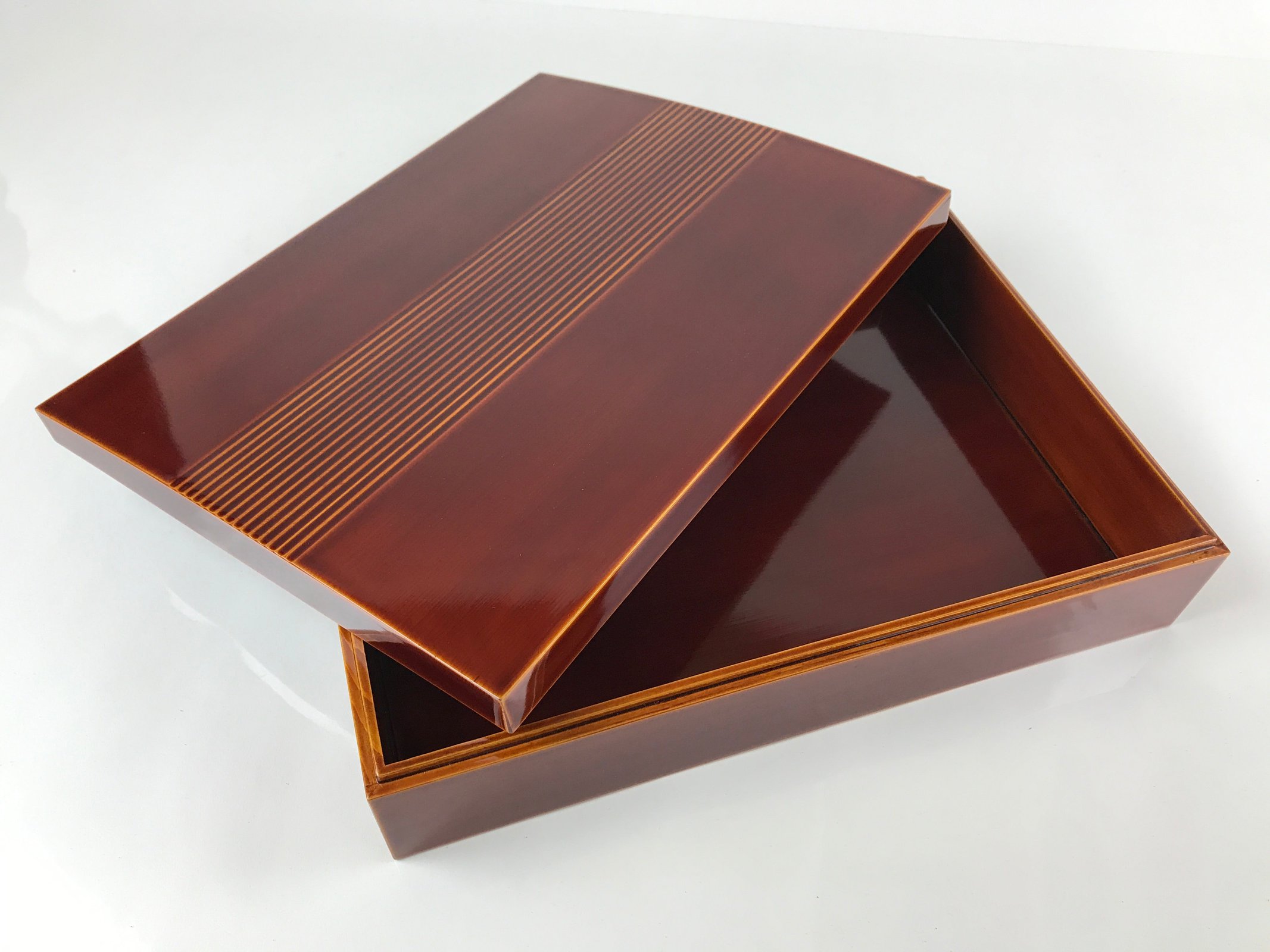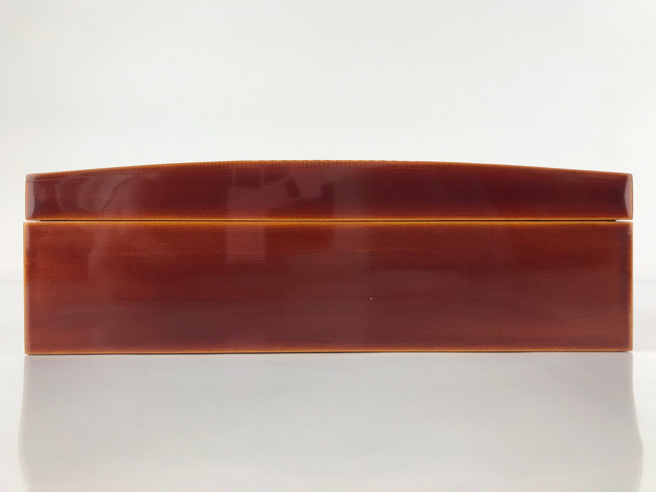 This classic caramel-brown shunkei-nuri lacquer piece is a beautiful decorative and functional addition to any home or office space. It features a simple lined design on the lid.