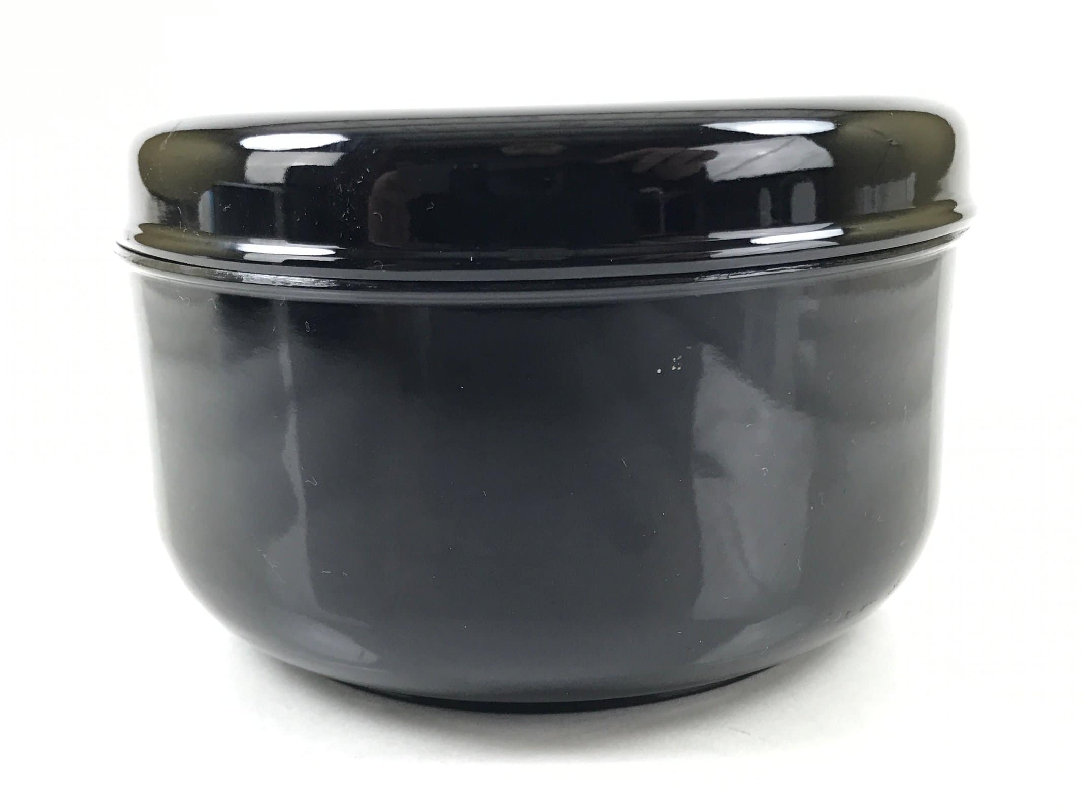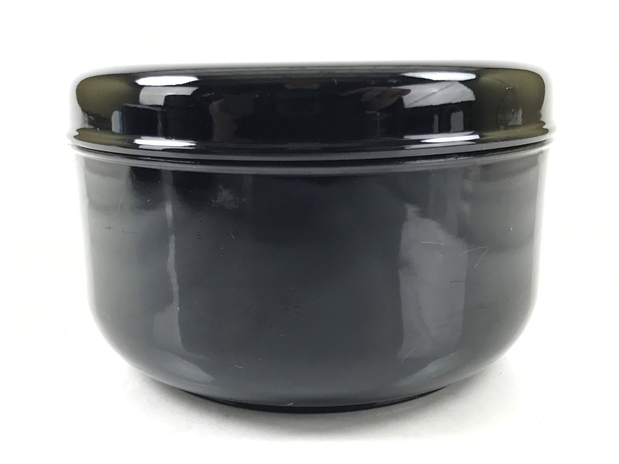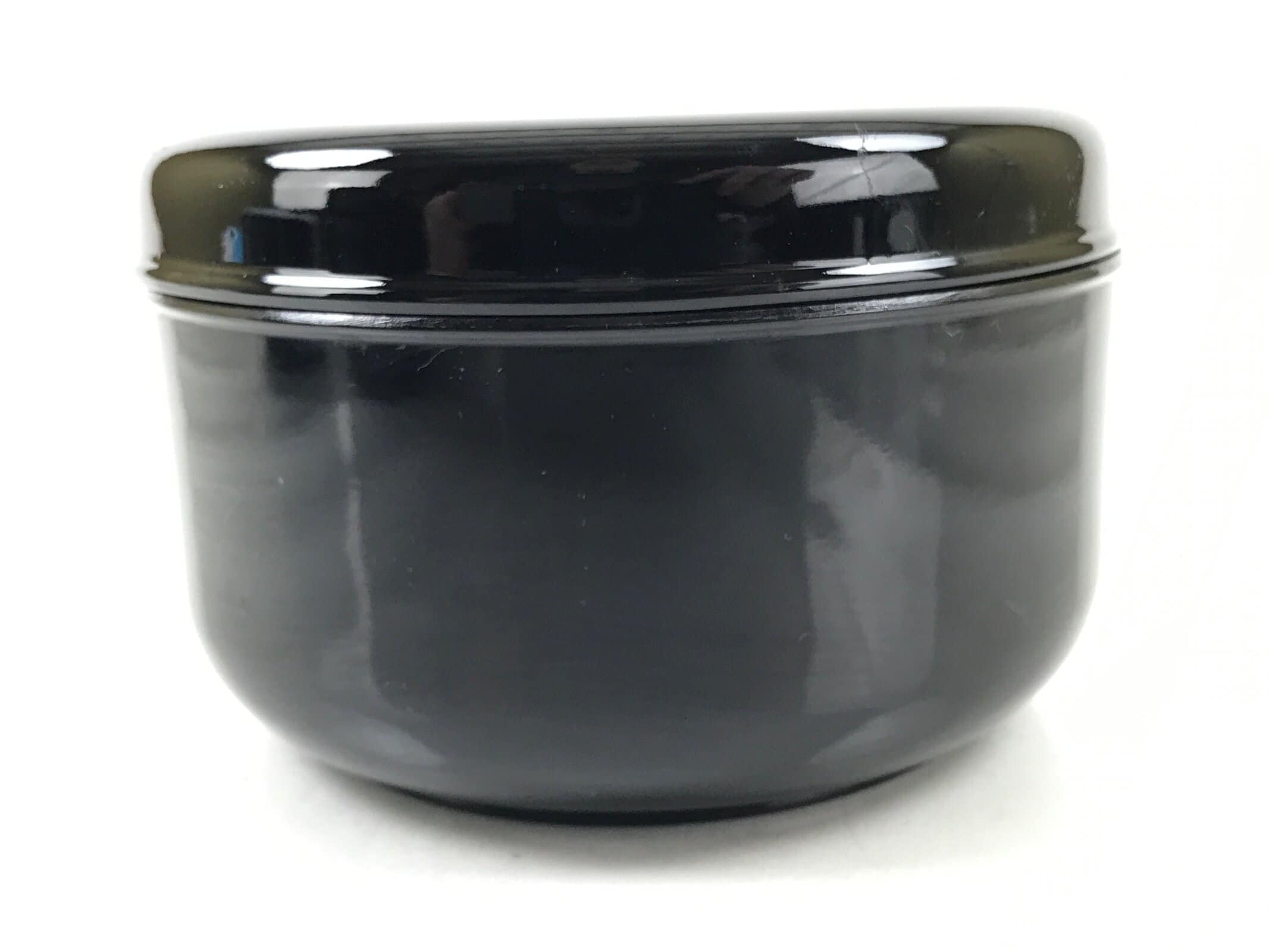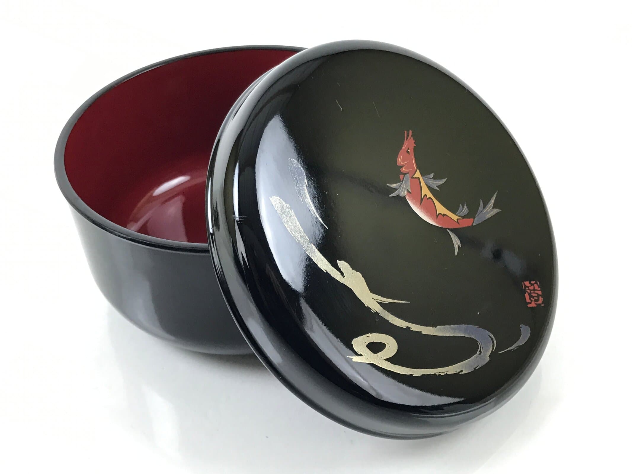 This is a vintage lidded Japanese rice container. Round and coated with a classic glossy black lacquer on the outside and red on the inside, this dish is used to hold rice/mixed rice during a kaiseki set meal. Due to its compact size, yet generous volume, it makes an excellent bento box as well. The lid features a red fish jumping out of water.