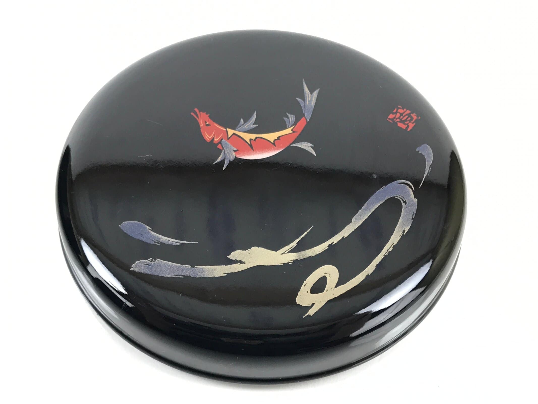 January 24, 2026Japanese Lacquered Wooden Lidded Rice Container Vtg Bento Box Black Fish L370