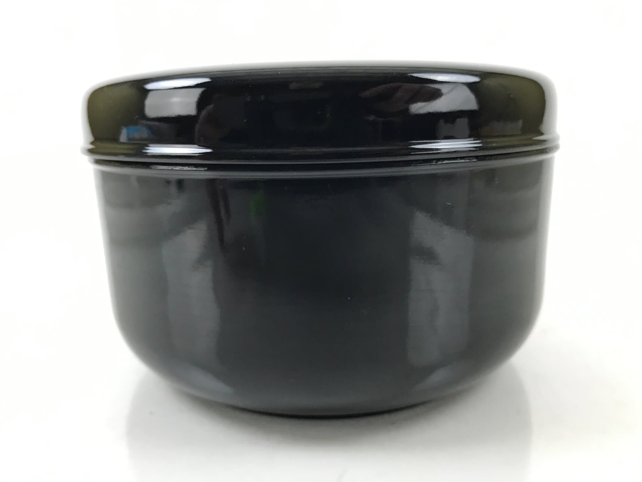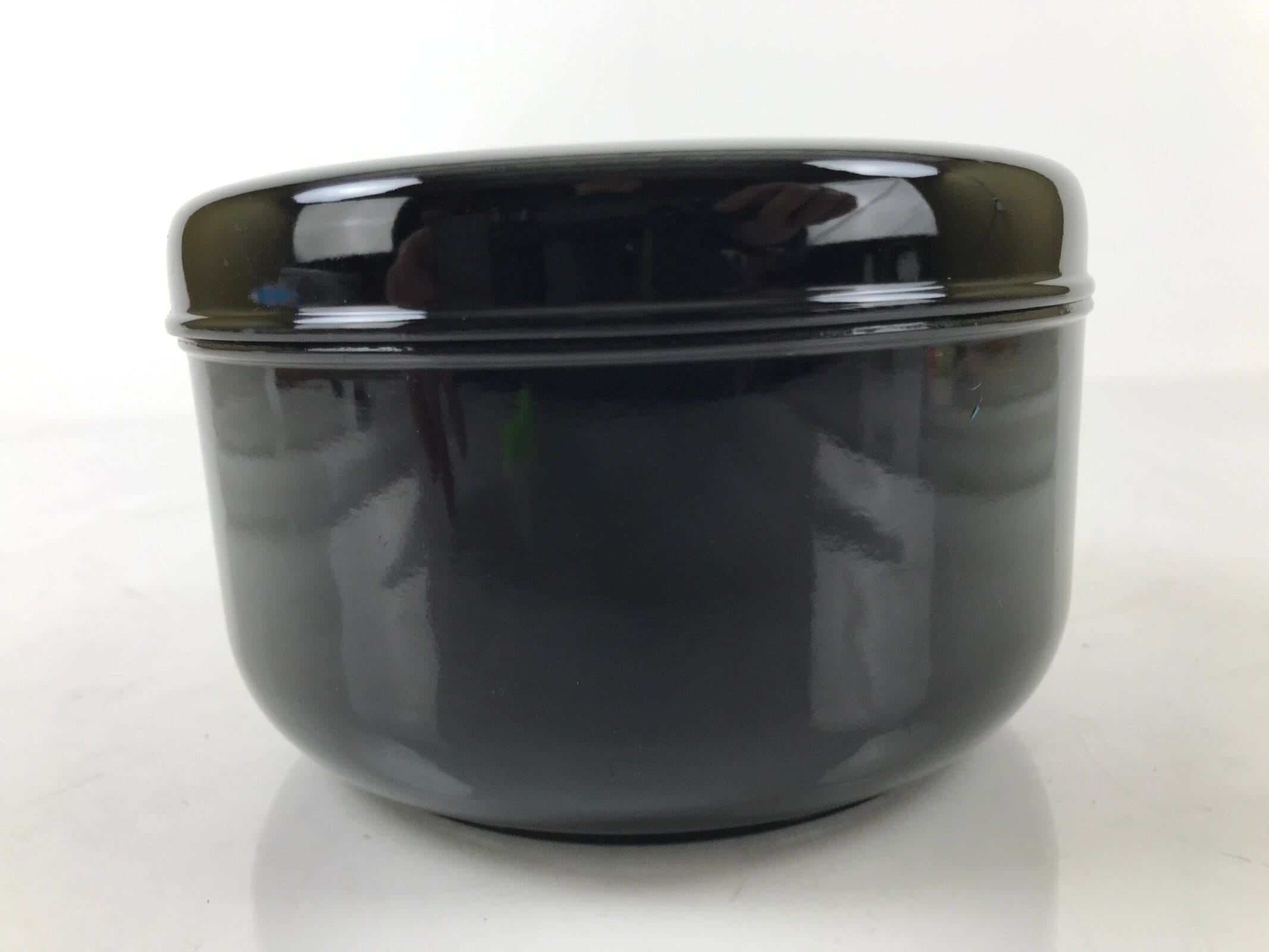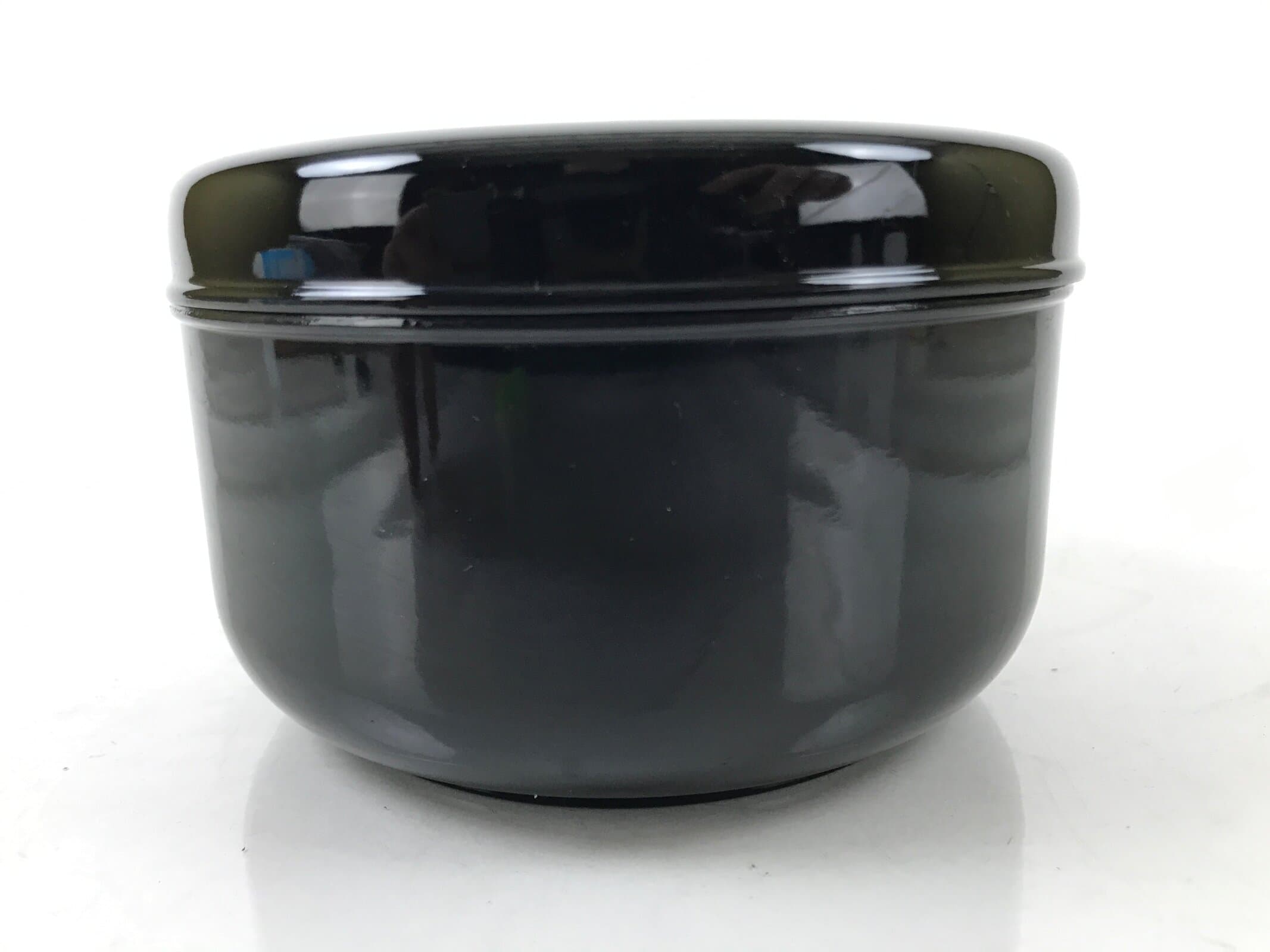 This is a vintage lidded Japanese rice container. Round and coated with a classic glossy black lacquer on the outside and red on the inside, this dish is used to hold rice/mixed rice during a kaiseki set meal. Due to its compact size, yet generous volume, it makes an excellent bento box as well. The lid features a red fish jumping out of water.