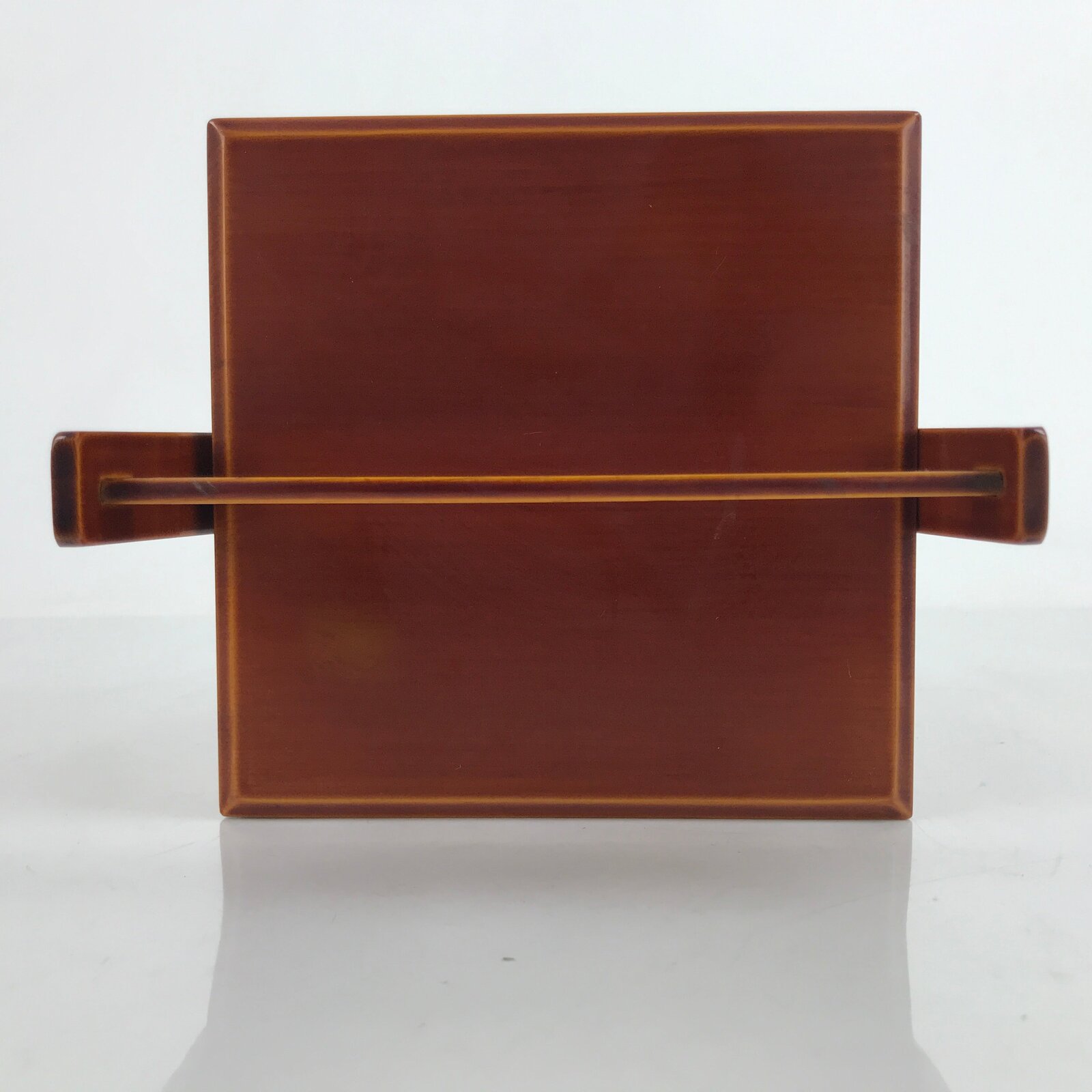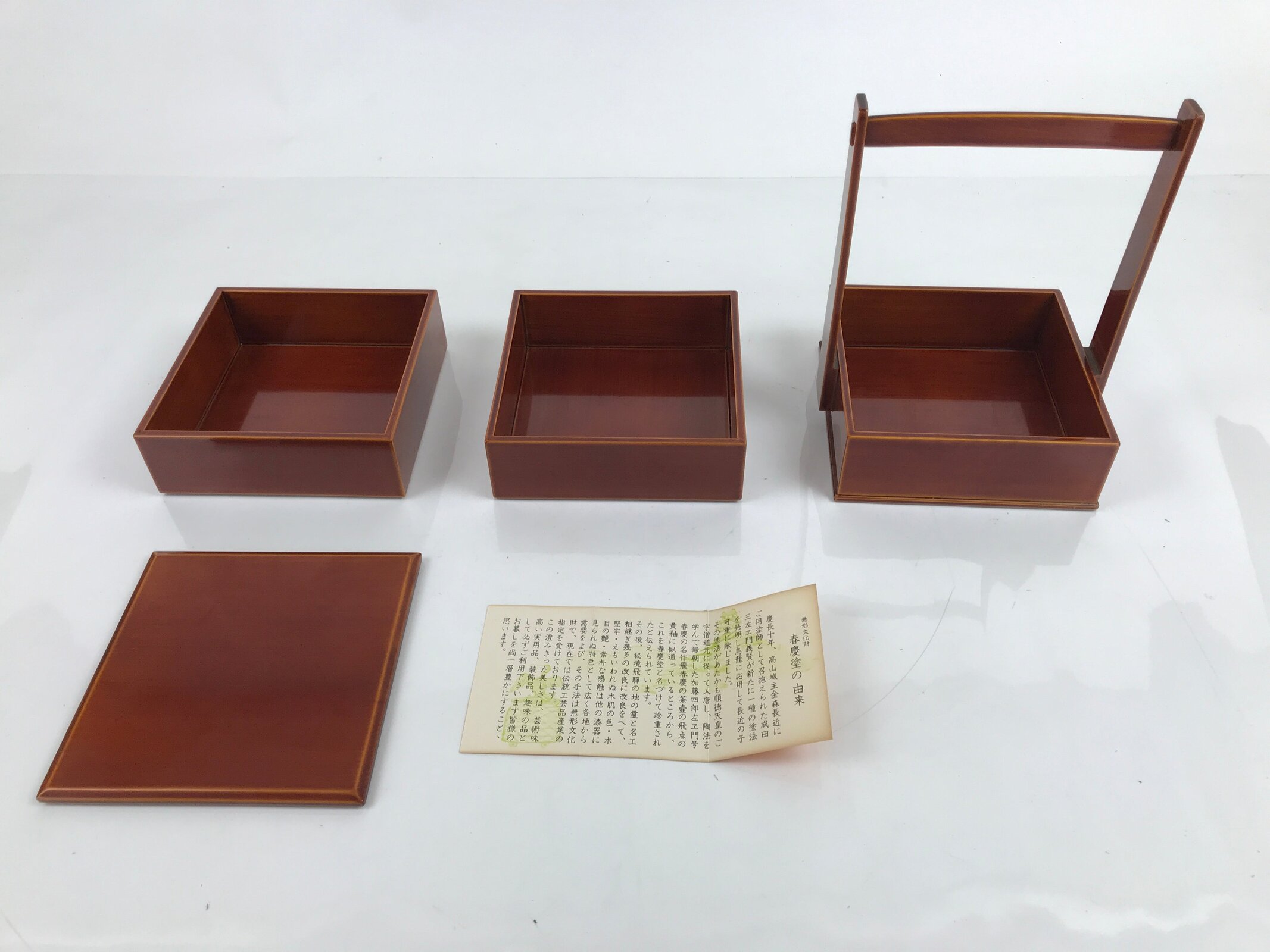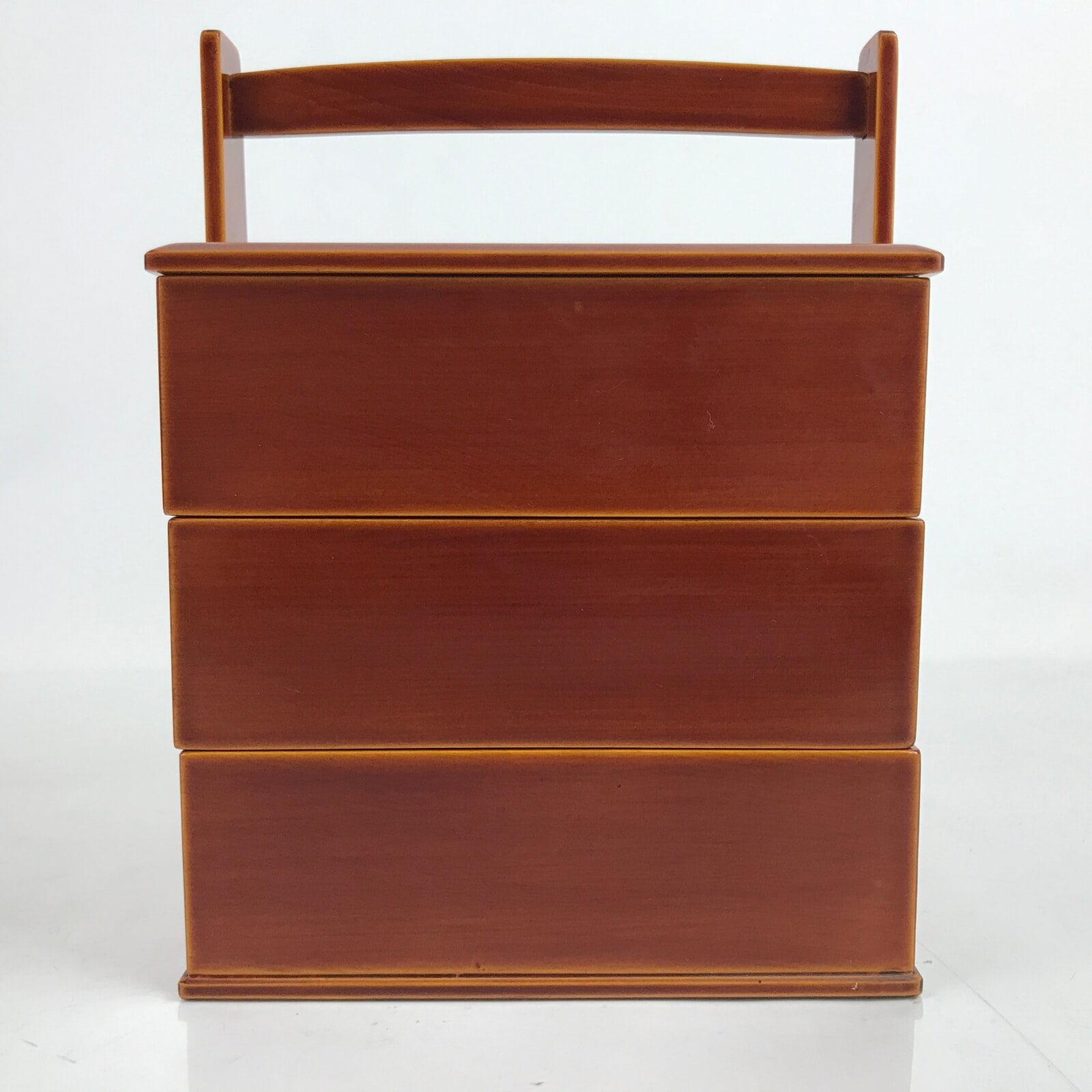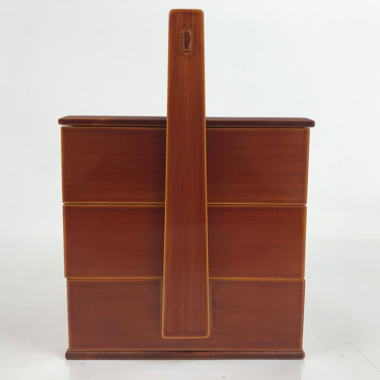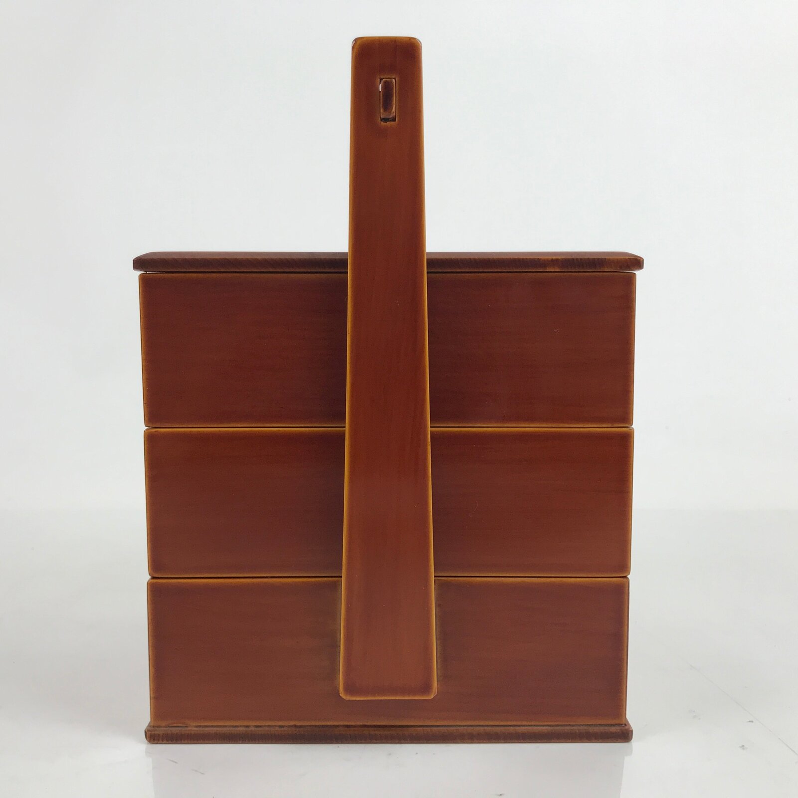 This is a Japanese vintage lacquered bento lunch box, or jubako. A caramel brown in the Hida Shunkei style that is simple with no added designs, it has three tiers, the bottom being attached to the frame. It has a handle for easy carrying. While it can be used for small meals, it can also be used as a sweets container, or kashiki for sencha and tea ceremonies. It comes with a small folded pamphlet about the history of Shunkei lacquerware.