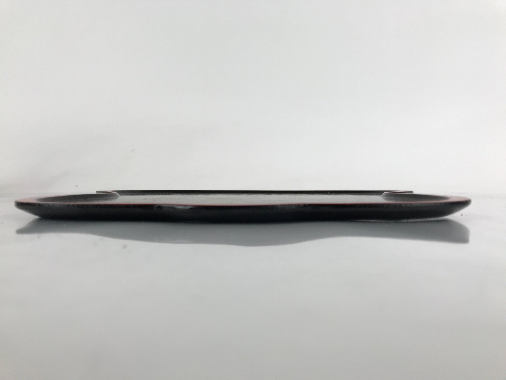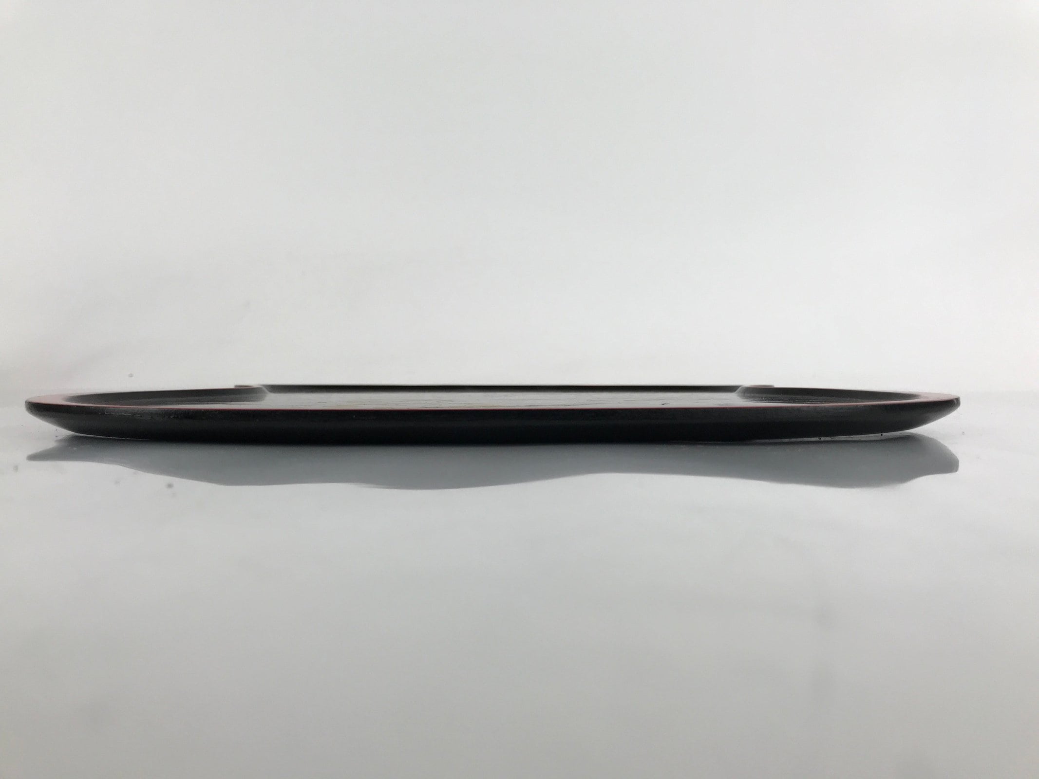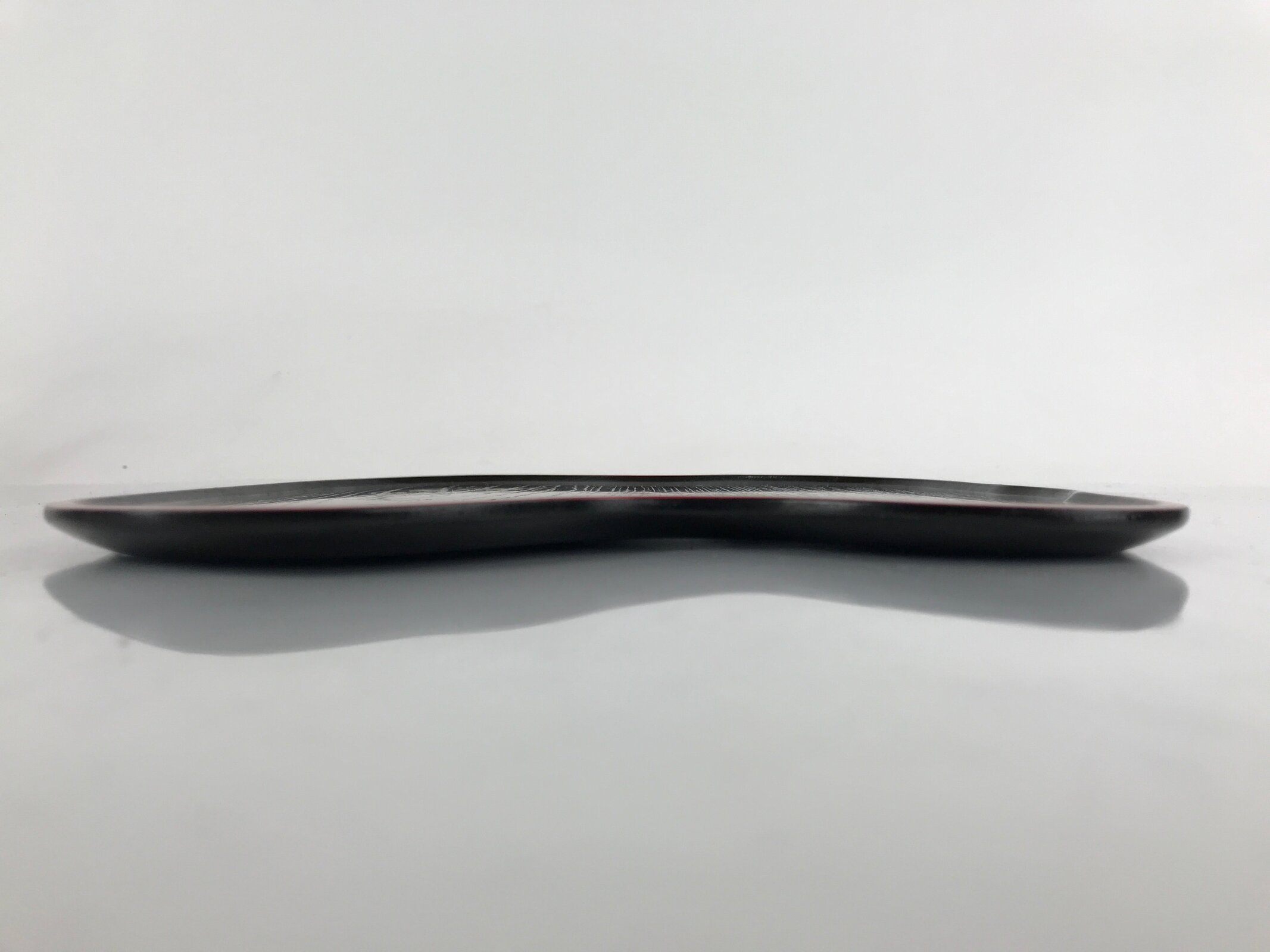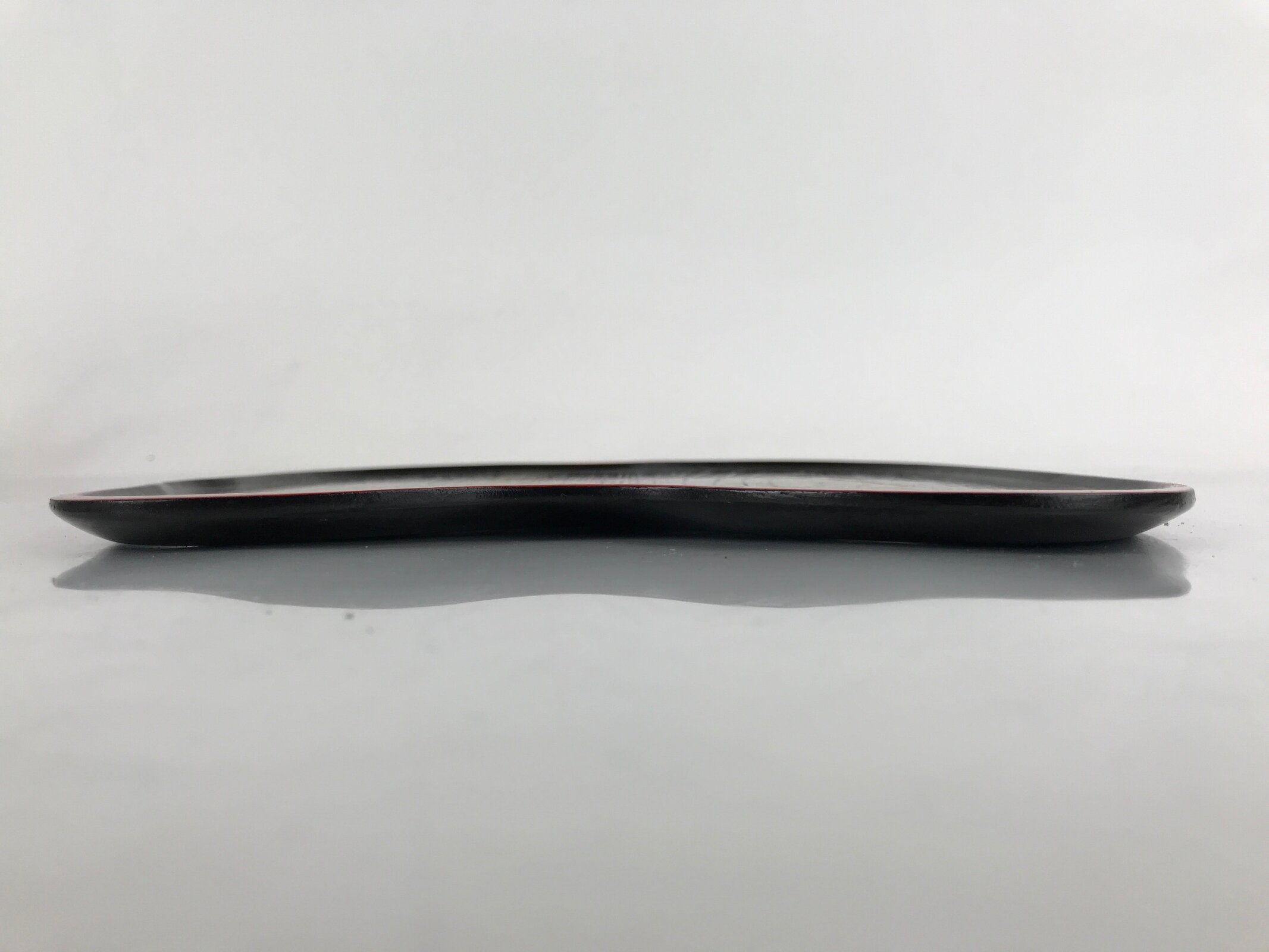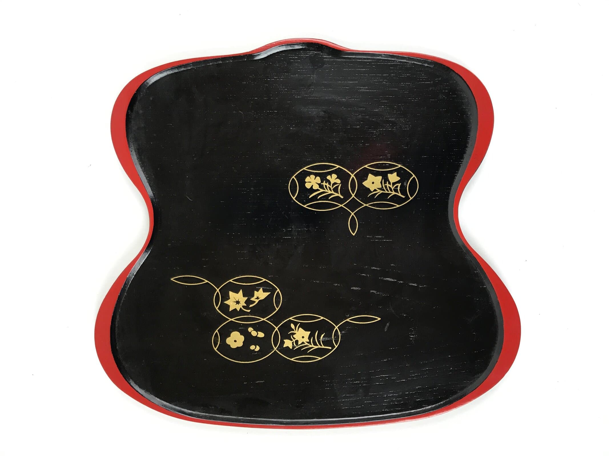 Coated in gorgeous and glossy black lacquer with a red lacquer edge, this hyotan gourd-shaped serving tray is thin and lightweight. It has traditional gold makie designs on it. This particular tray is used during tea ceremony for serving traditional wagashi sweets.