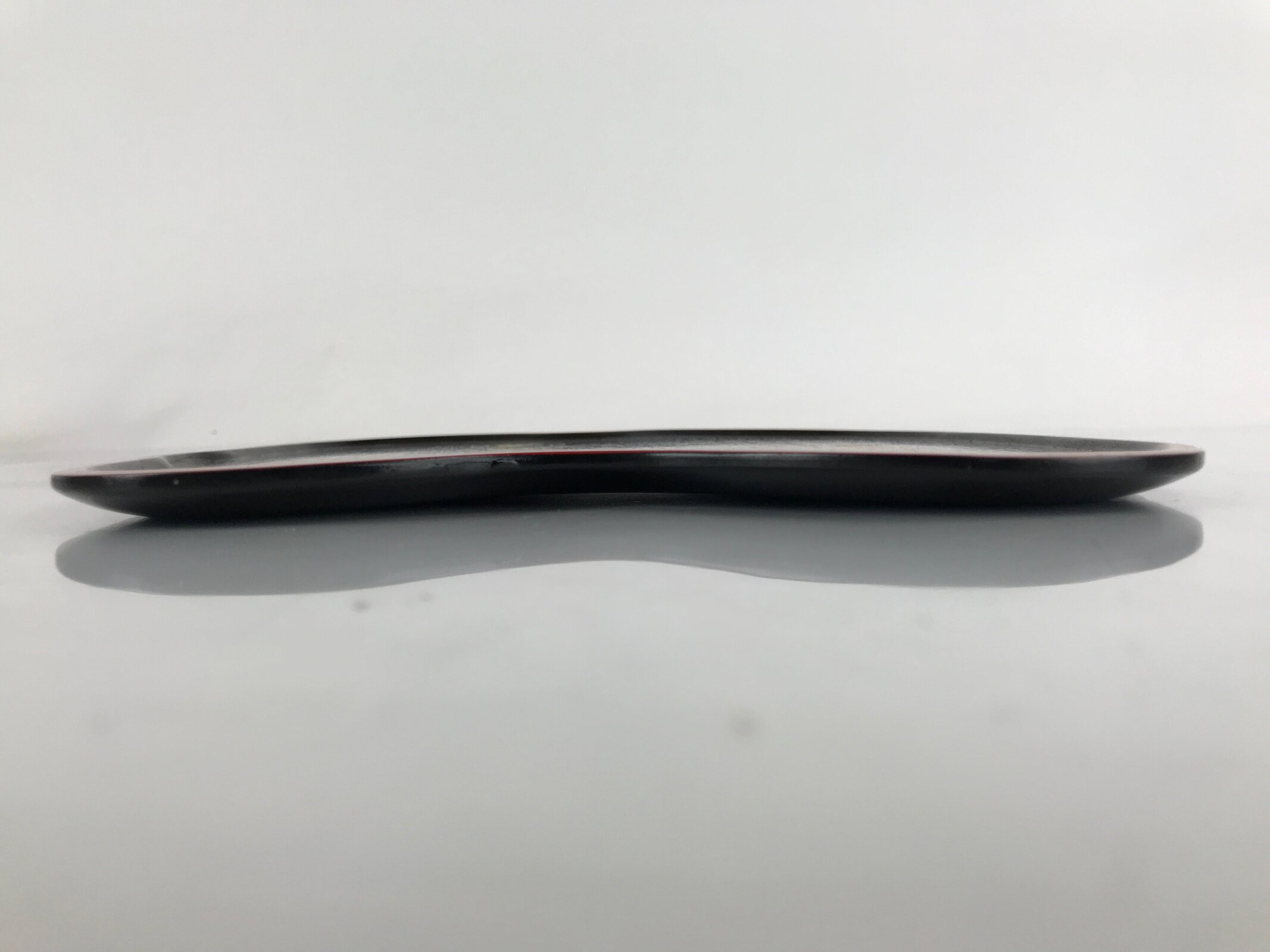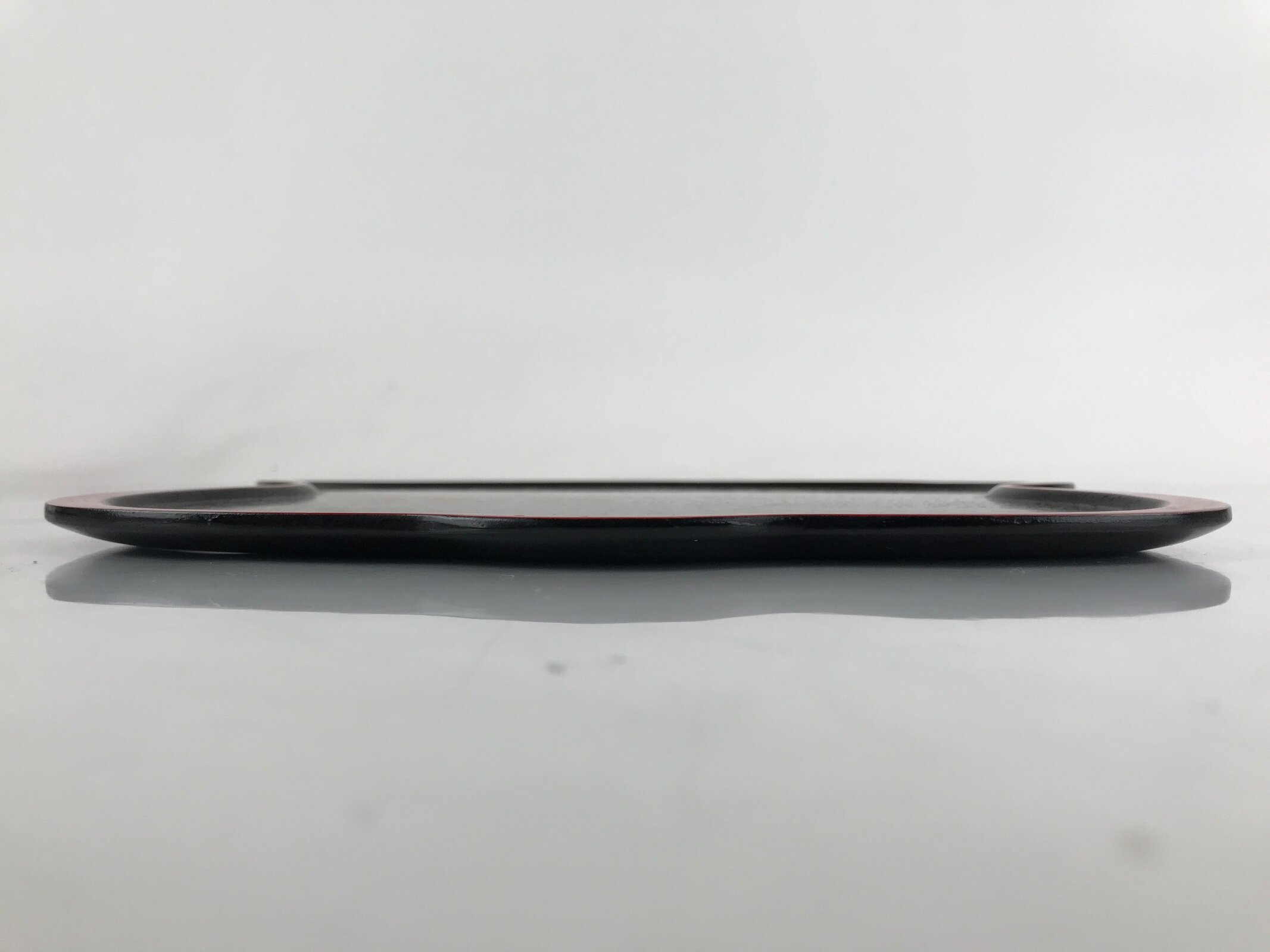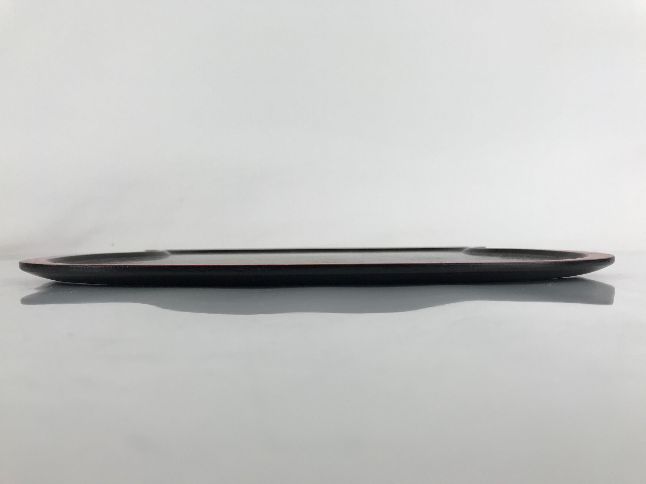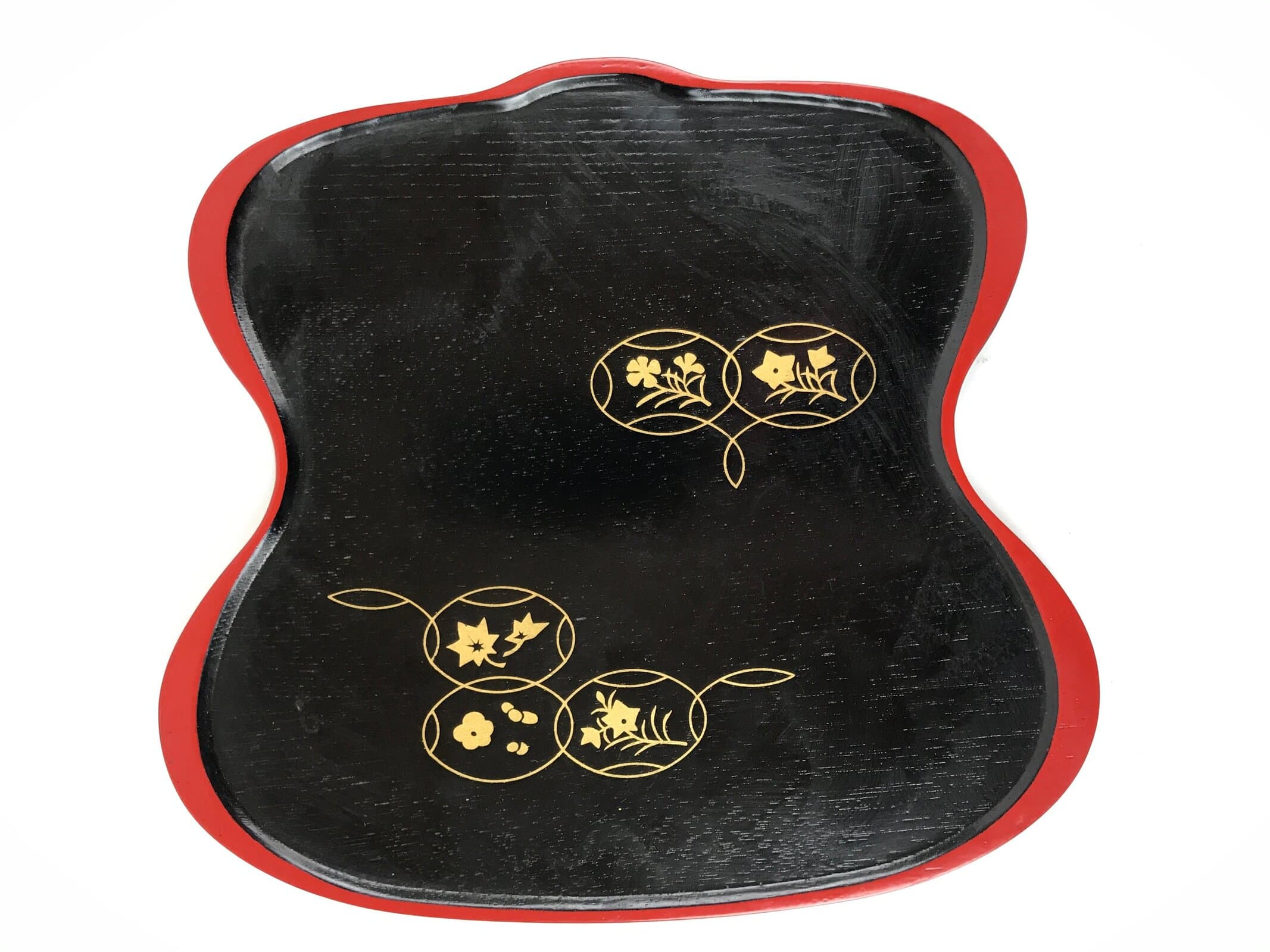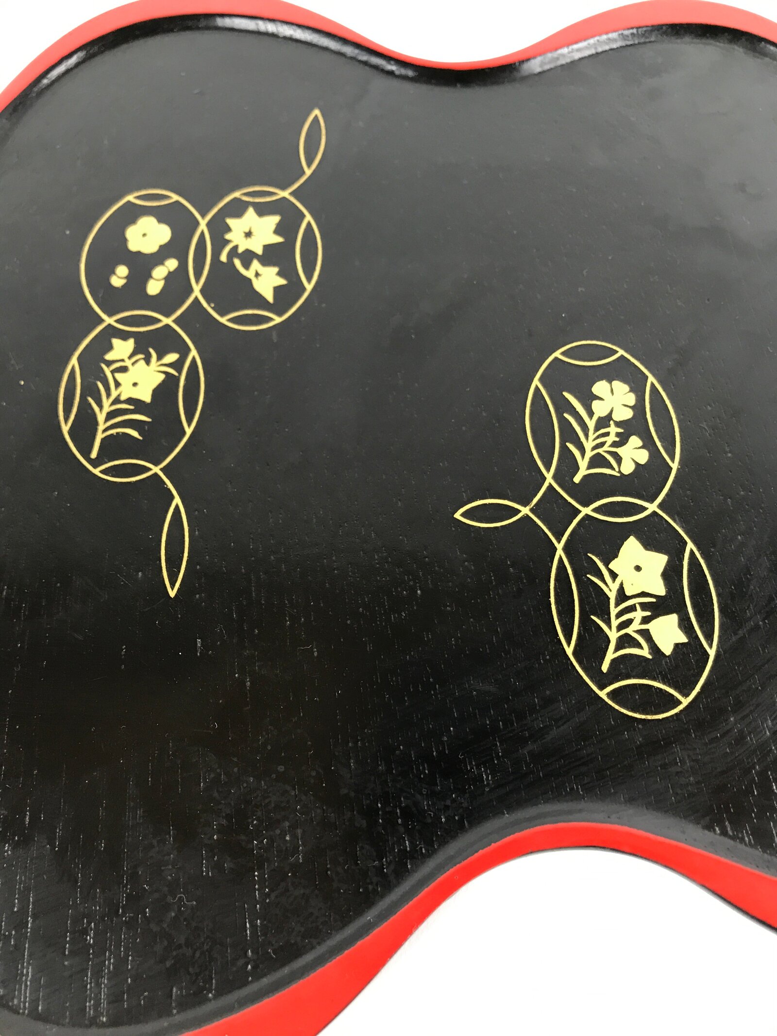 Coated in gorgeous and glossy black lacquer with a red lacquer edge, this hyotan gourd-shaped serving tray is thin and lightweight. It has traditional gold makie designs on it. This particular tray is used during tea ceremony for serving traditional wagashi sweets.