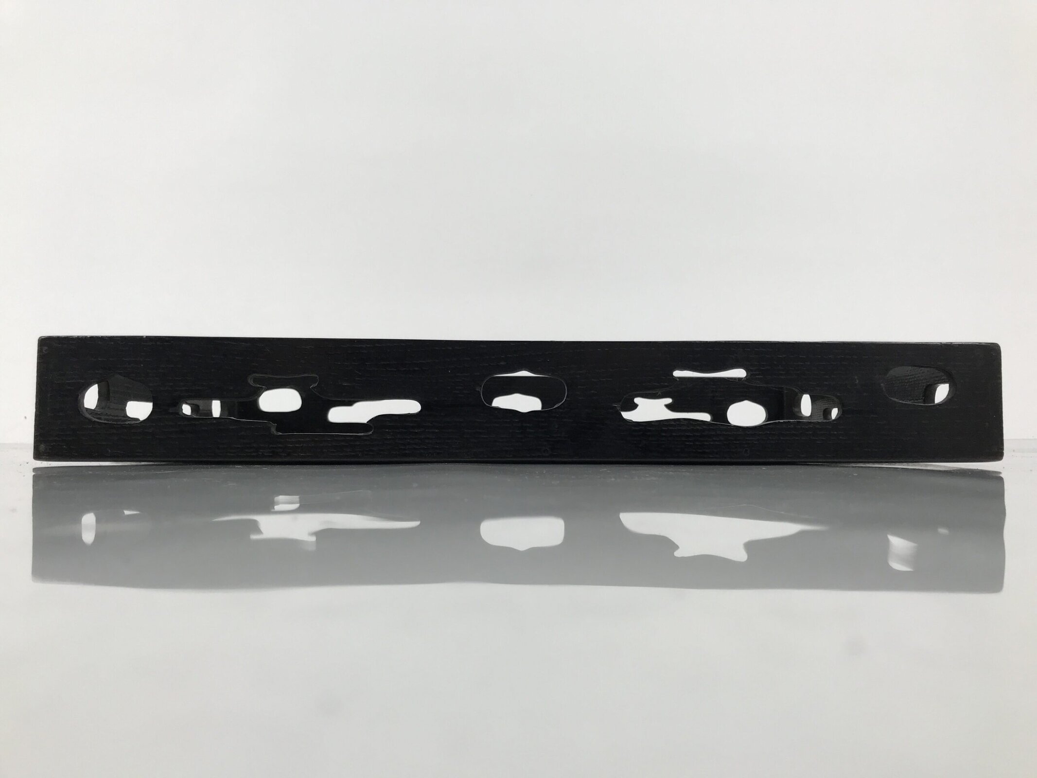 Coated with a thin layer of black lacquer, giving it a black/brown look, this Japanese serving tray is made of solid wood. It is rectangular with slightly raised sides so drinks cannot easily slide off, and it has a bold line design on the top surface. The sides have cutout oval and cloud-like designs.