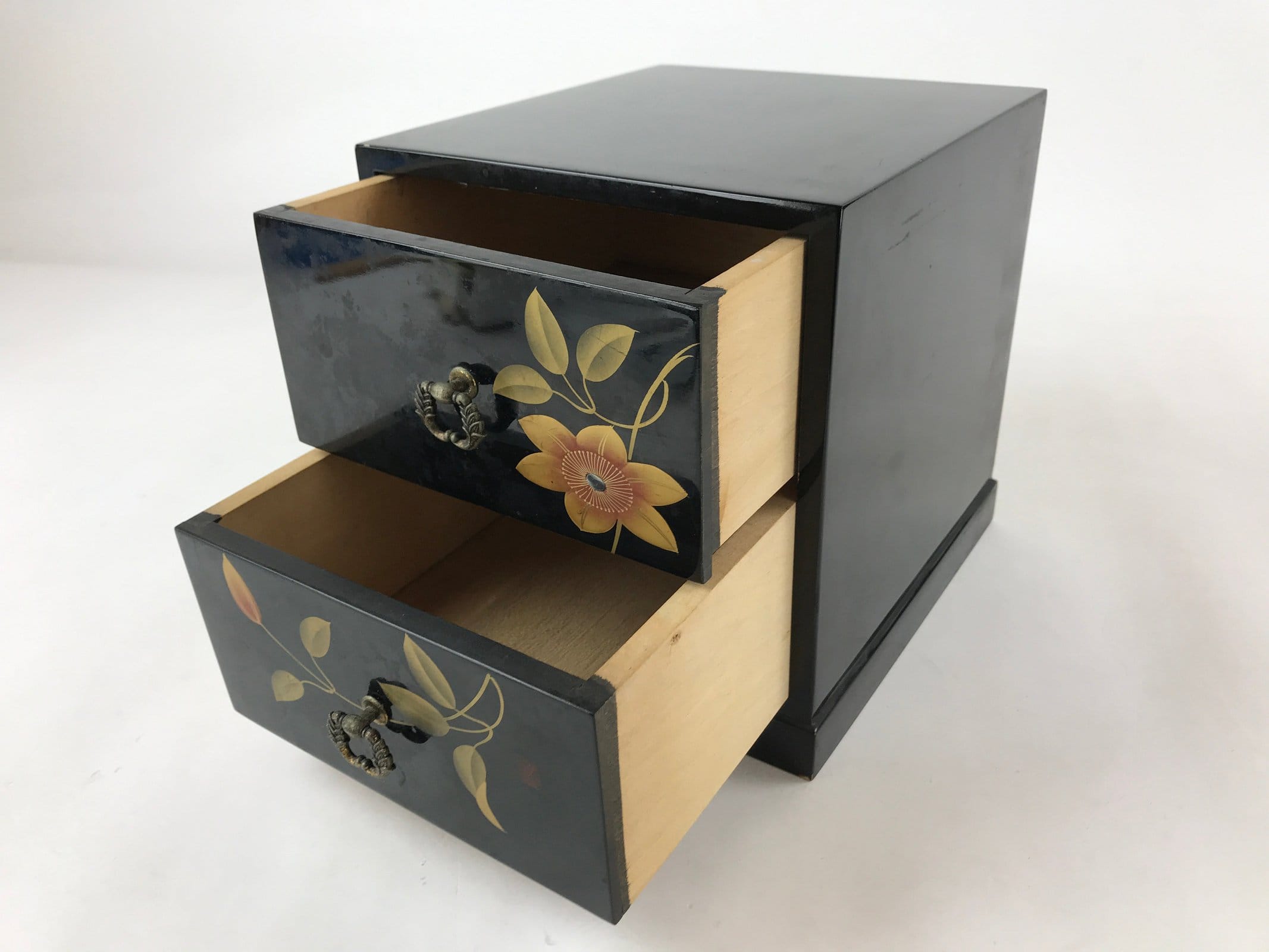 This is a Japanese sewing box, also called Haribako. Lacquered with classic glossy black, it is decorated with a makie flower and leaves. The center of the flower also contains raden (mother-of-pearl/abalone shell). This tansu chest has two drawers with decorative metal hardware. This beautiful piece can also be used for storing sewing supplies, jewelry, or other trinkets.