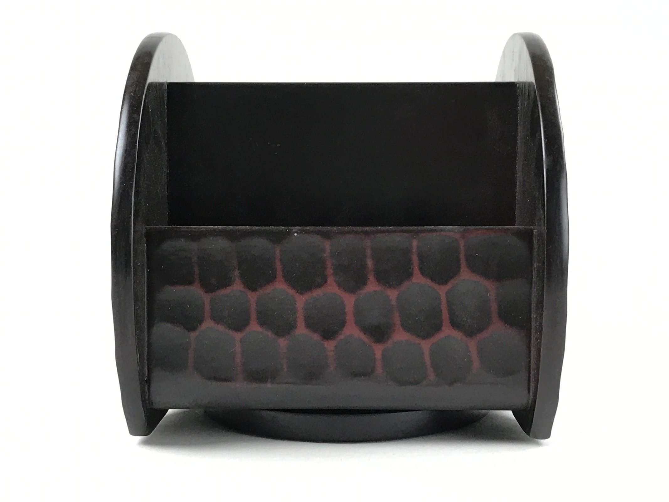 This is a vintage Japanese tabletop or desk organizer made of wood. It is a dark brown in the kamakurabori style (hammered/carved pattern). On one side is a carving of a small cartoonish dog. It contains three compartments accessible from the top. This item turns when pushed and is ideal for storing stationary, arts and crafts tools, and other miscellaneous items. The original box is included.