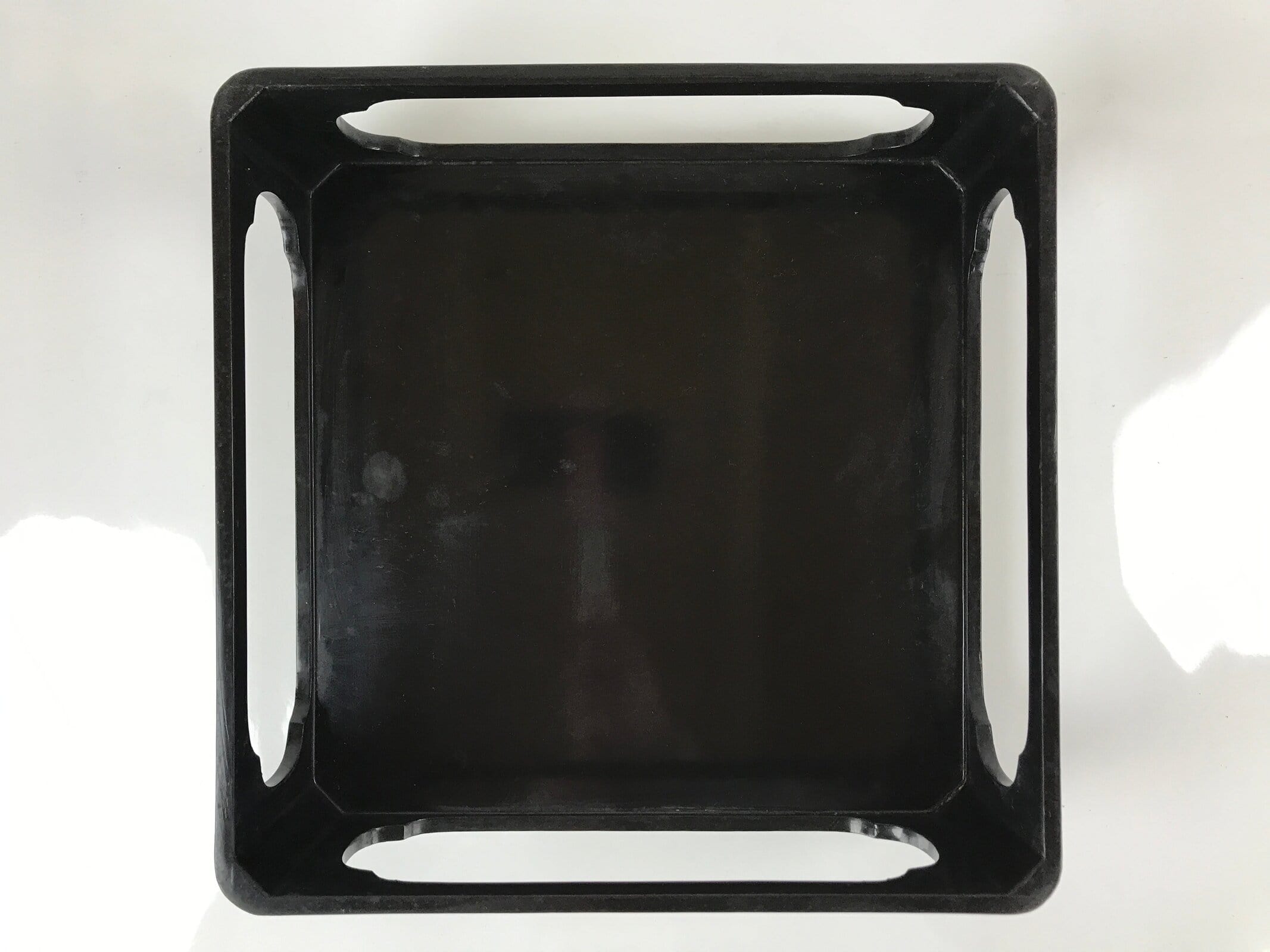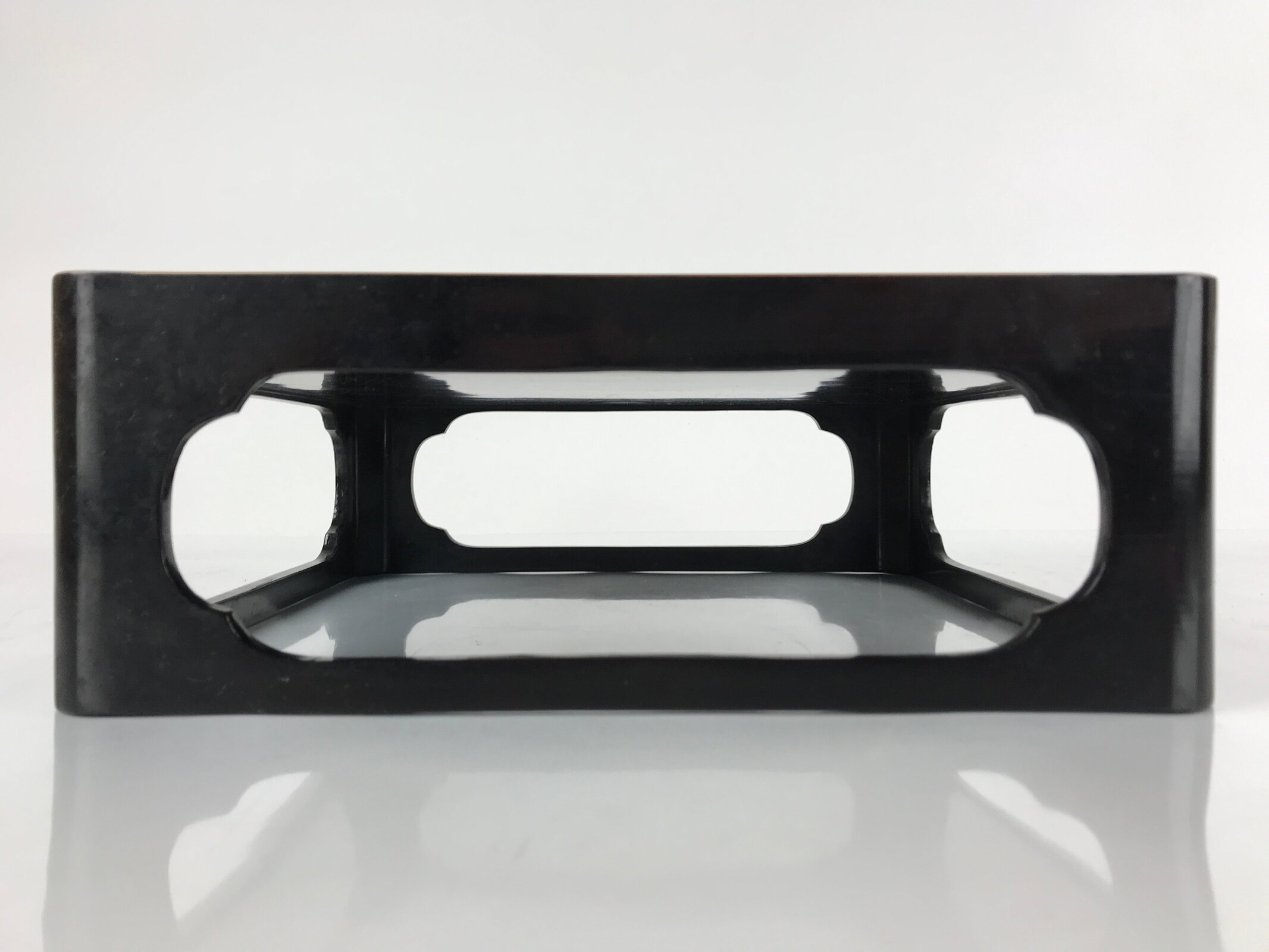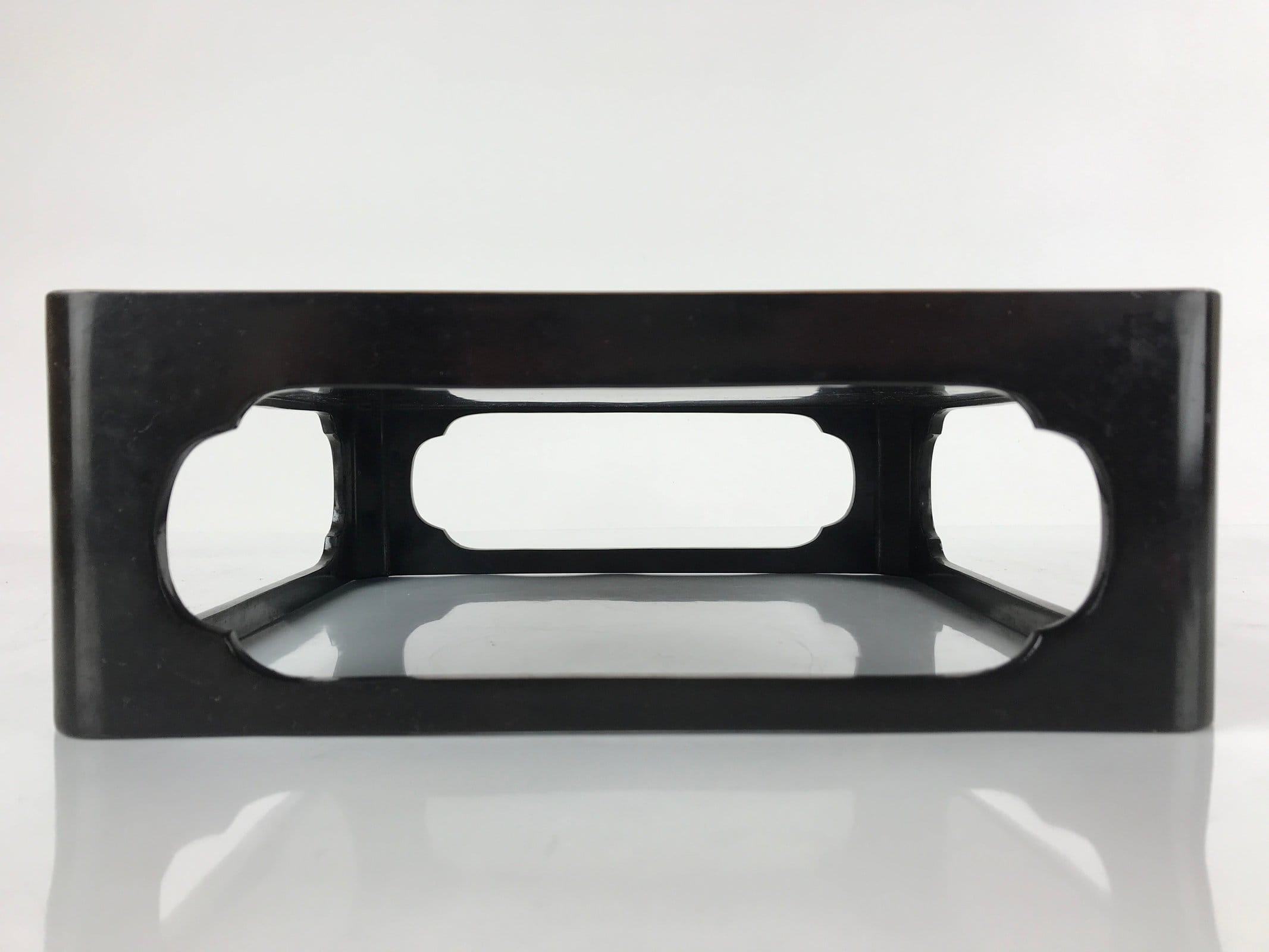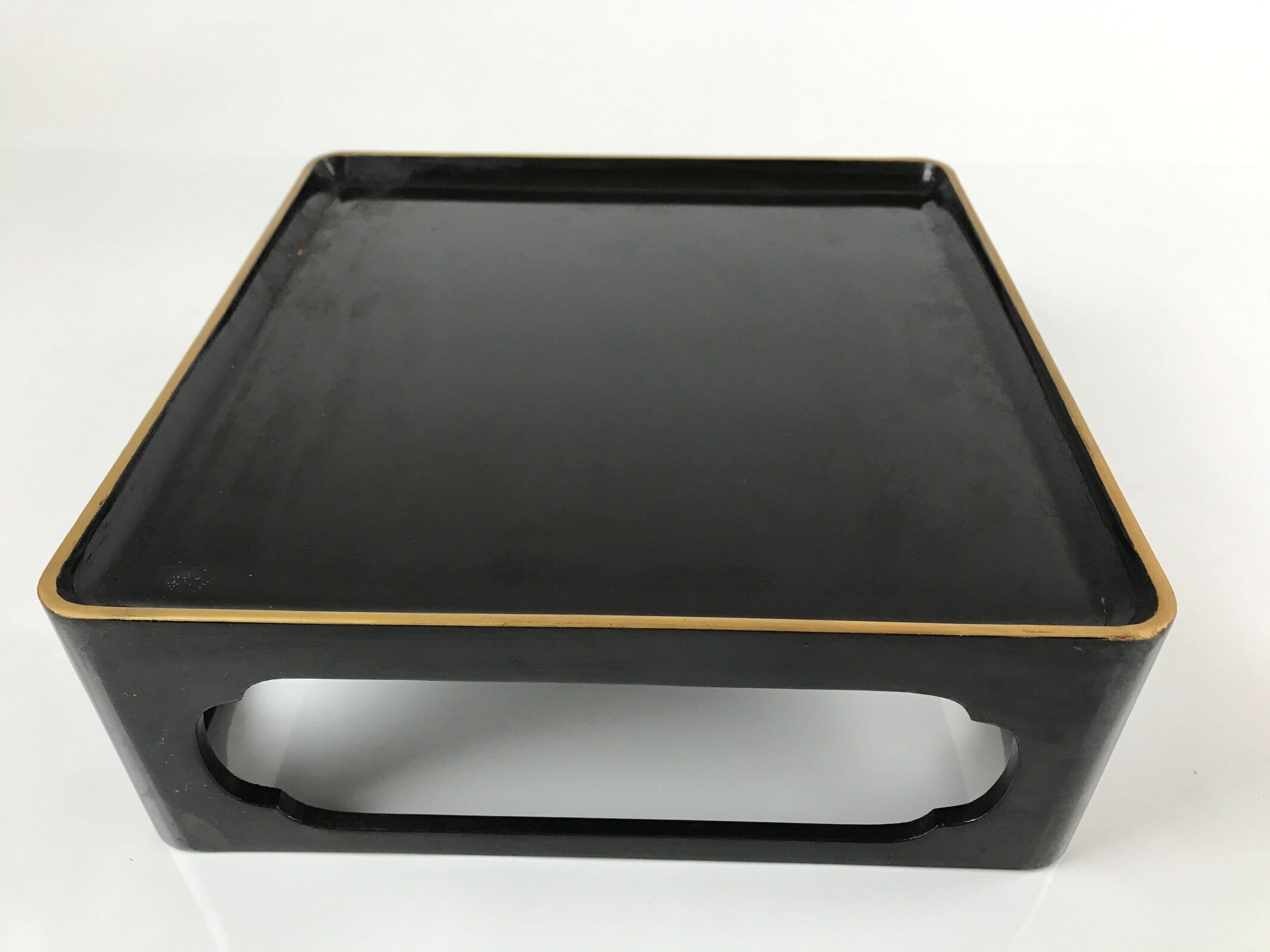 This is a vintage Japanese lacquered wooden table or Ozen. Painted with a glossy black lacquer and decorated with a gold rim, this low square table has four simple, decorative cut-out panels as legs perfect for a meal or display. This table comes with the original wooden storage box. The box opens with a lift-out sliding panel.