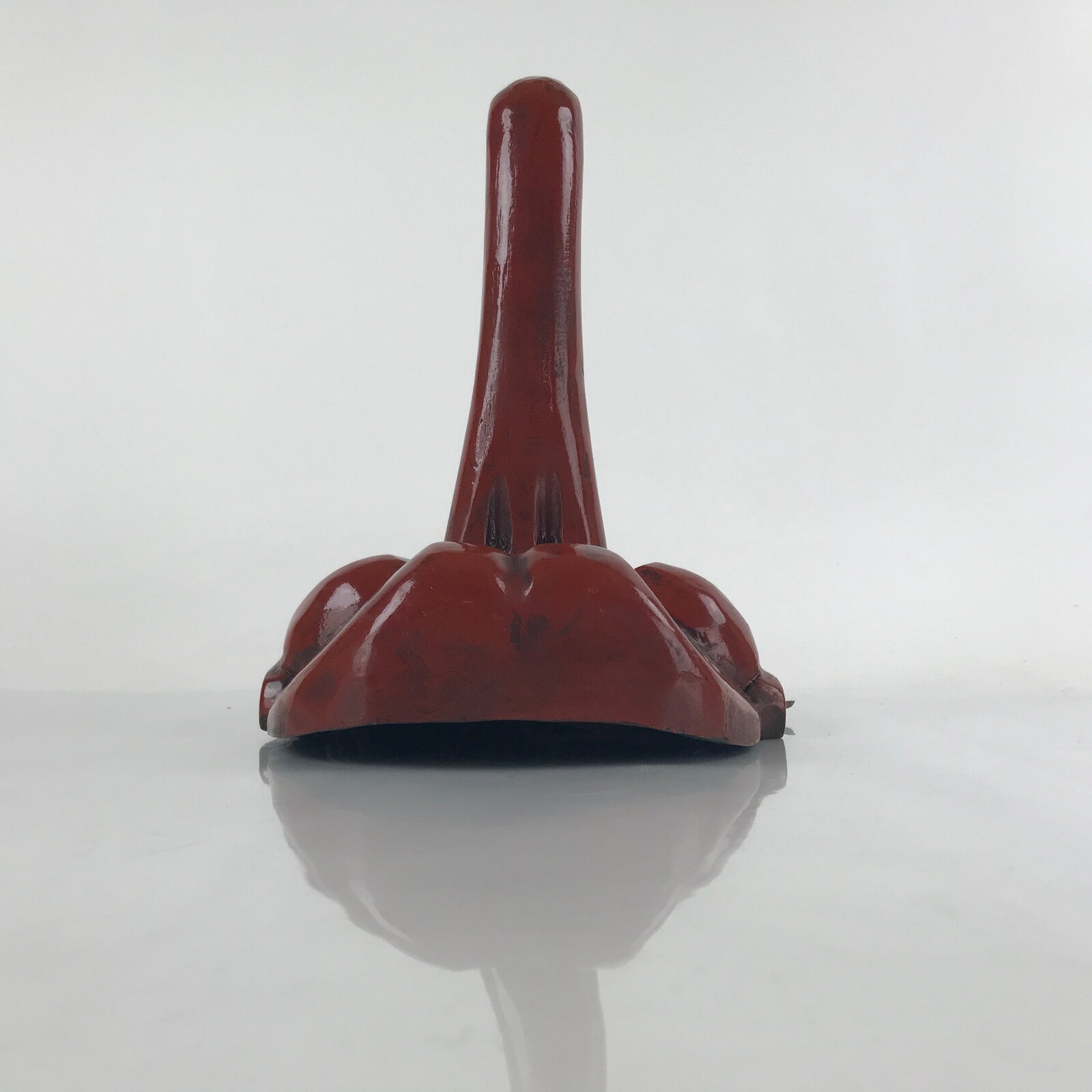 This is a Japanese lacquered wooden noh mask. This character is the face of a tengu, a mythical forest creature found in the Shinto belief. Known for their long noses and red faces, tengu are often depicted with wings and are said to have incredible skills with a sword. Neither really good-natured nor bad, these creatures are still considered dangerous. This large piece can be used for room decoration or shows and dances.