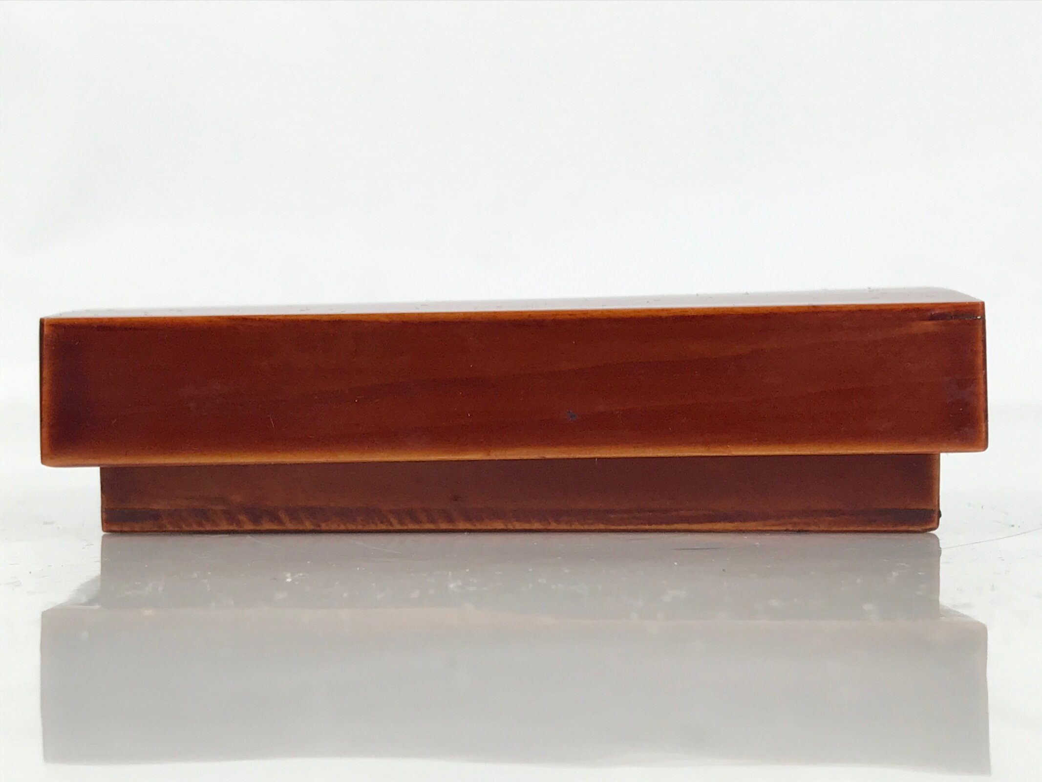 This is a Japanese vintage toothpick holder, or yojiire. It is a small, Shunkei-nuri lacquered and lidded wood box in a caramel brown color. It can hold toothpicks, kashikiri (small cutting utensils for tea ceremony wagashi), small trinkets, etc.