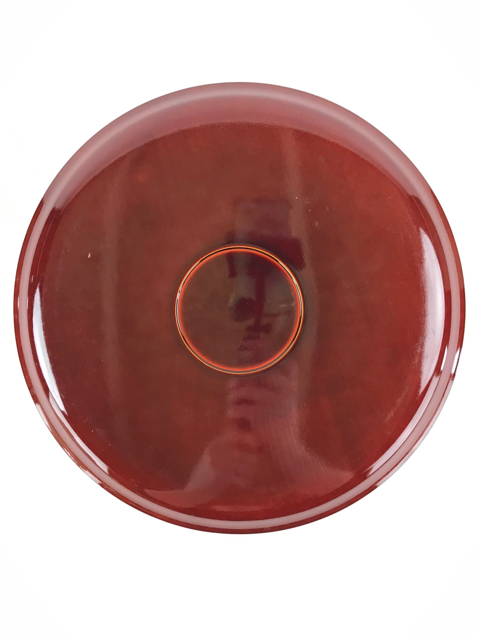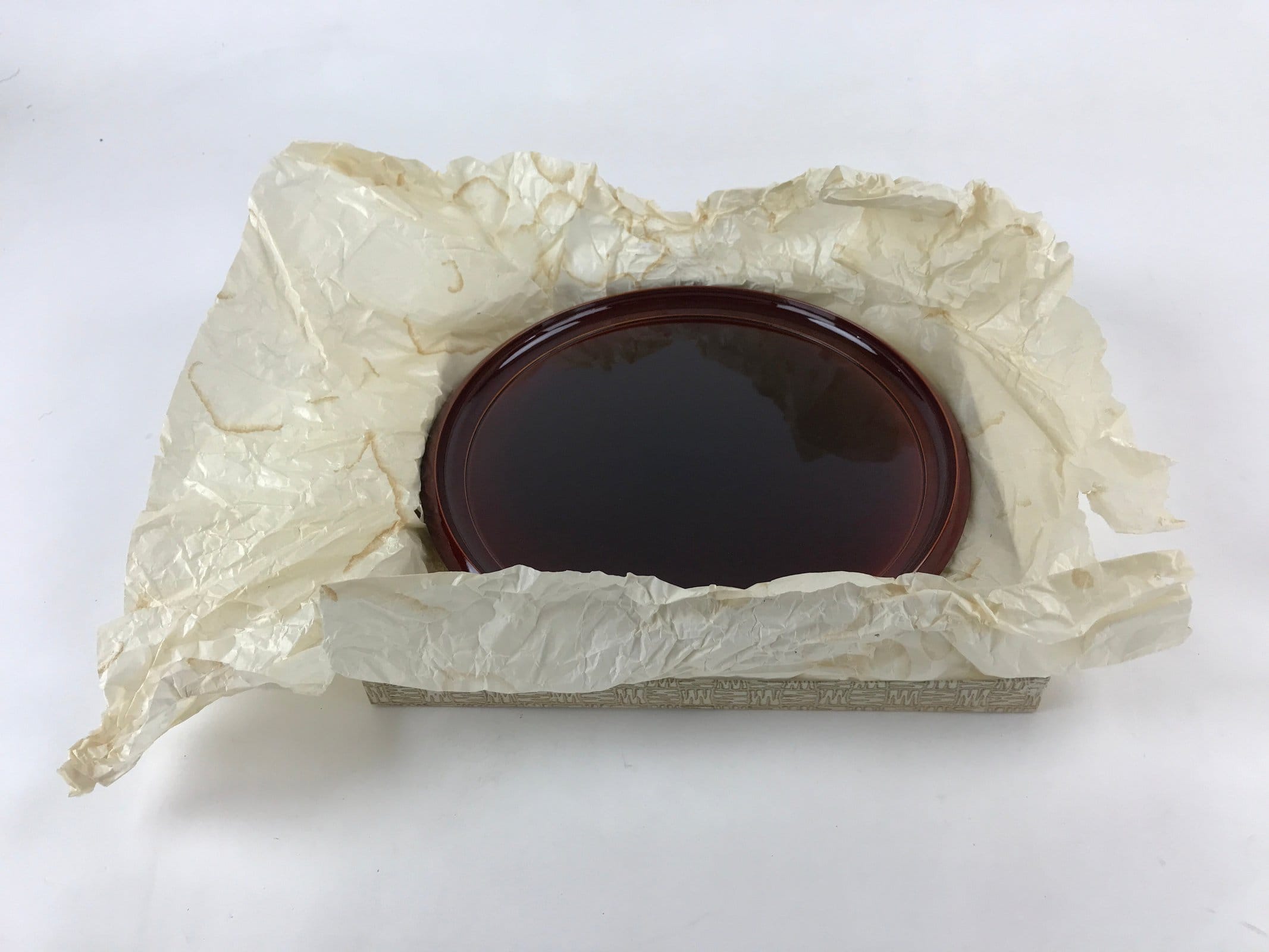This is a Japanese vintage lacquered wooden tray, or Obon, typically used for serving drinks and or snacks to guests in one’s home, business, etc. A glossy chocolate brown in Hida Shunkei style with lovely wood grain on display, this sturdy round tray provides both function and beautiful decor. The original box is included.