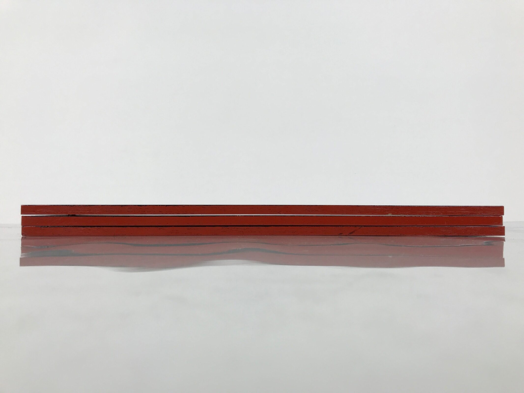Used for the display of flower vases, ikebana arrangements, bonsai, and more, this multi-piece, arrangeable rectangular display stand is handcrafted from a piece of solid wood. It is coated in a glossy black lacquer on one side while all other sides are a reddish orange color. It has no extra embellishments or design, so it is an excellent choice for simple and traditional arrangements.