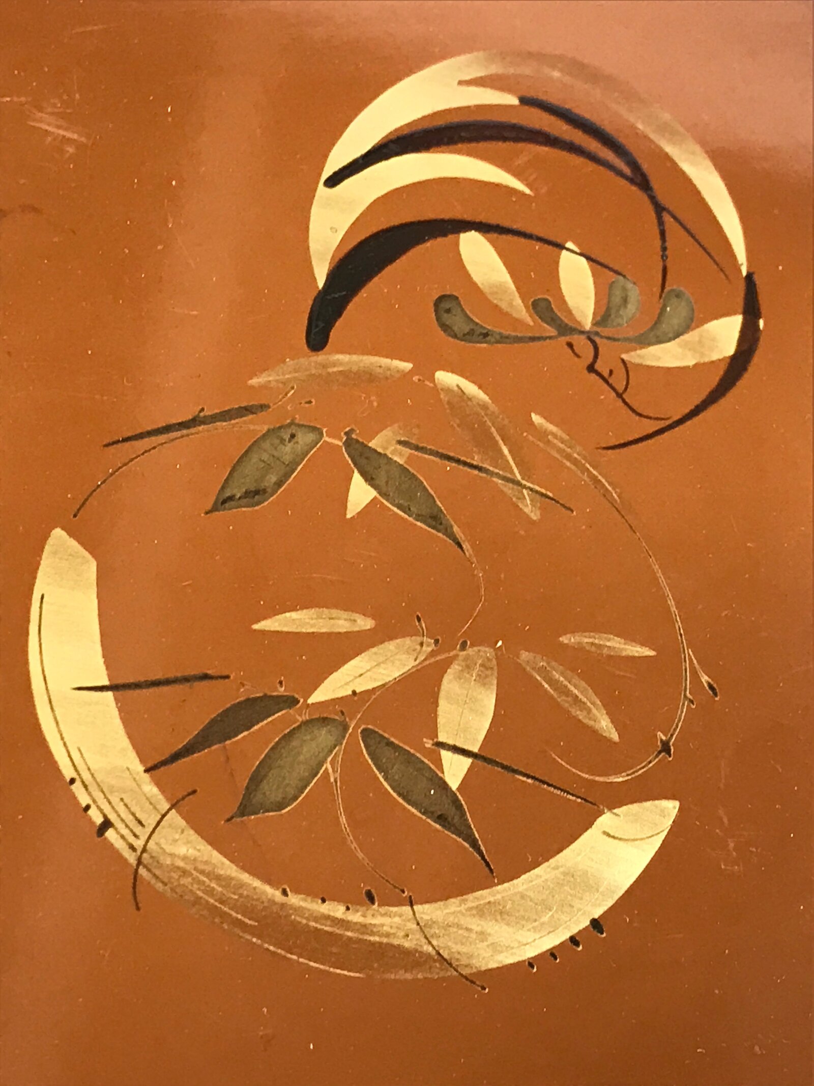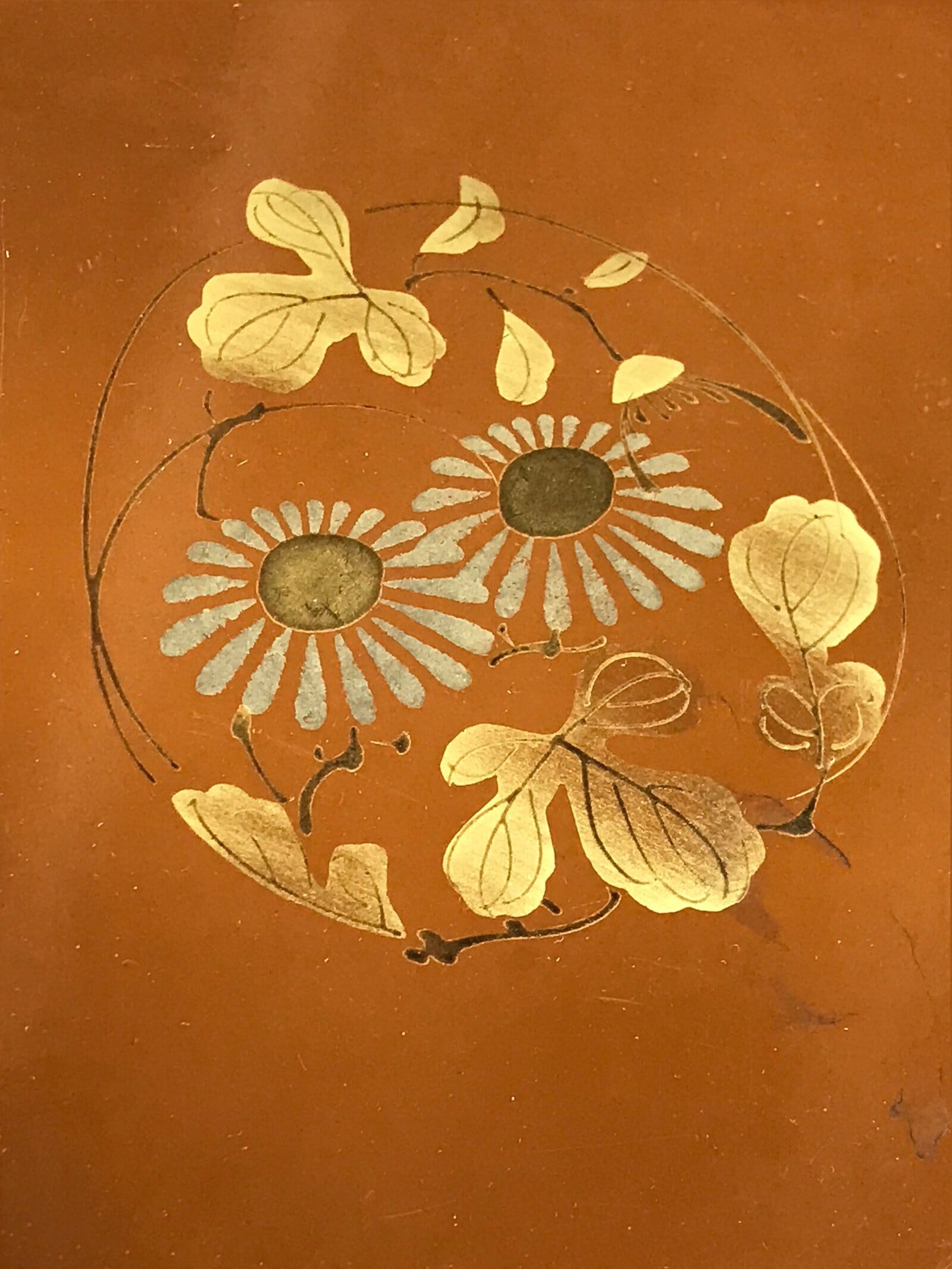 The gold plant and flower designs are called maki-e, a decorative painting technique done by sprinkling gold powder onto wet lacquer before it hardens.