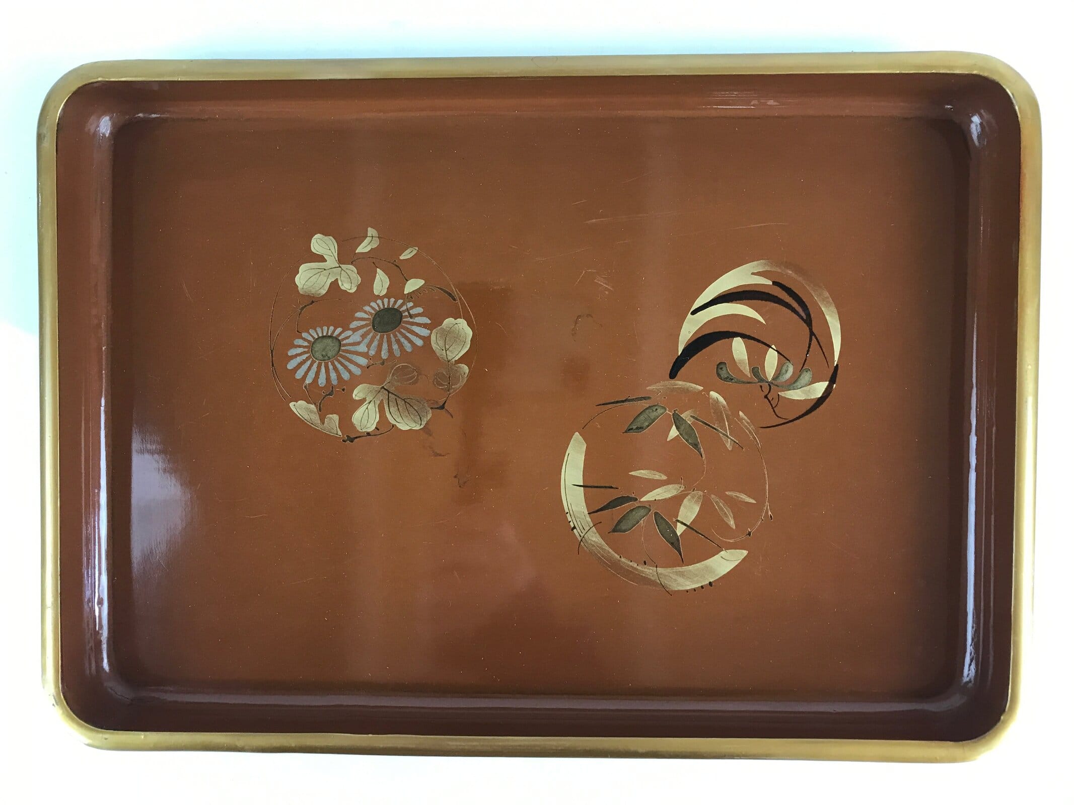 January 20, 2026Japanese Wooden Lacquered Serving Tray Obon Vtg Floral Maki-e Brown Black UR847