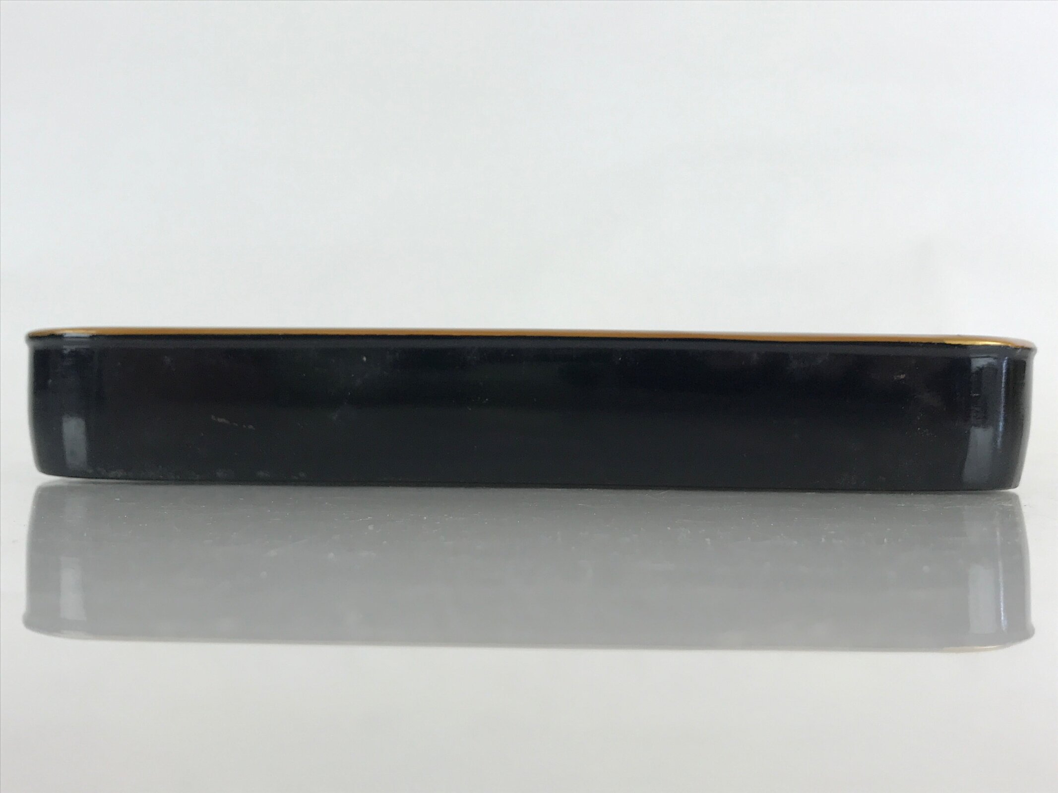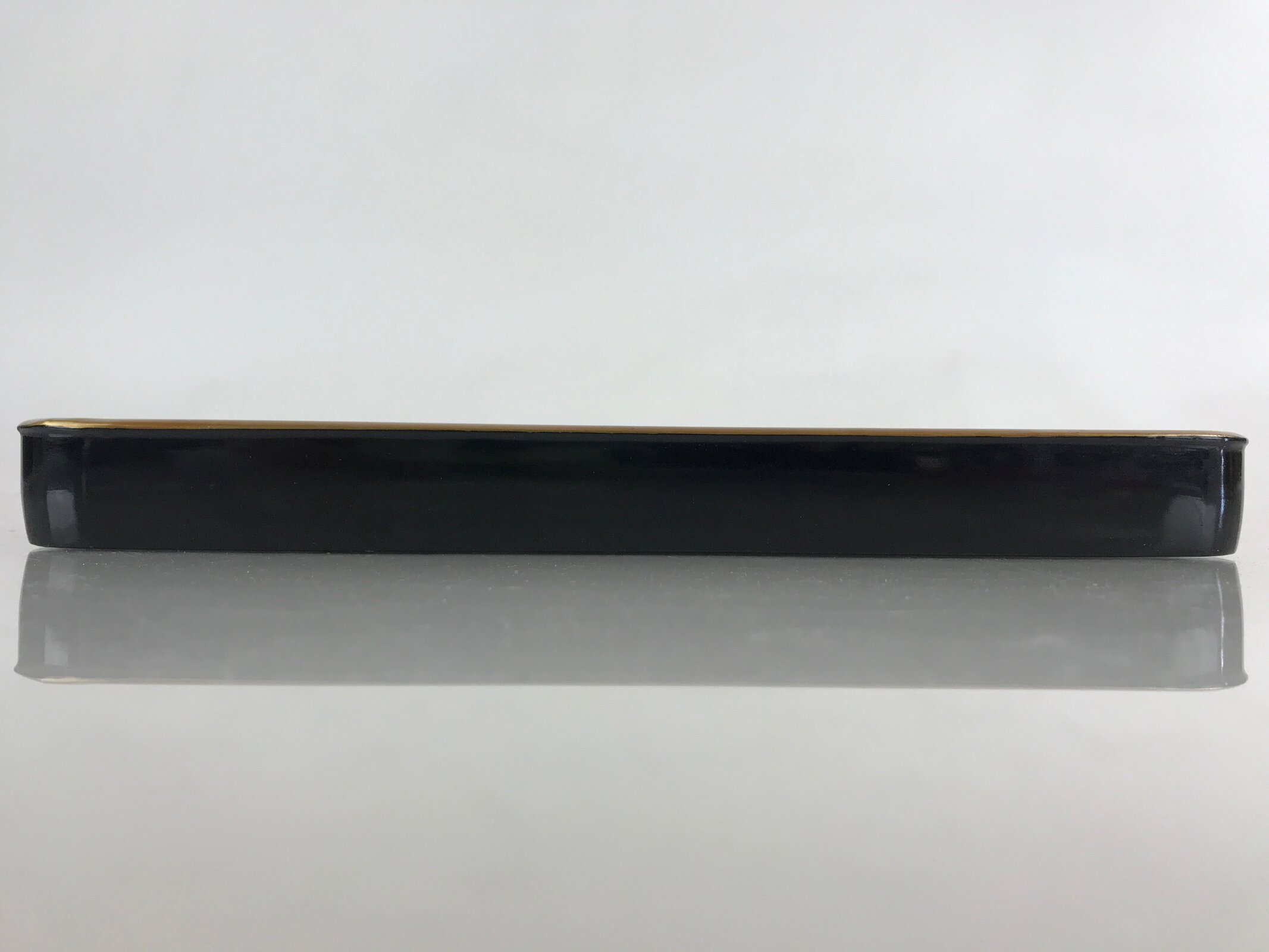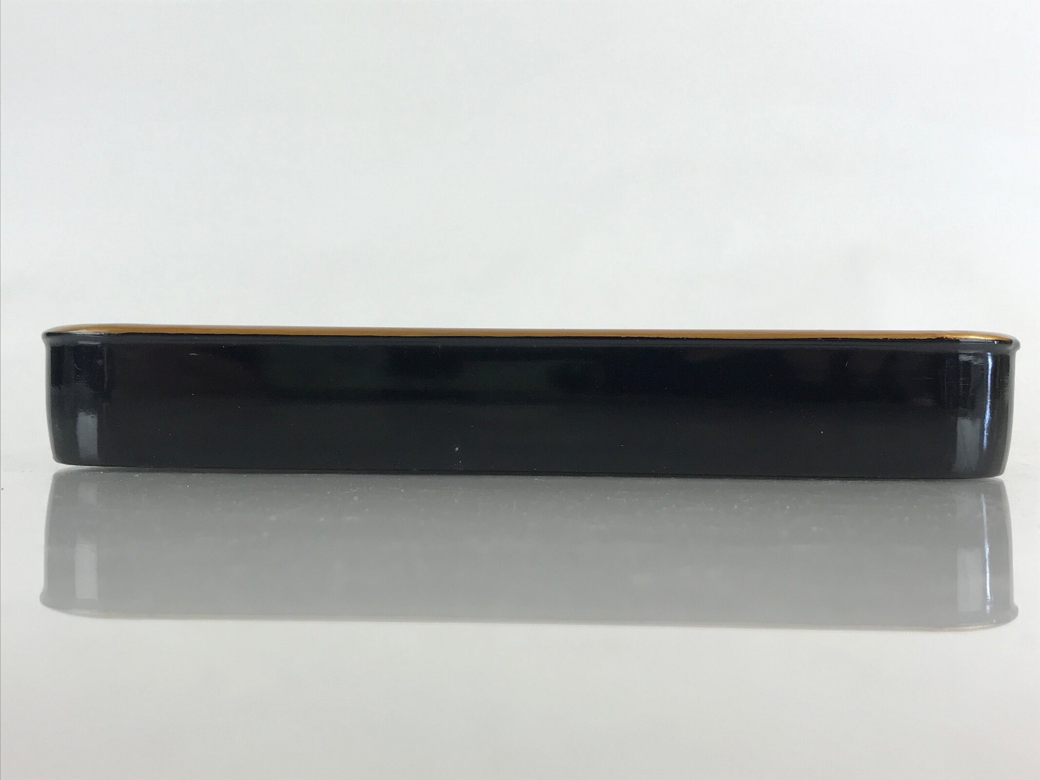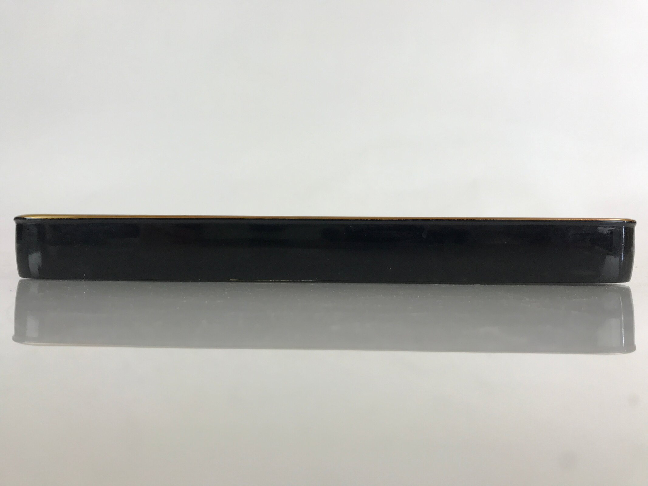 This is a Japanese vintage wooden lacquered tray, or Obon, typically used for serving drinks and snacks to guests in one’s home, business, etc. Black outside, caramel brown inside, and a gold rim, this sturdy rectangular tray provides both function and beautiful decor.
