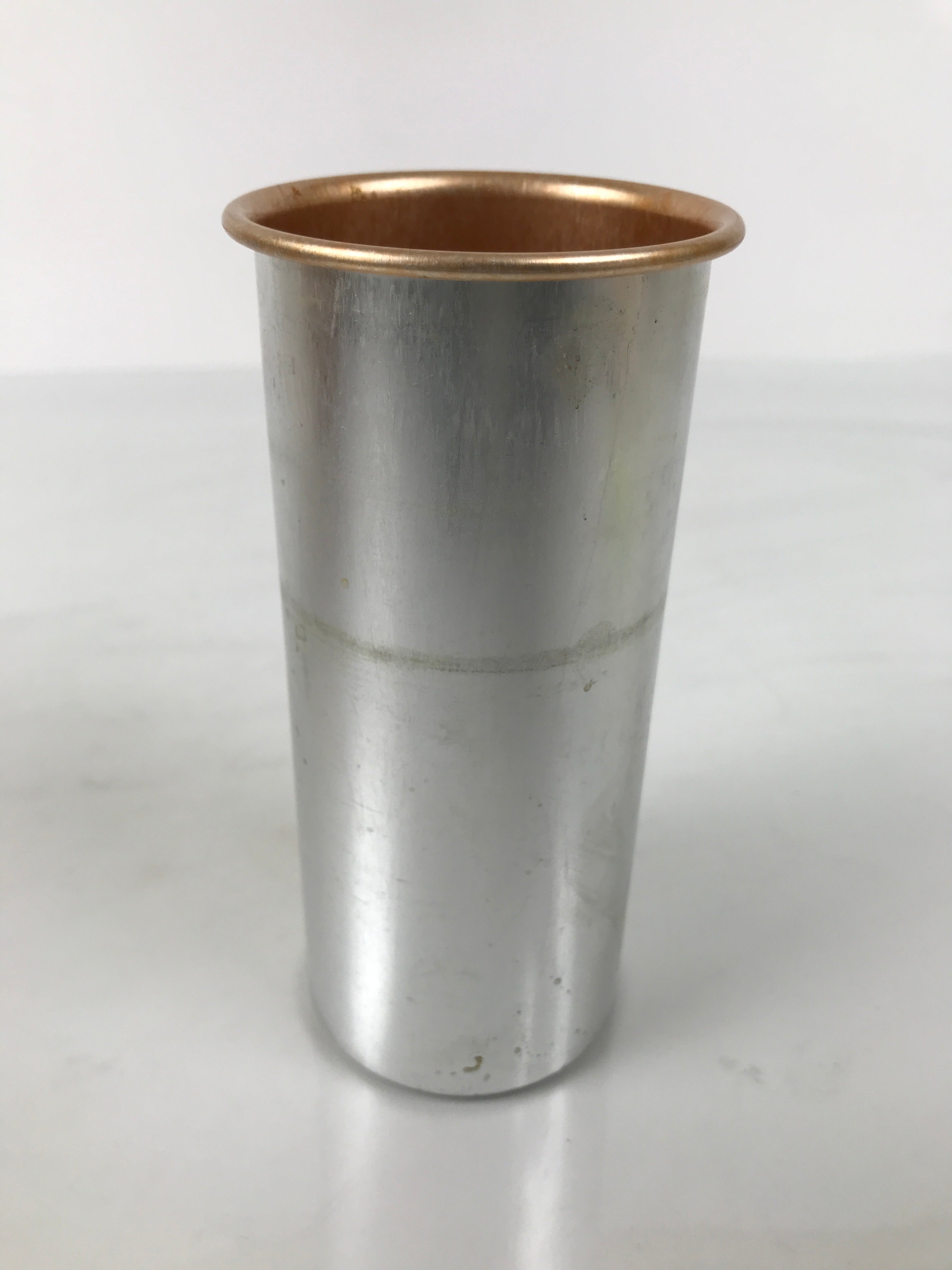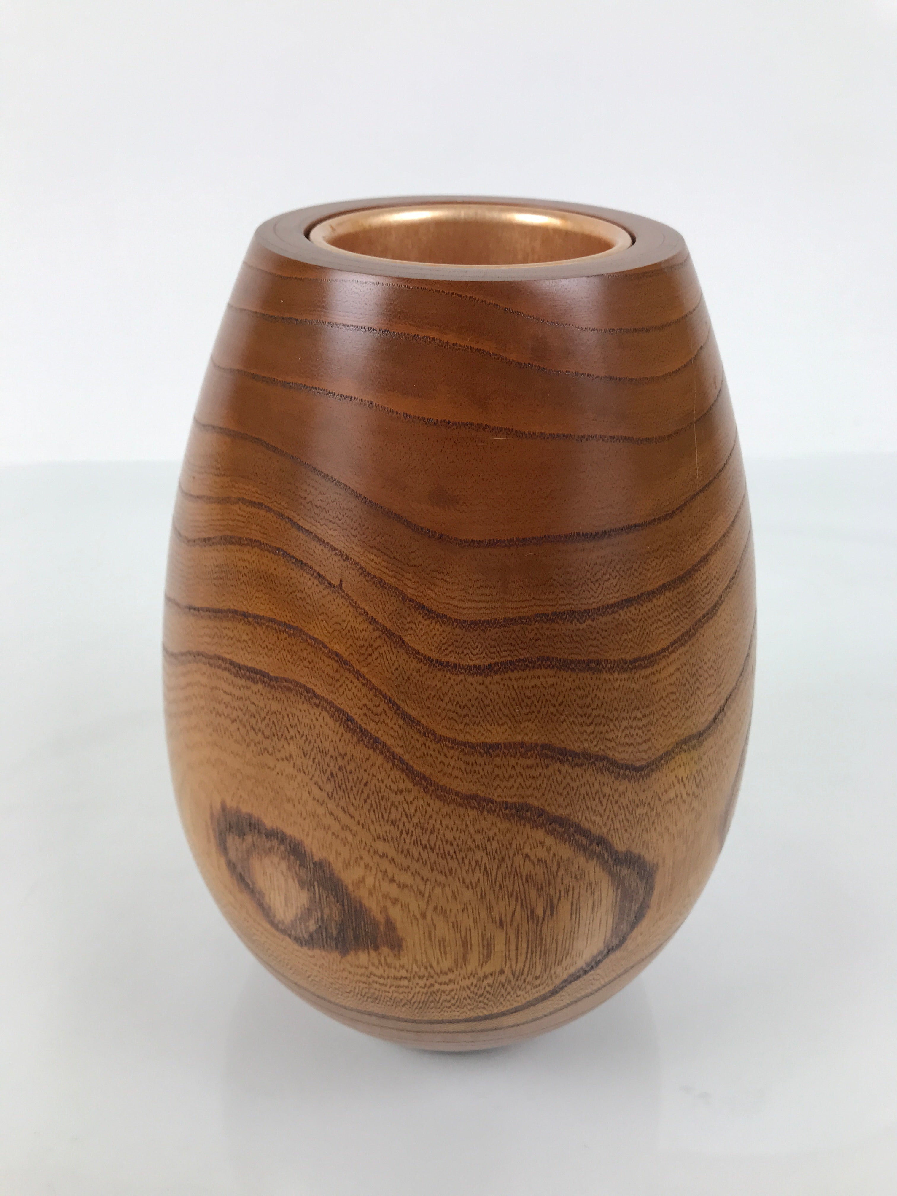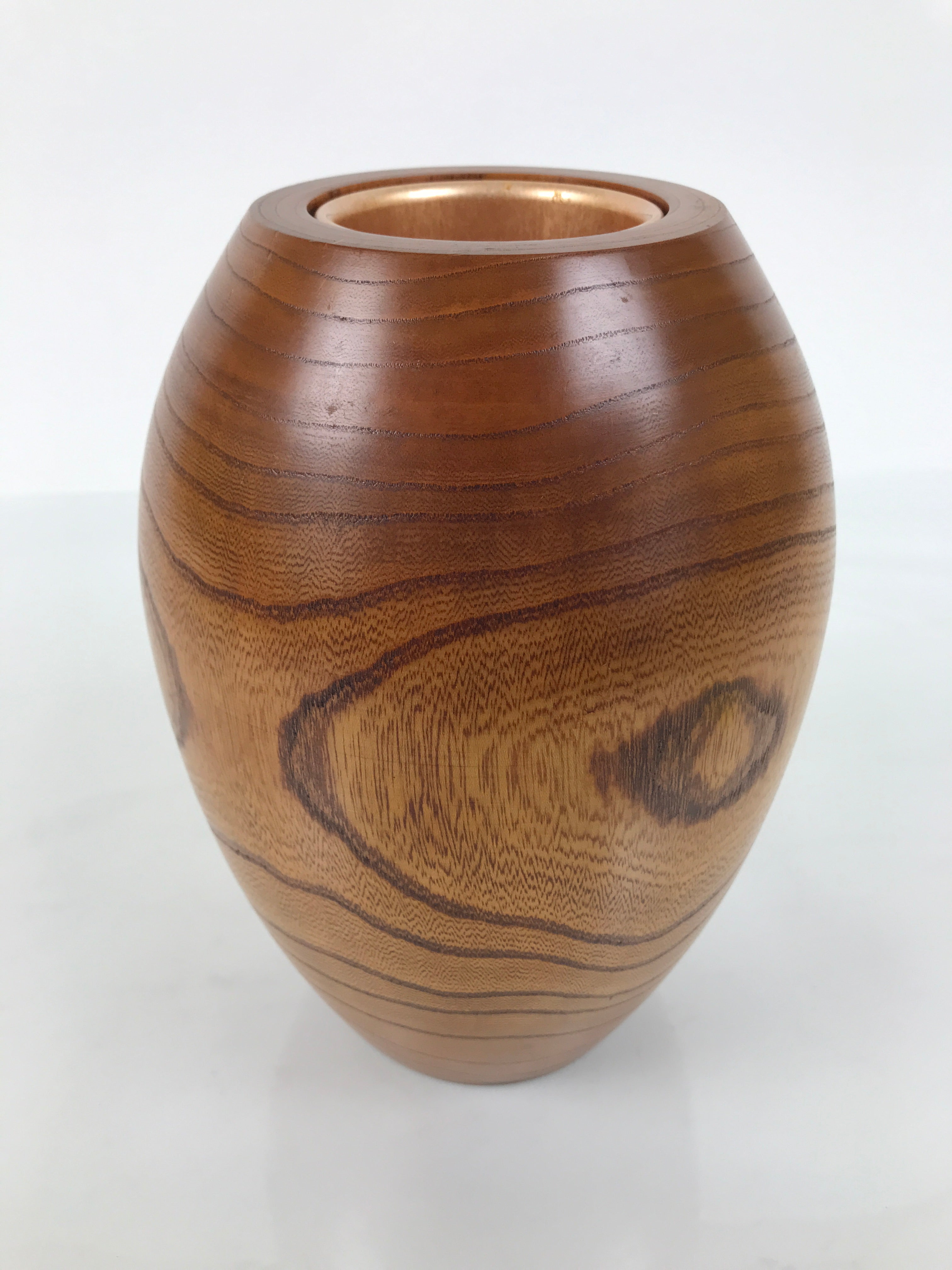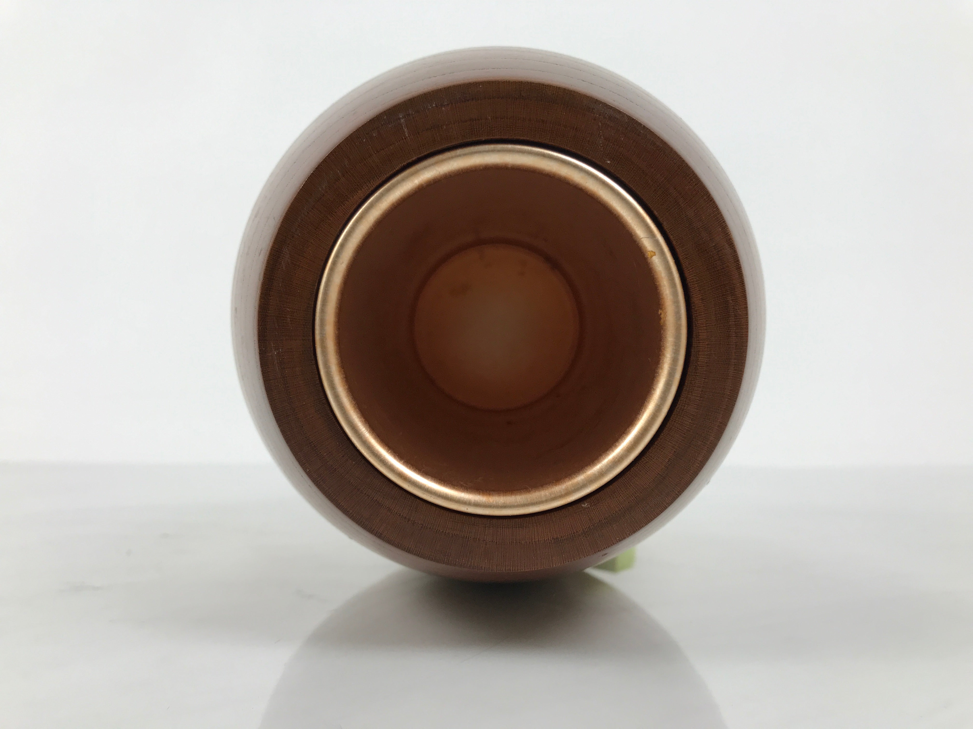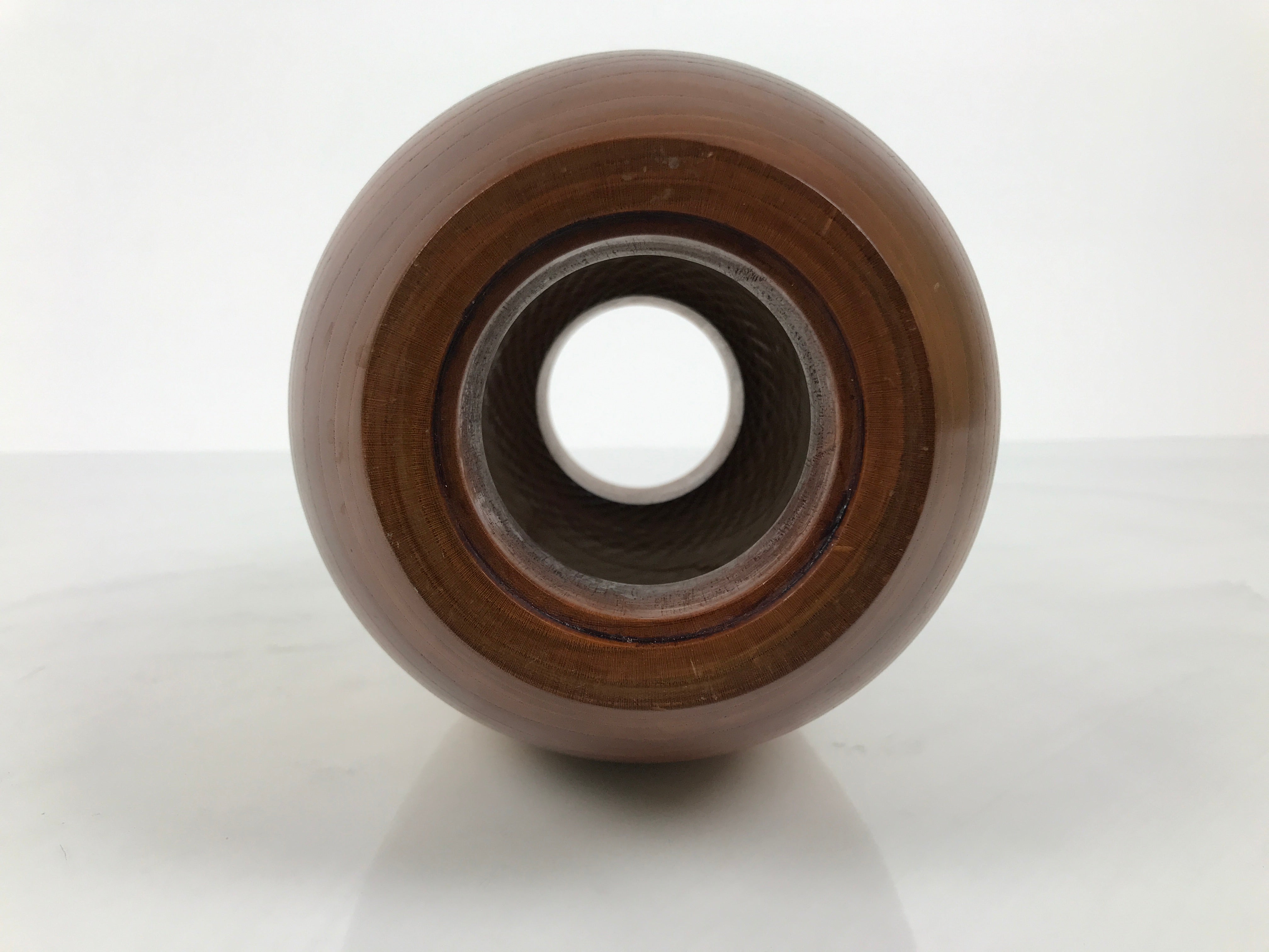 This is a vintage Japanese lacquered wooden flower vase, or kabin. The vase is made of wood and has a thin copper metal insert to keep the inside of the vase safe from moisture. The metal insert can be set on both sides of the vase, so it is reversible and can be used with a wider bottom or a wider top. The body features a bold wood grain.