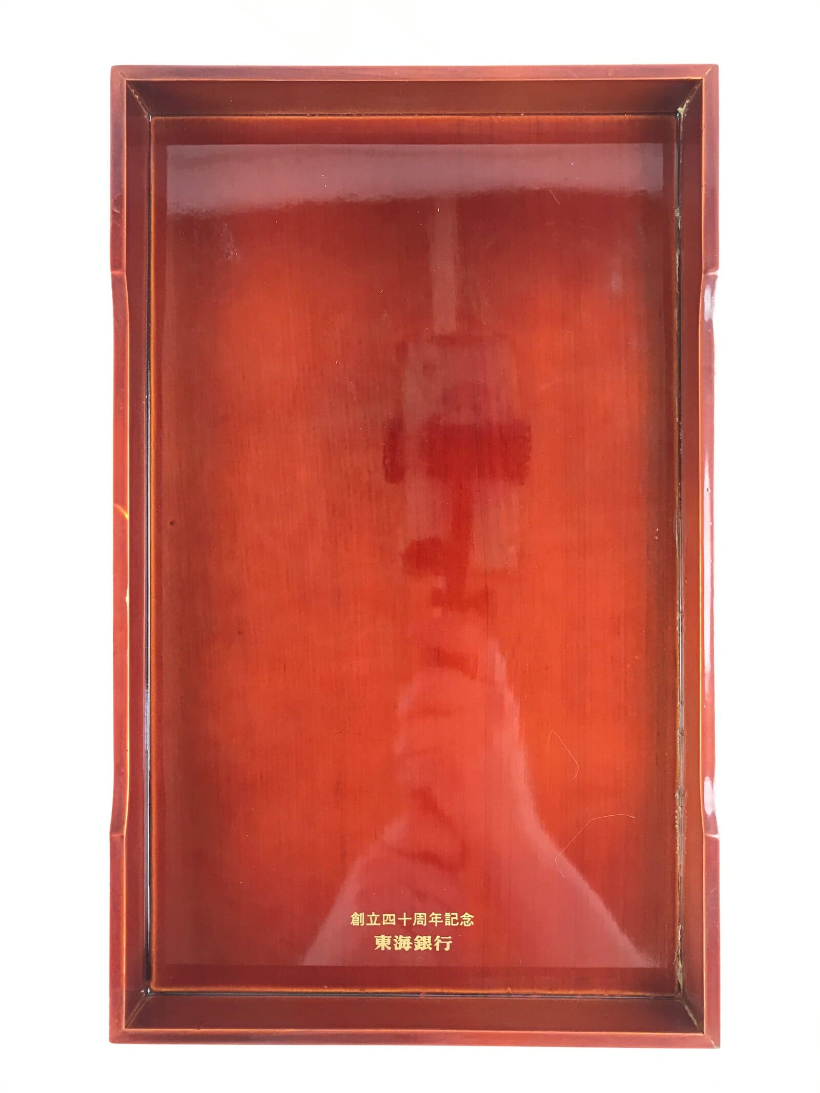 This is a Japanese lacquered wooden letter box (Fumibako). It is traditionally used to store letters and important documents. This particular box has a divider that enables storing efficiently stationary items such as pens. The box features a simple lined design on the lid along with some inscriptions in Japanese. The inscriptions inside the box say “celebration of the 40th anniversary of the establishment of the Tokai Bank”. This classic brown shunkei-nuri lacquer piece is a beautiful decorative and functional addition to any home or office space.