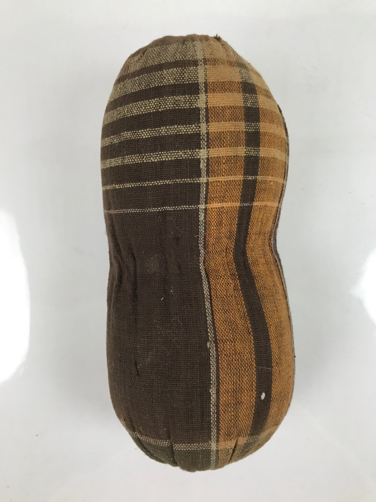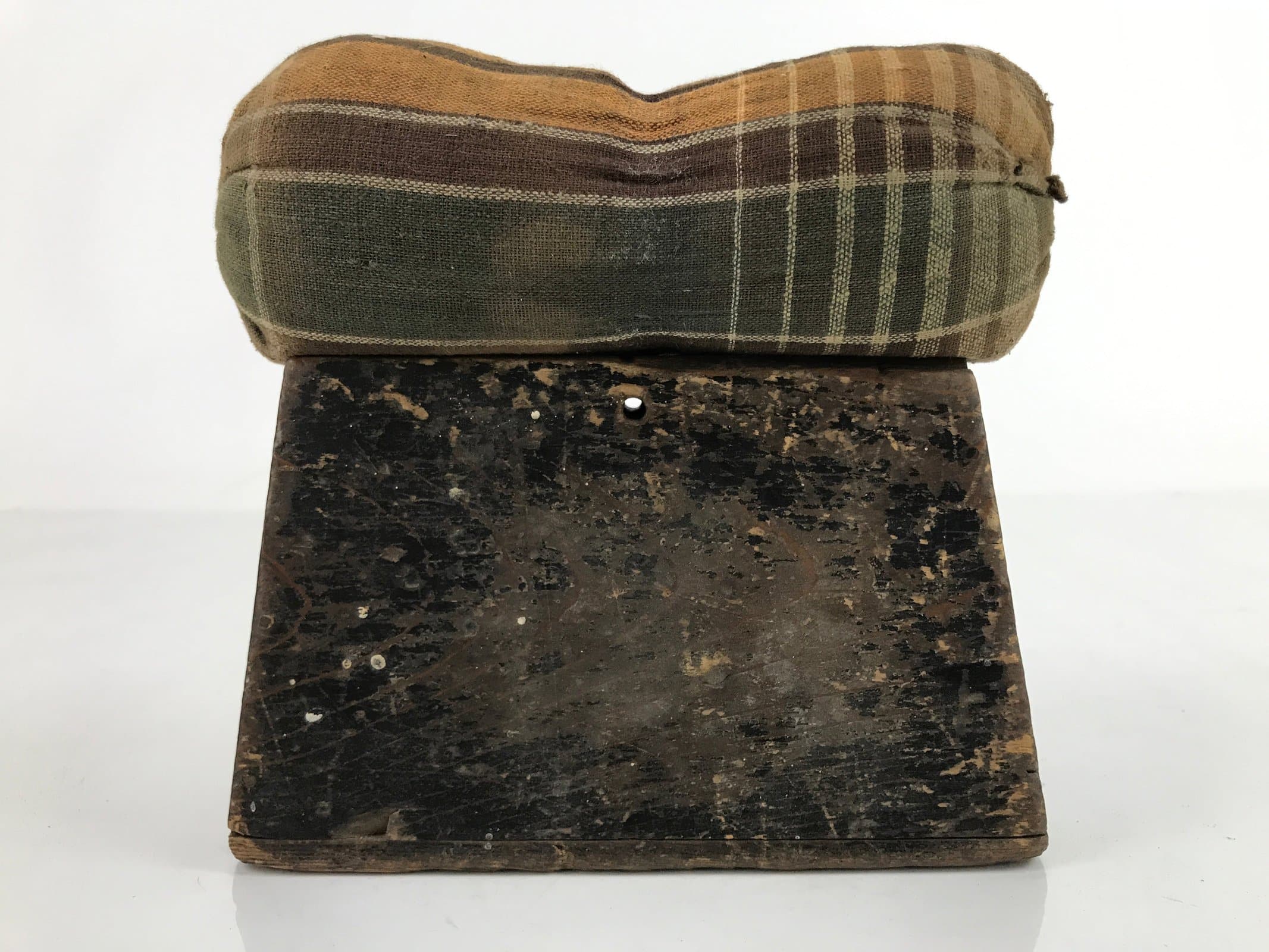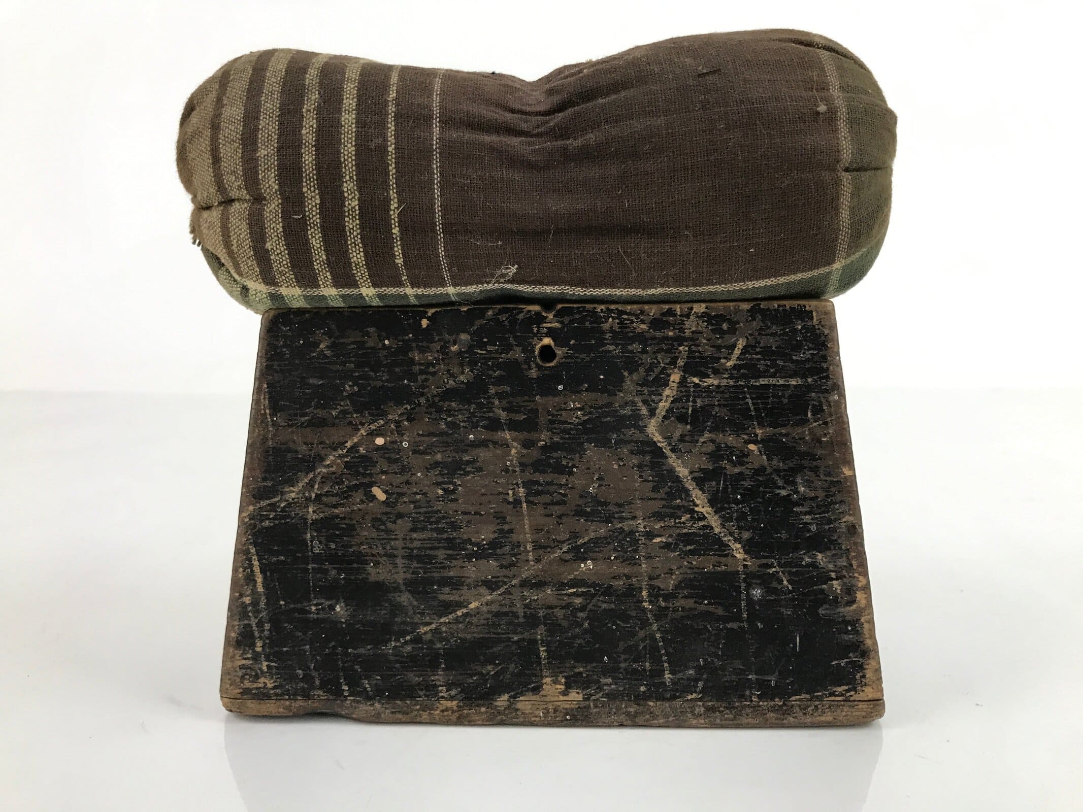 This is an antique Japanese neck rest or pillow called takamakura. This neck rest consists of a very simple brushed lacquer wood base. The pillow is made of a brown and orange plaid fabric (replacement). The pillow is likely stuffed with dried rice hulls/husks, as it was a common stuffing material at the time.