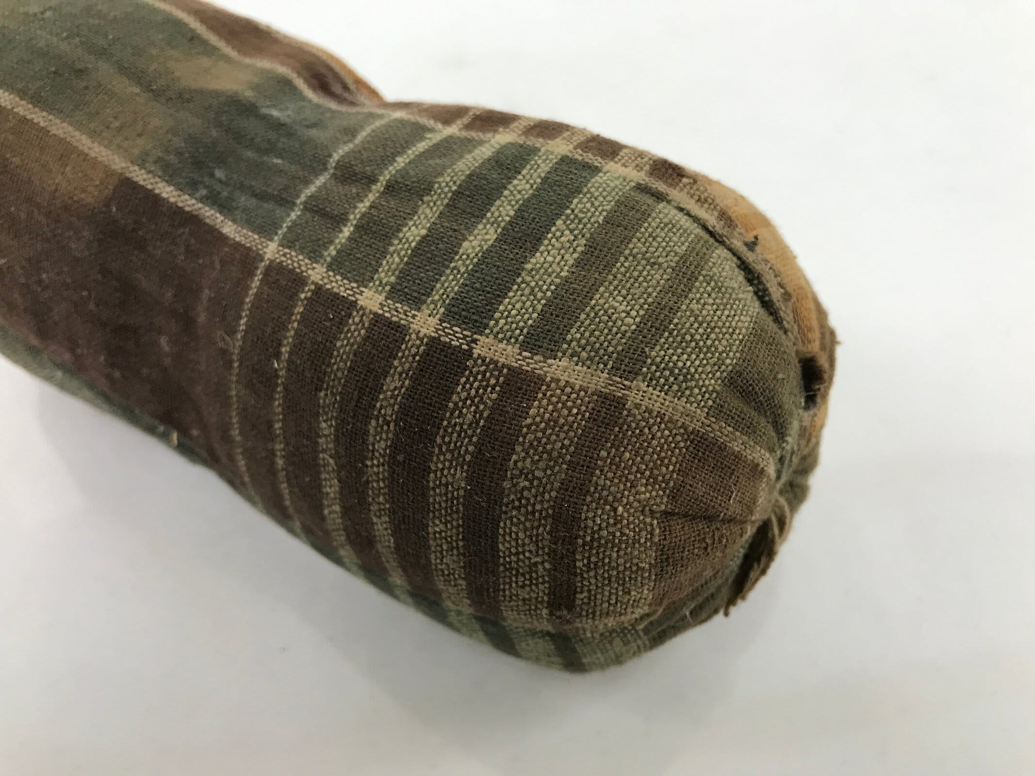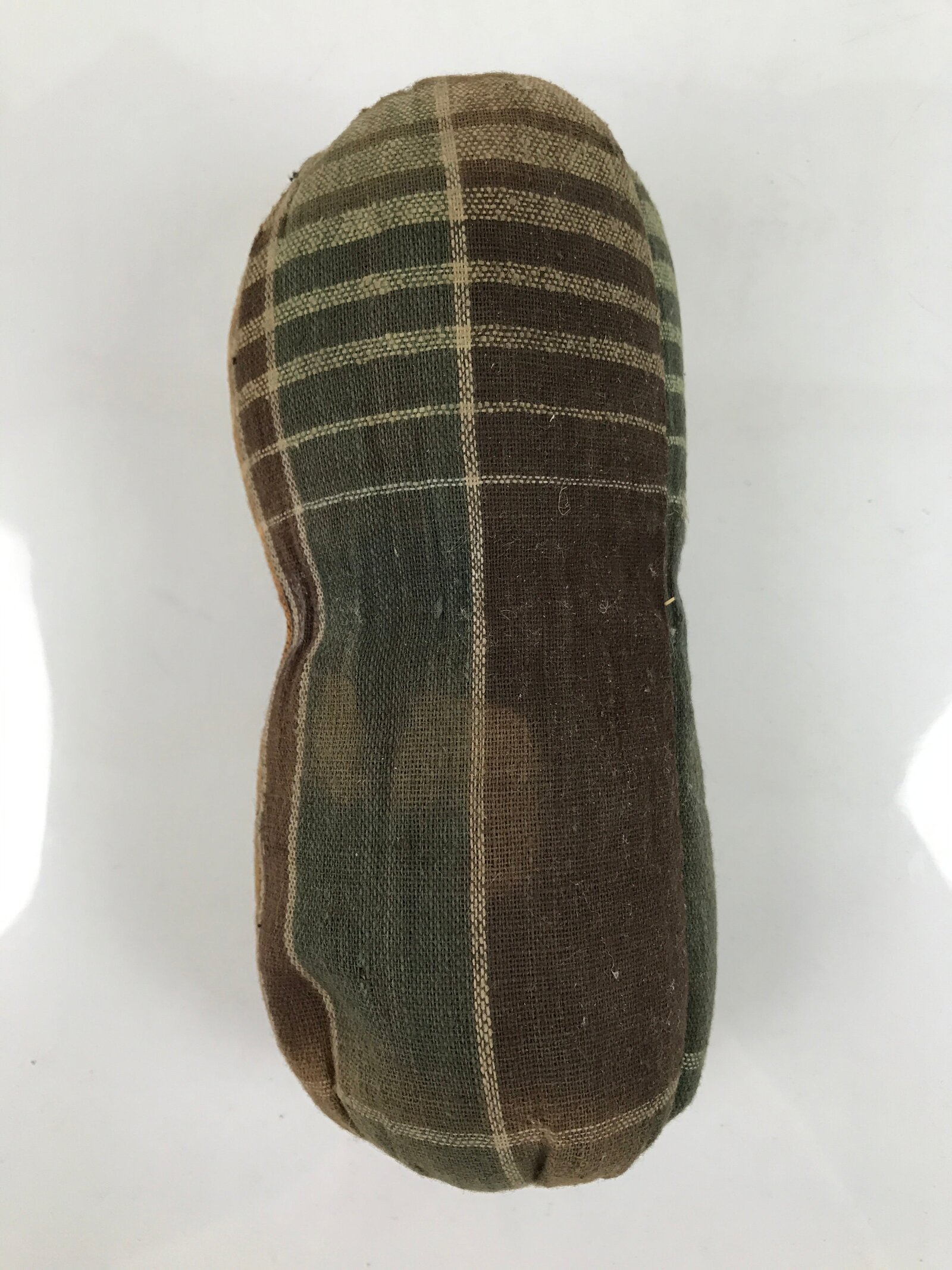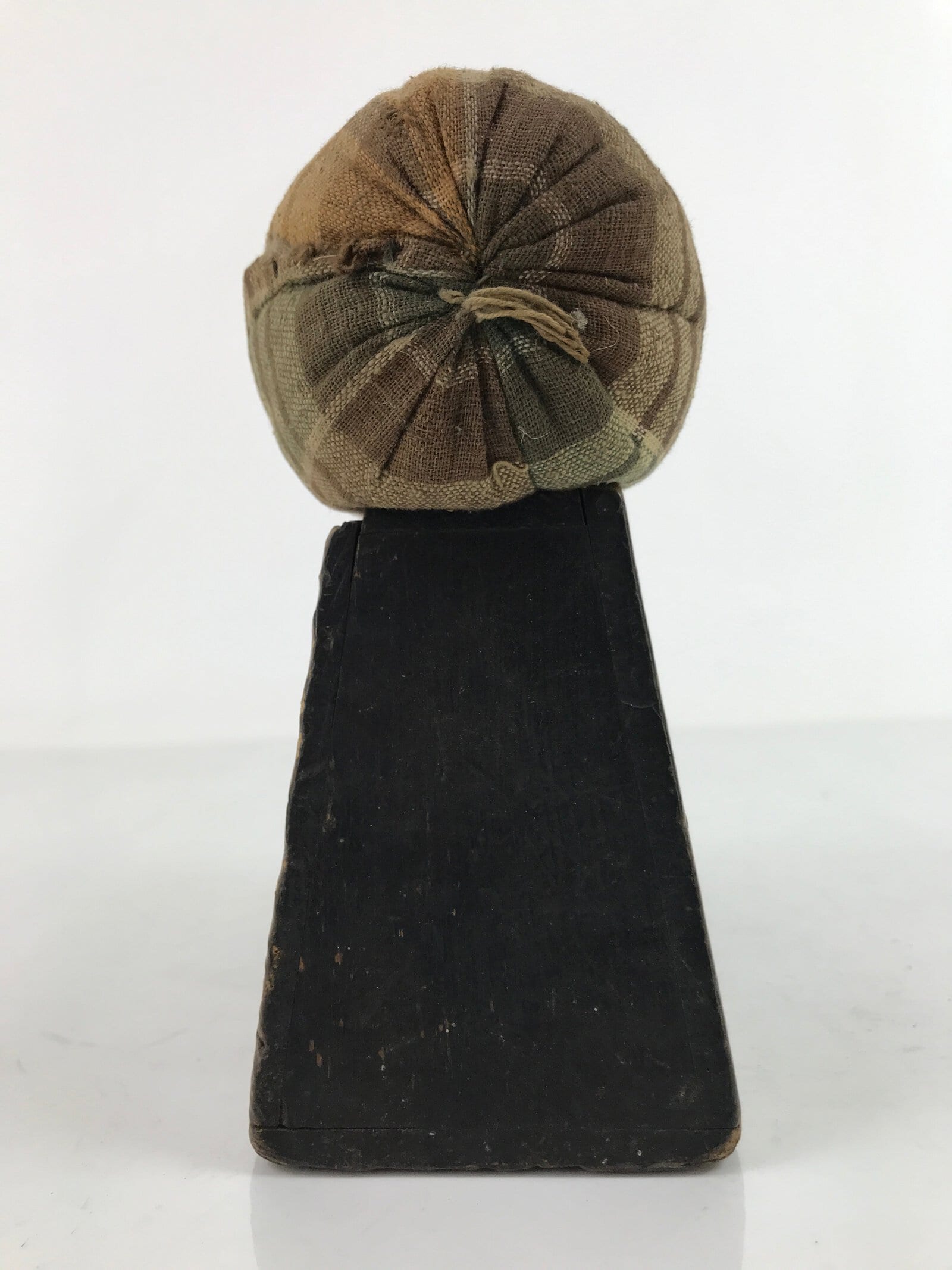 This is an antique Japanese neck rest or pillow called takamakura. This neck rest consists of a very simple brushed lacquer wood base. The pillow is made of a brown and orange plaid fabric (replacement). The pillow is likely stuffed with dried rice hulls/husks, as it was a common stuffing material at the time.